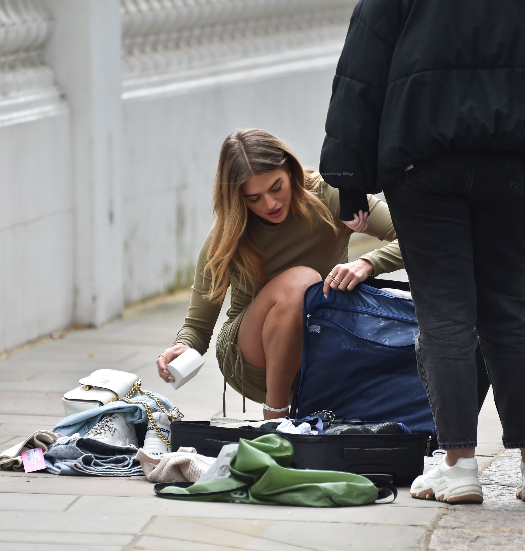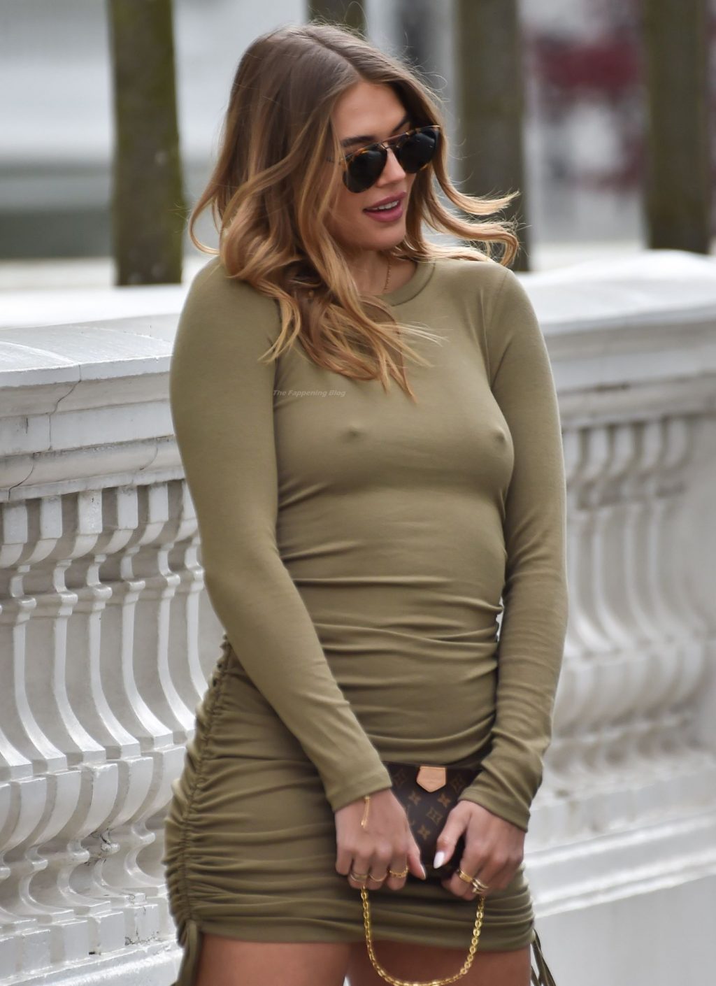 Arabella Chi è vista senza reggiseno mentre modella abiti durante un servizio fotografico a Londra, 13/04/2021. Arabella è stata vista con un mini abito da cocktail verde e tacchi alti e poco altro per le strade di Londra.