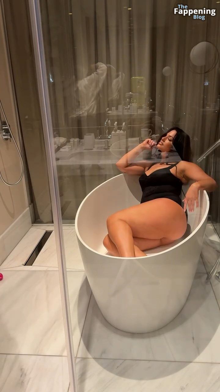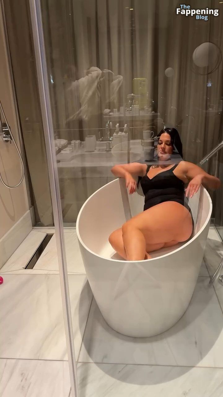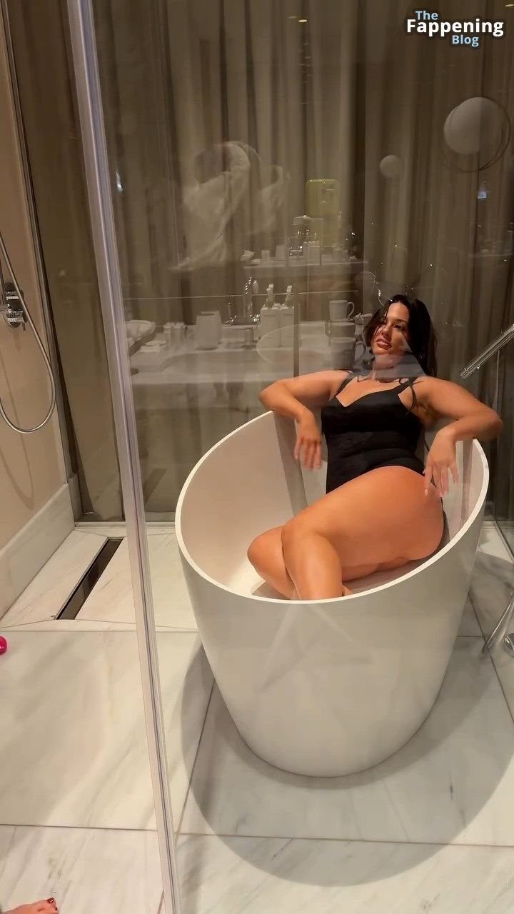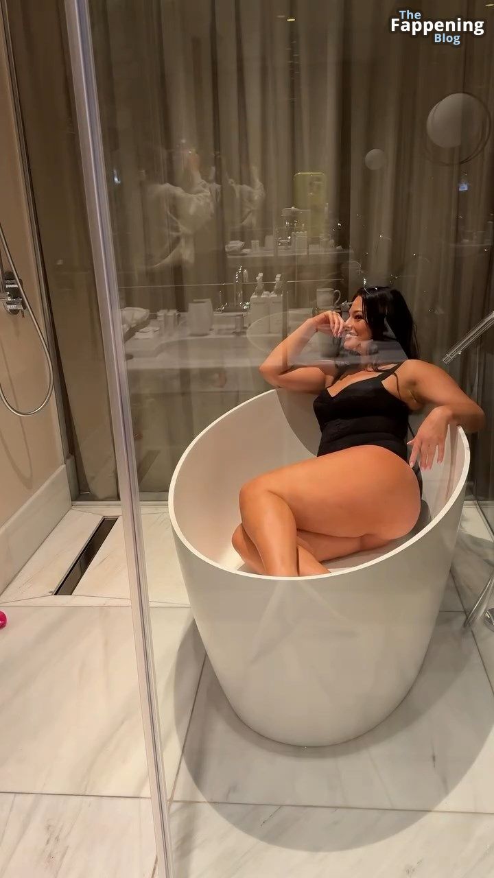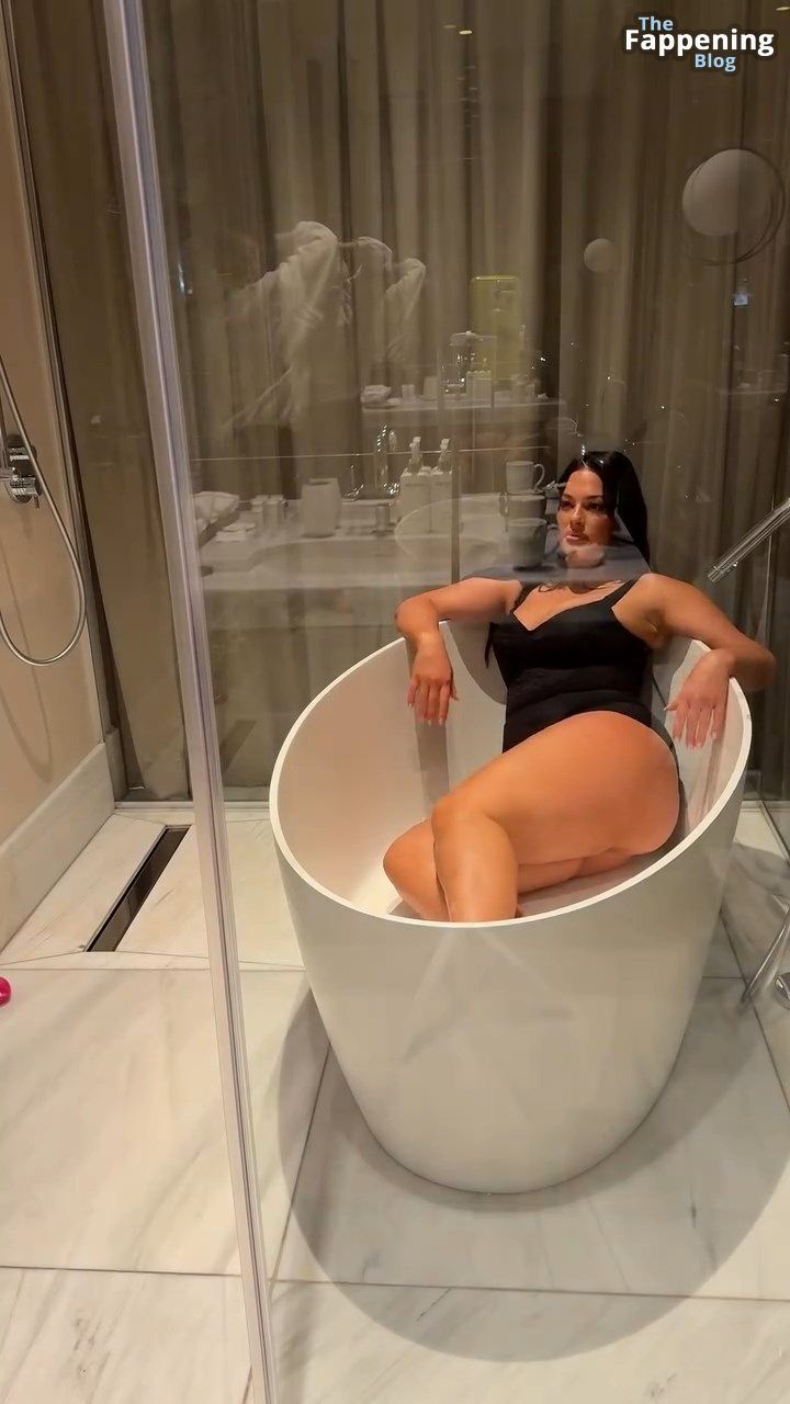In queste foto, la modella indossa un body nero molto audace, mettendo in mostra il suo sedere succoso e dei tacchi a spillo chic proprio in bagno. Non si trattiene, sfoggiando il suo grande lato B e il suo seno senza vergogna. In uno scatto la si vede salire nella vasca da bagno con un sorriso, mostrando accidentalmente il seno mentre si gode chiaramente ogni momento. Altre foto mostrano Ashley che si rilassa nella vasca con sicurezza, come una vera regina.