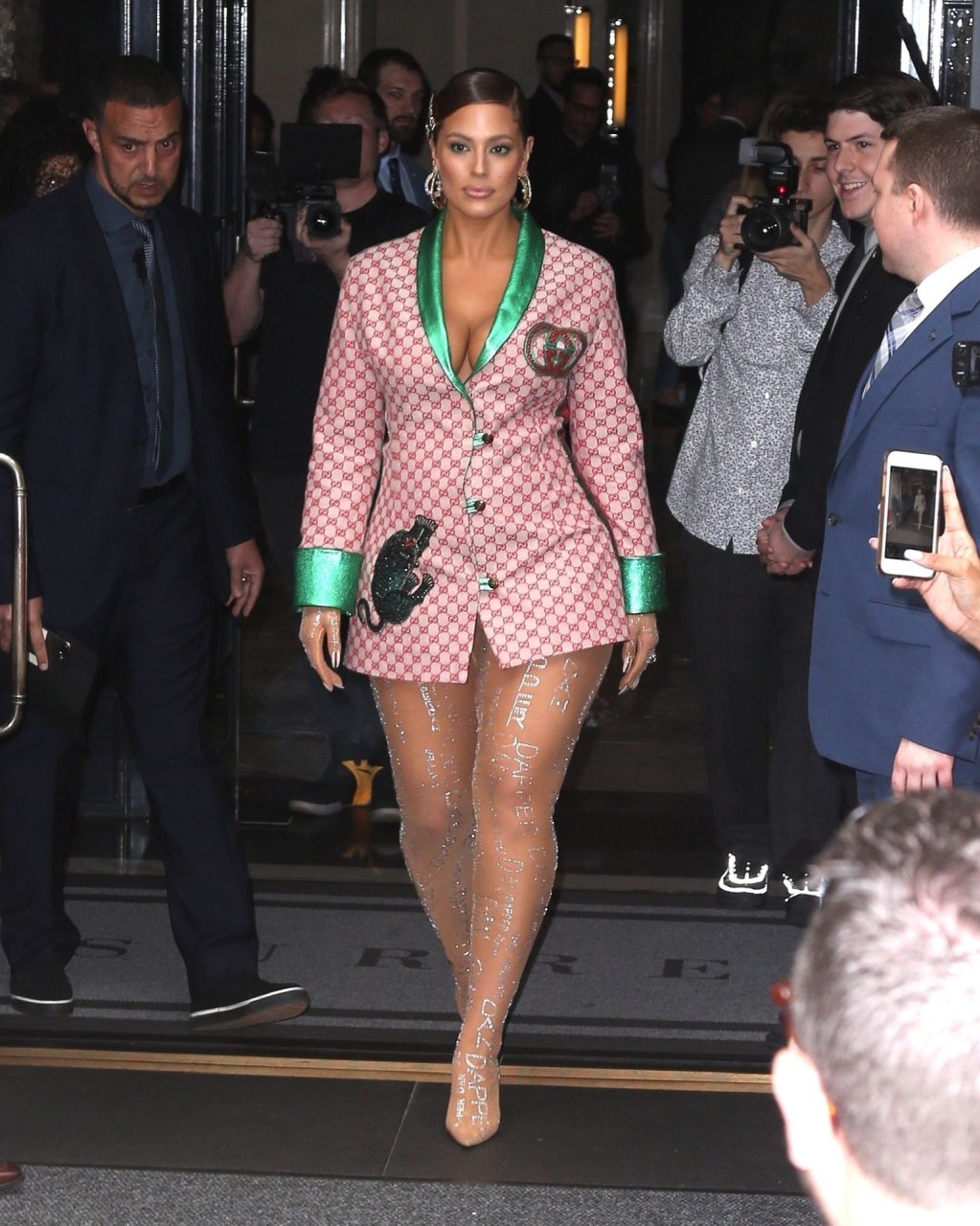 La modella americana plus-size di 31 anni ha scelto un blazer con dettagli in raso e righe. Ha aggiunto collant con strass e molte decorazioni al suo bellissimo outfit.