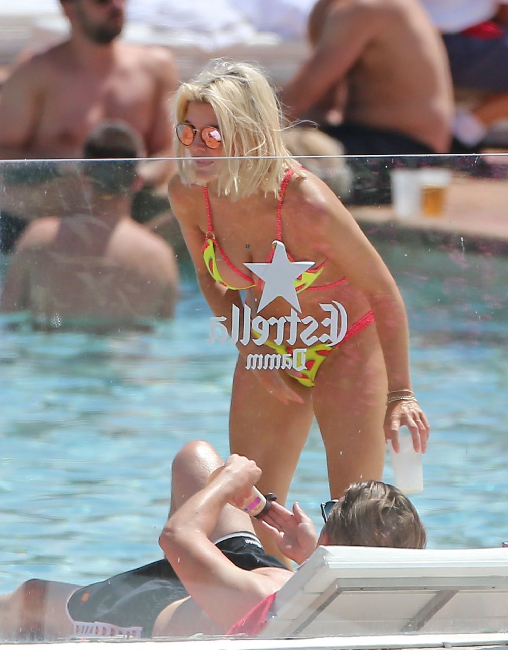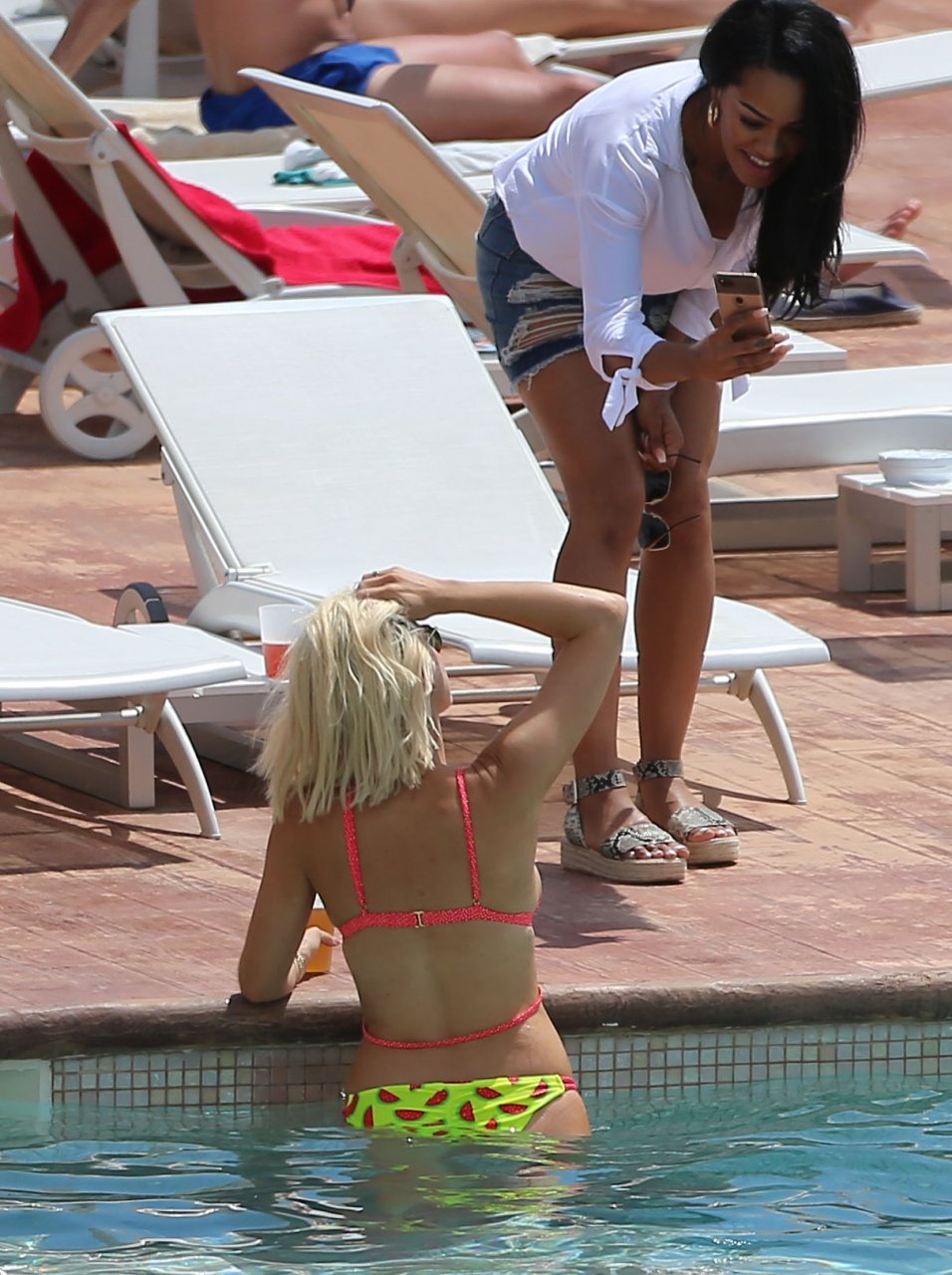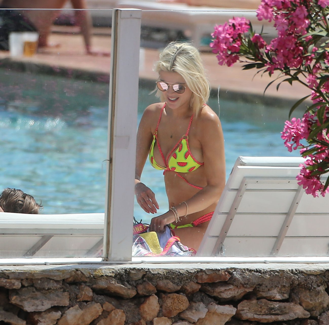 La bionda Ashley James sfoggia il suo corpo da spiaggia con un sexy bikini a stampa anguria durante una vacanza a Ibiza, Spagna, 07/06/2018. La star di Celebrity Big Brother (alias Big Brother VIP) e Made In Chelsea, 31 anni, ha goduto del sole ed è stata vista mentre portava un drink.