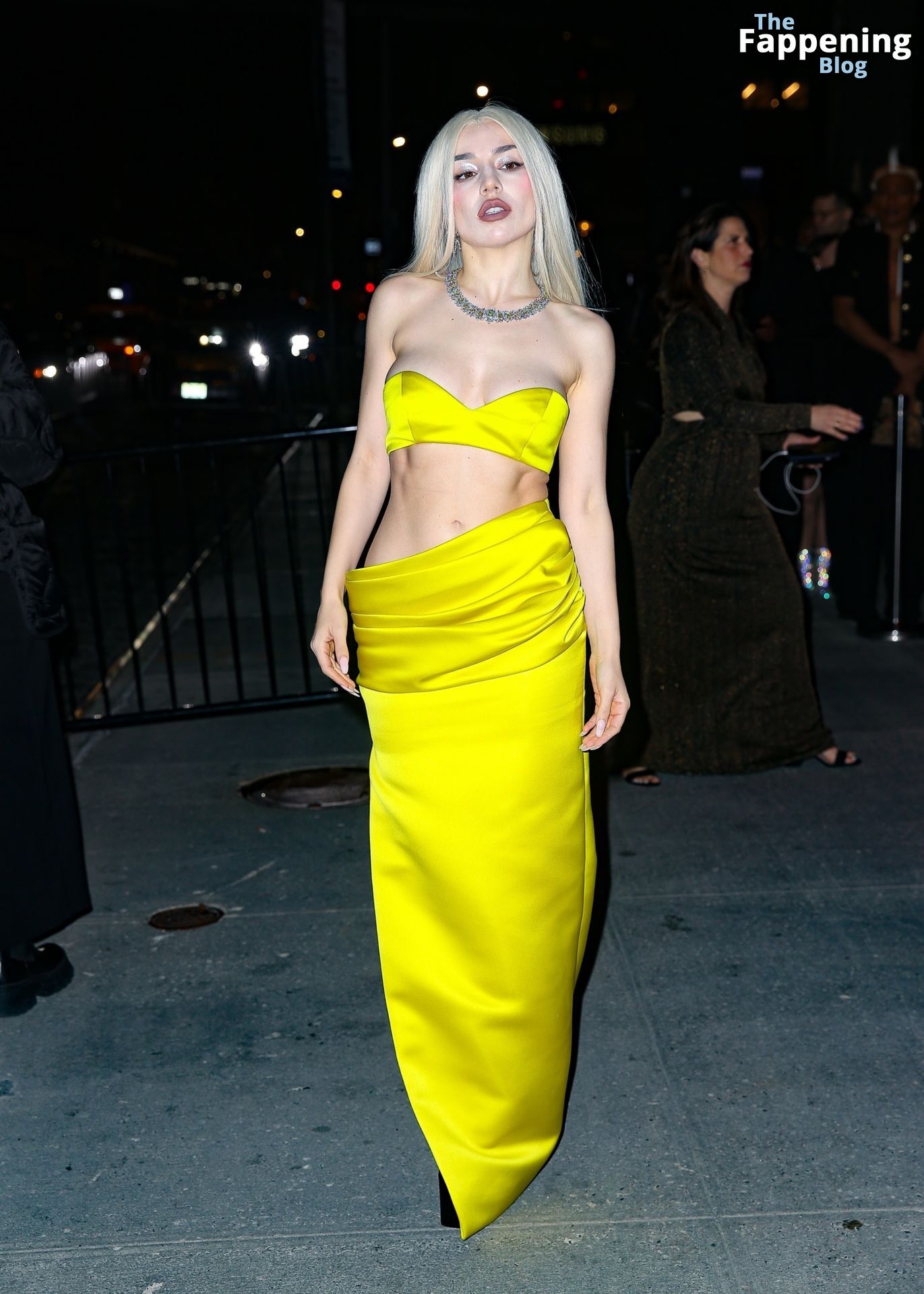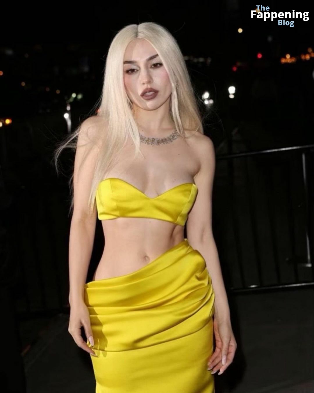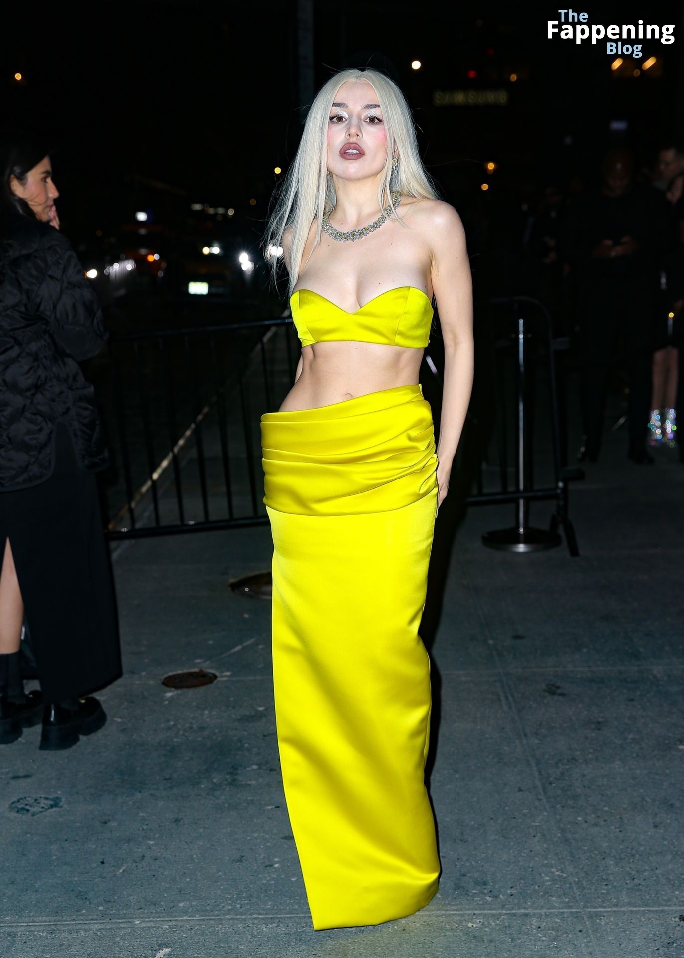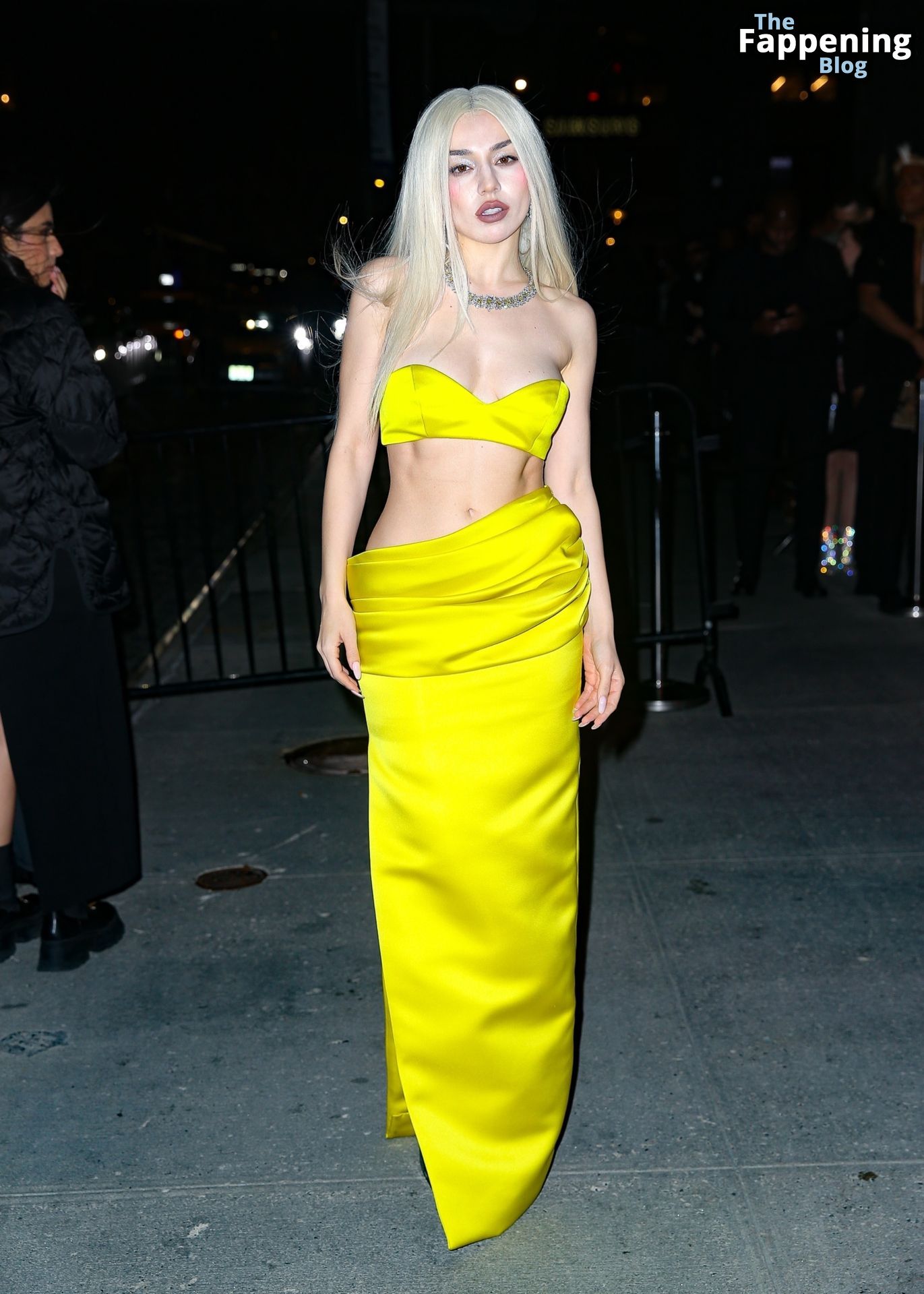 Non sottovalutare la dichiarazione di moda hot di Ava Max: un abito giallo senza reggiseno che mette in mostra tutta la sua bellezza mentre viene vista arrivare a una festa del Met Gala a NYC.