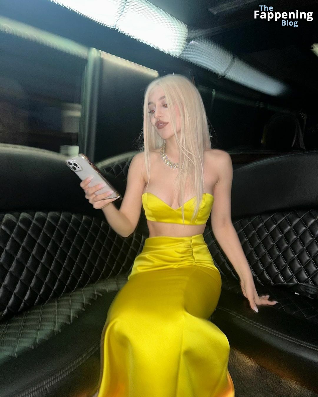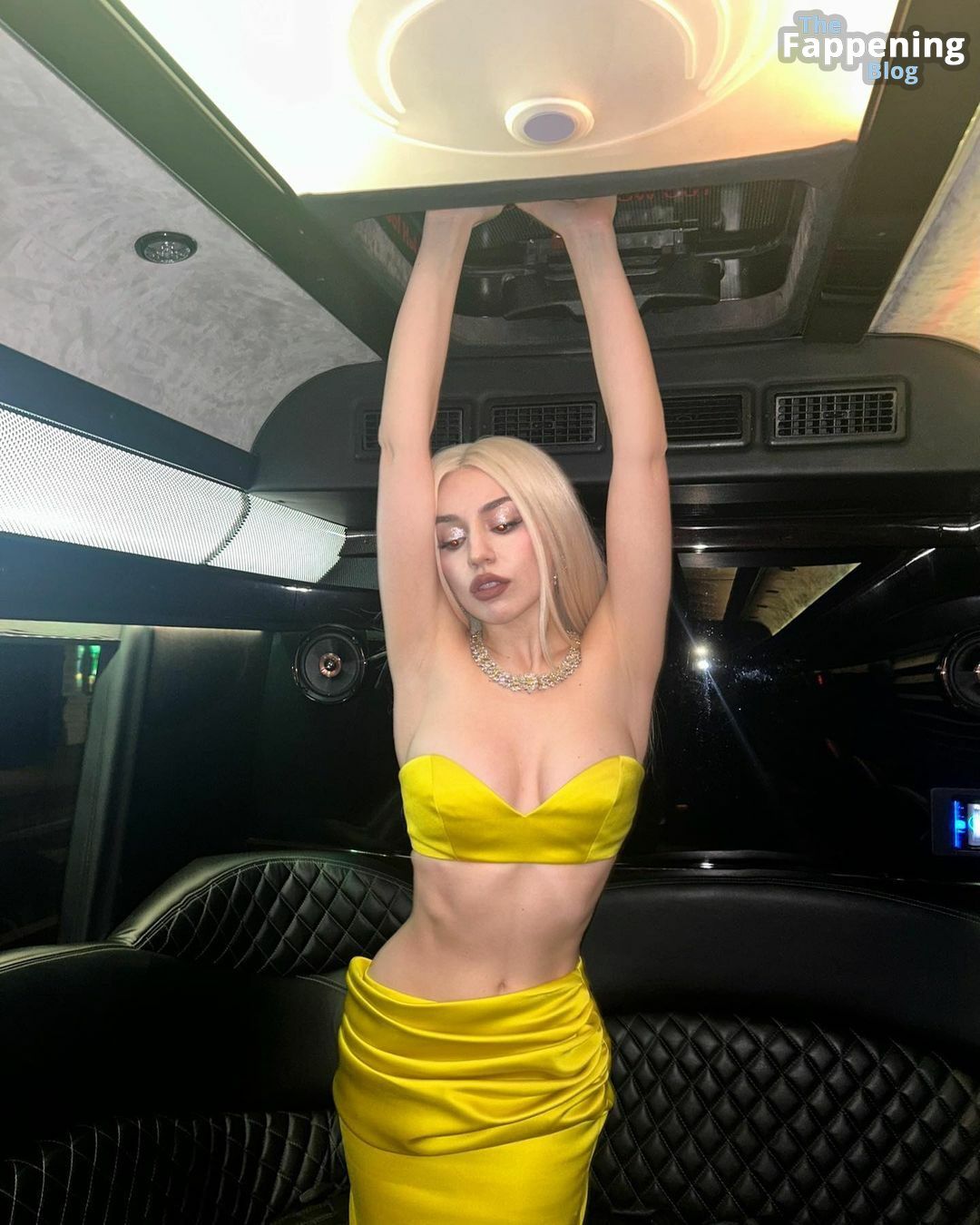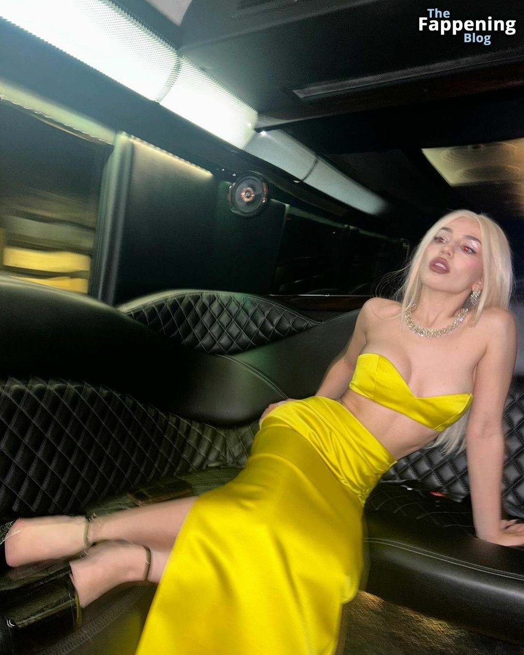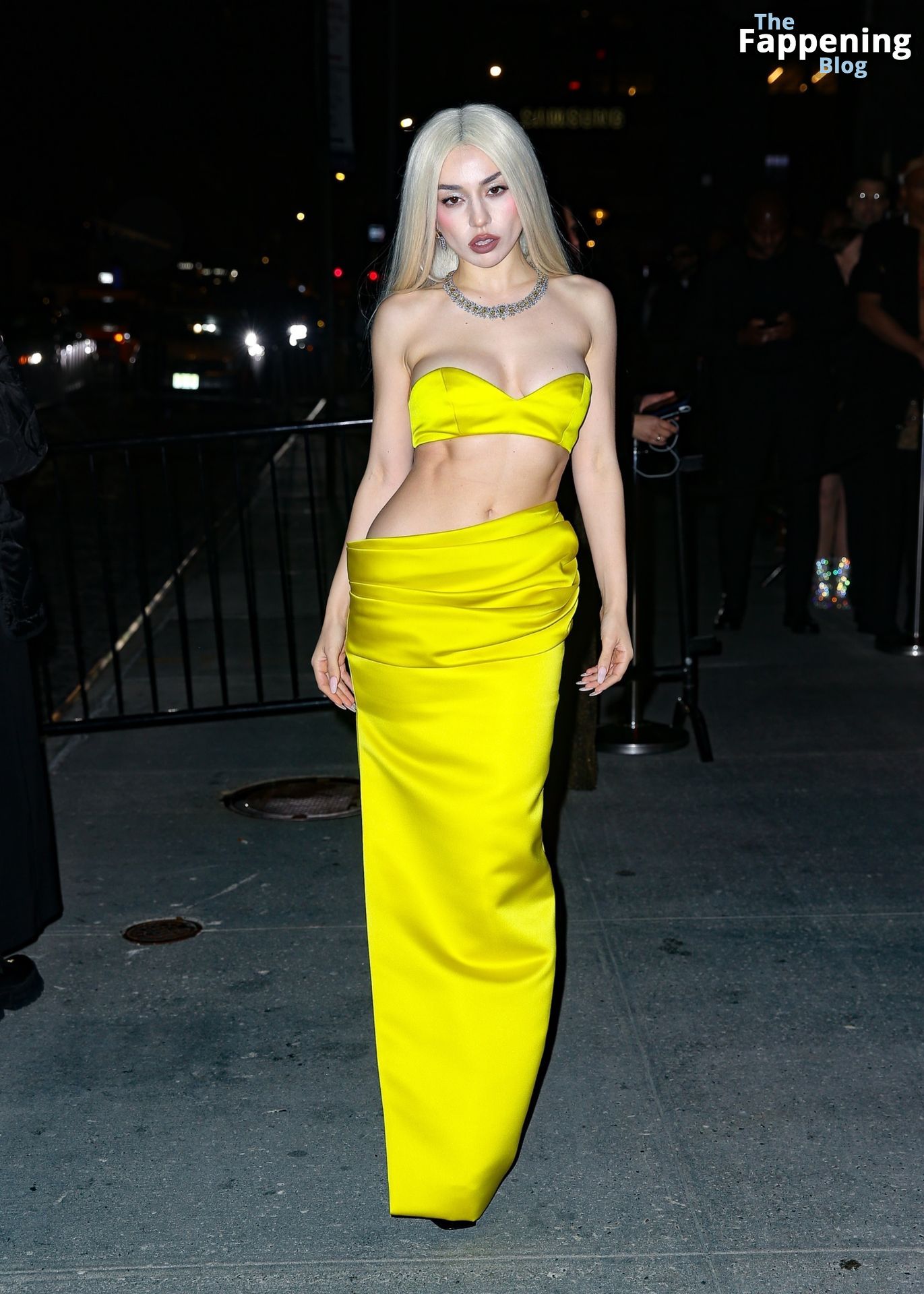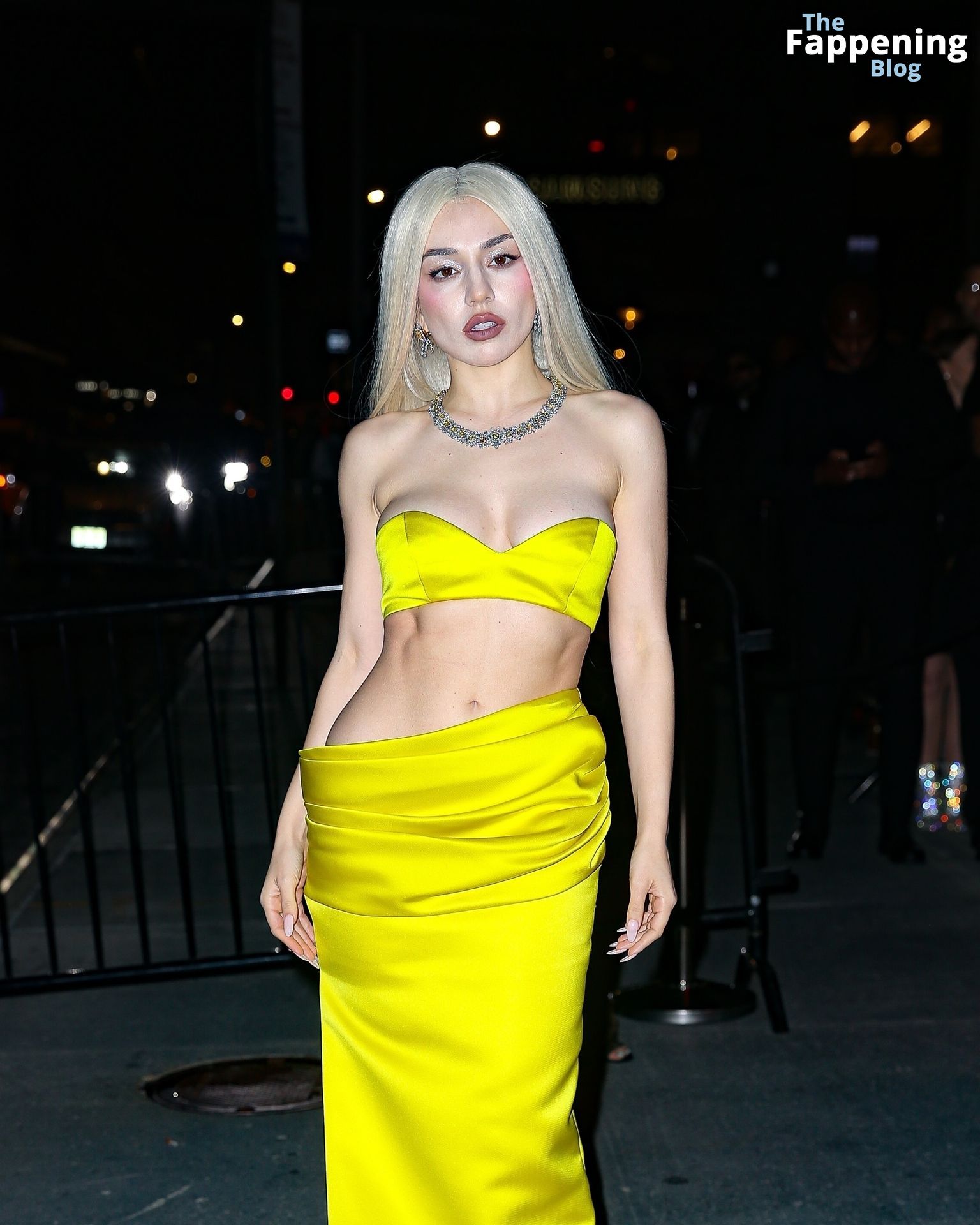 Non sottovalutare la dichiarazione di moda hot di Ava Max: un abito giallo senza reggiseno che mette in mostra tutta la sua bellezza mentre viene vista arrivare a una festa del Met Gala a NYC.