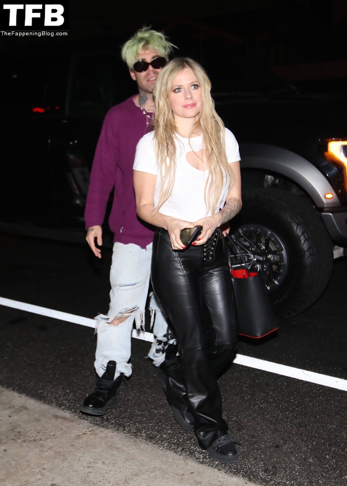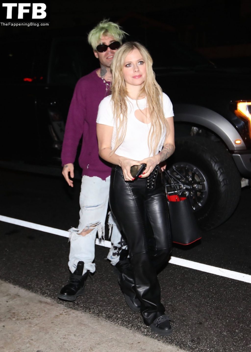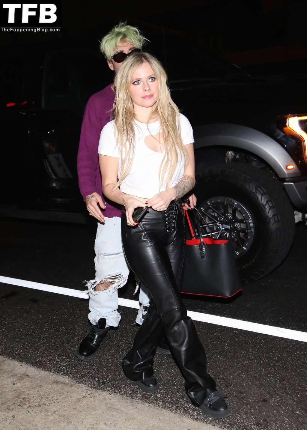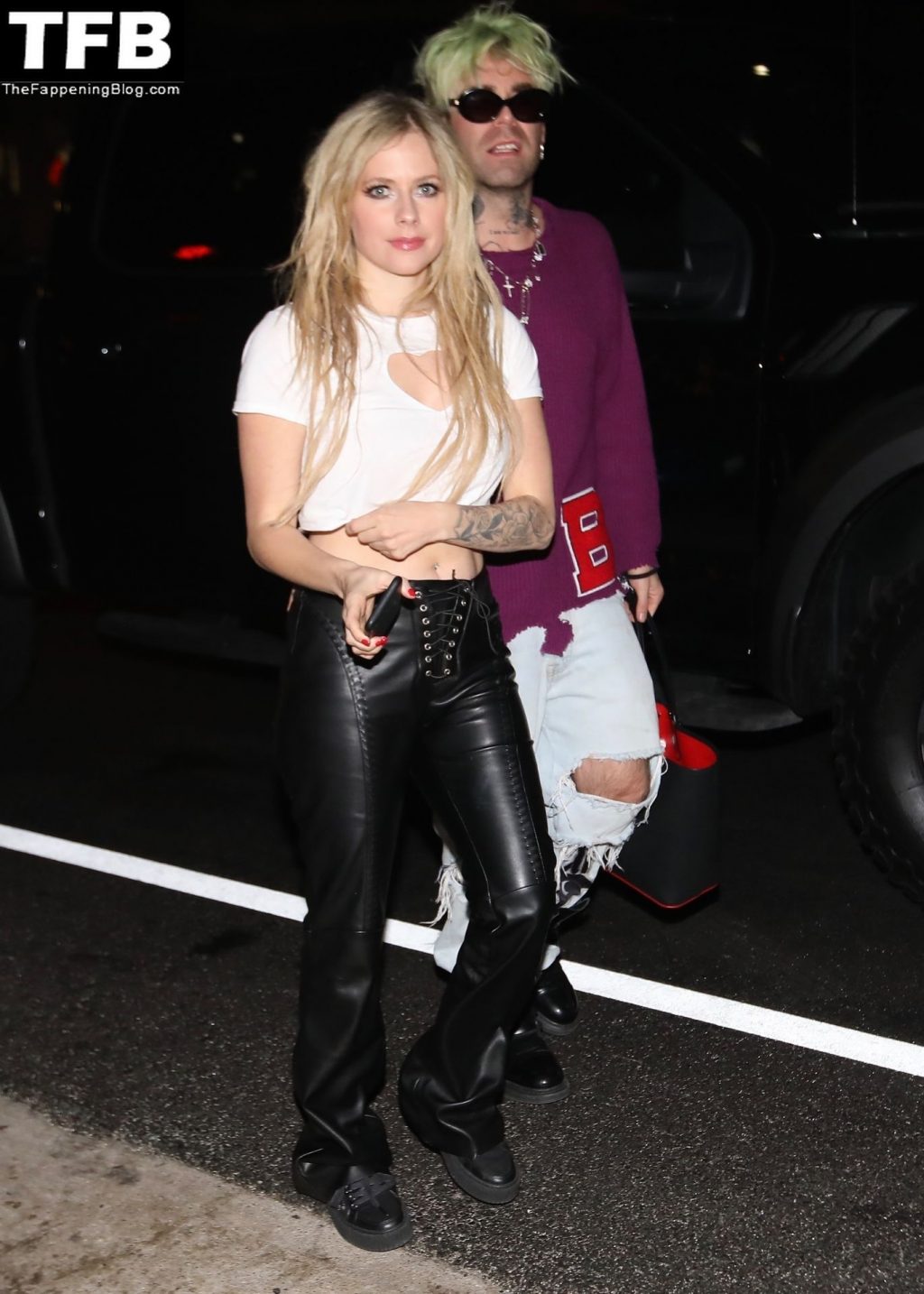 La cantante Avril Lavigne è stupenda con una maglietta bianca, pantaloni di pelle e mutandine rosa mentre lascia il Boa Steakhouse dopo cena a West Hollywood, 11/10/2021.