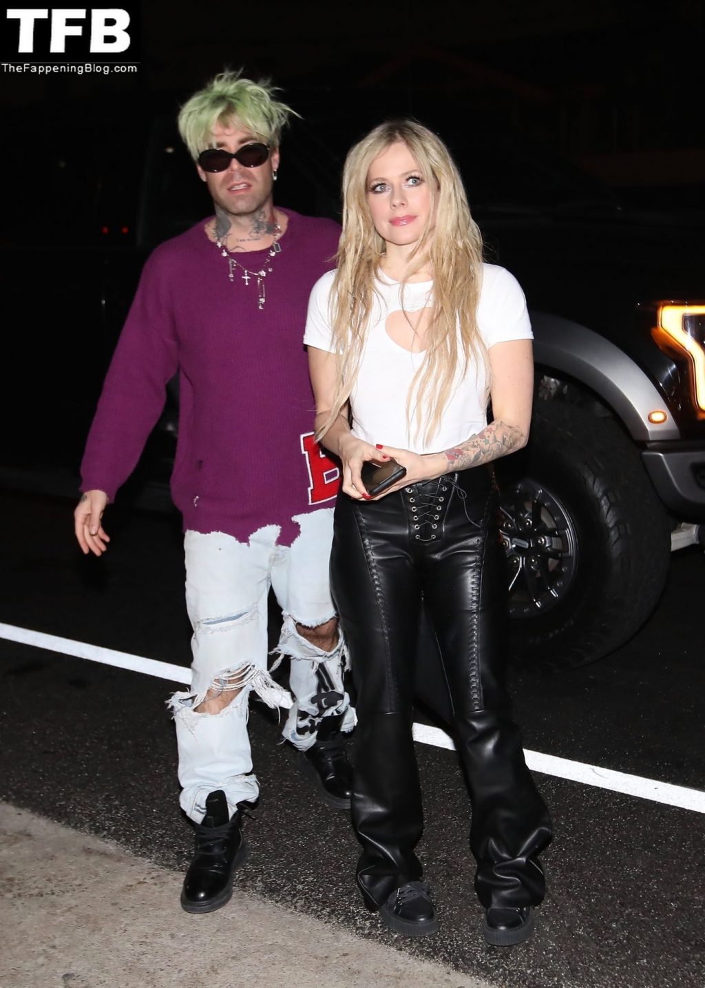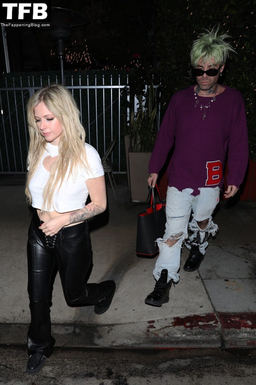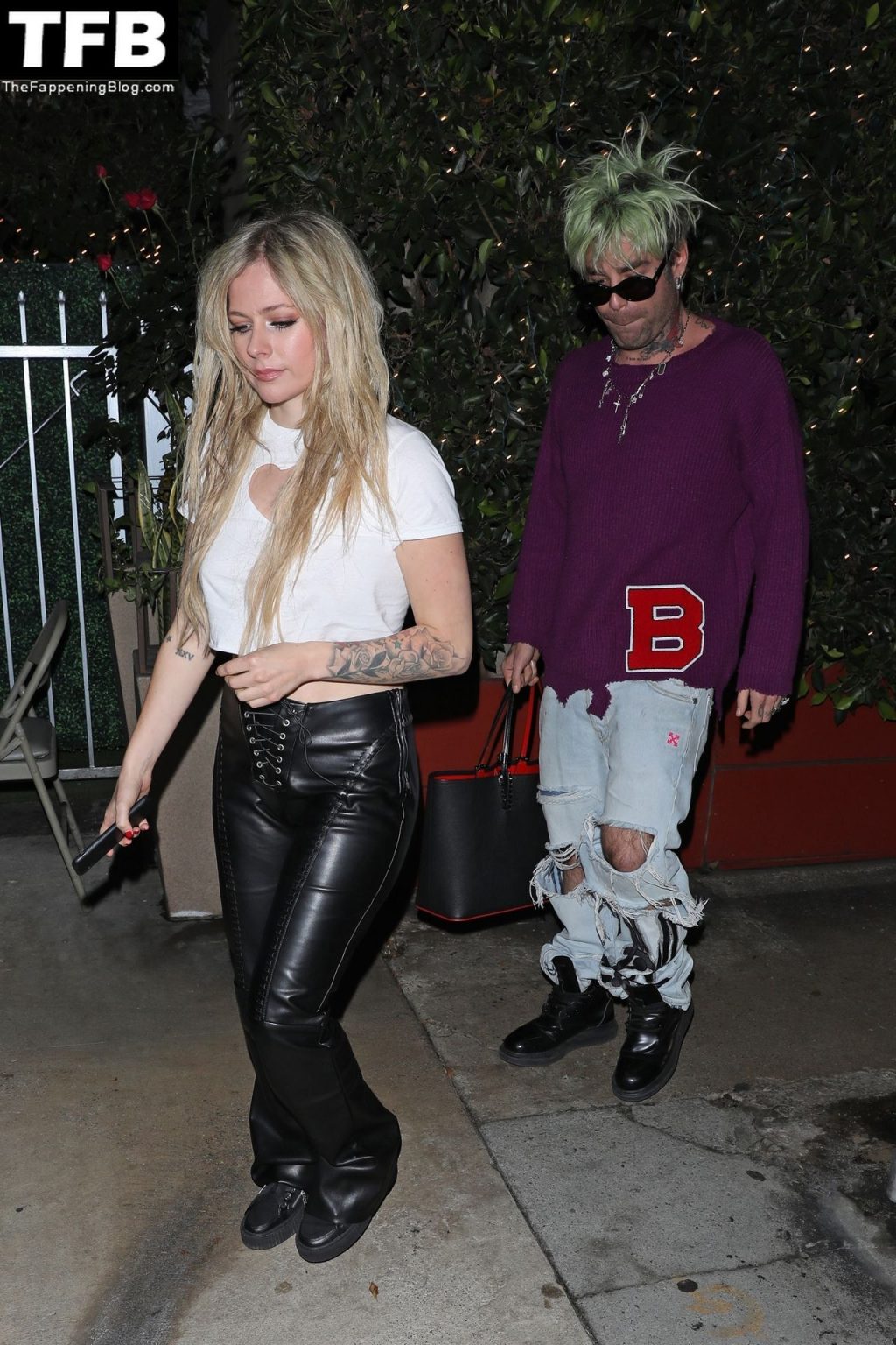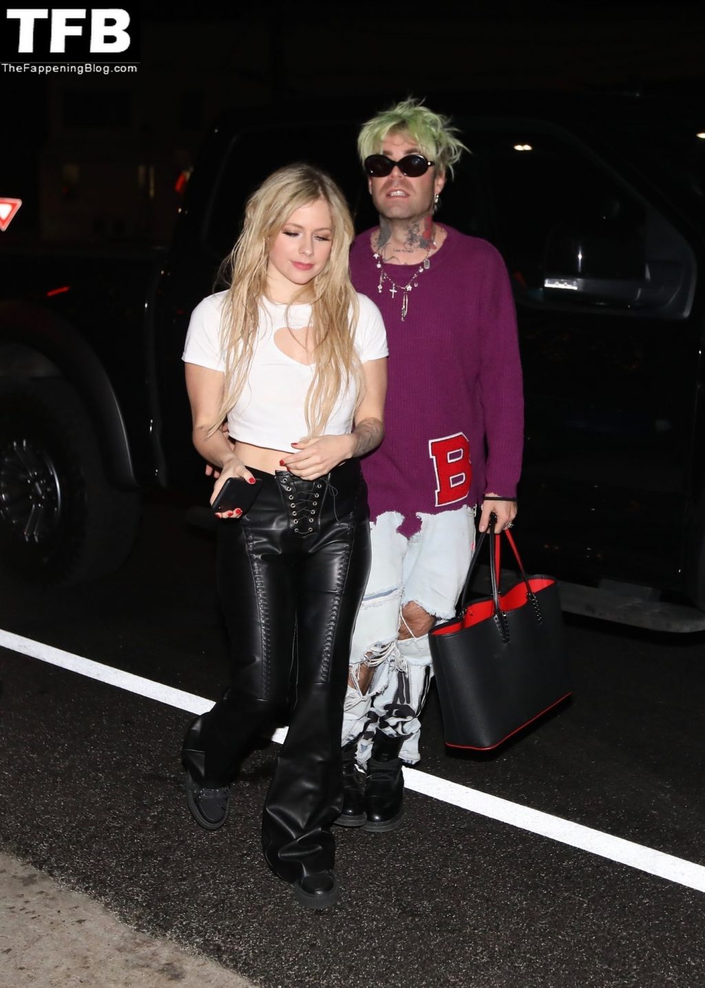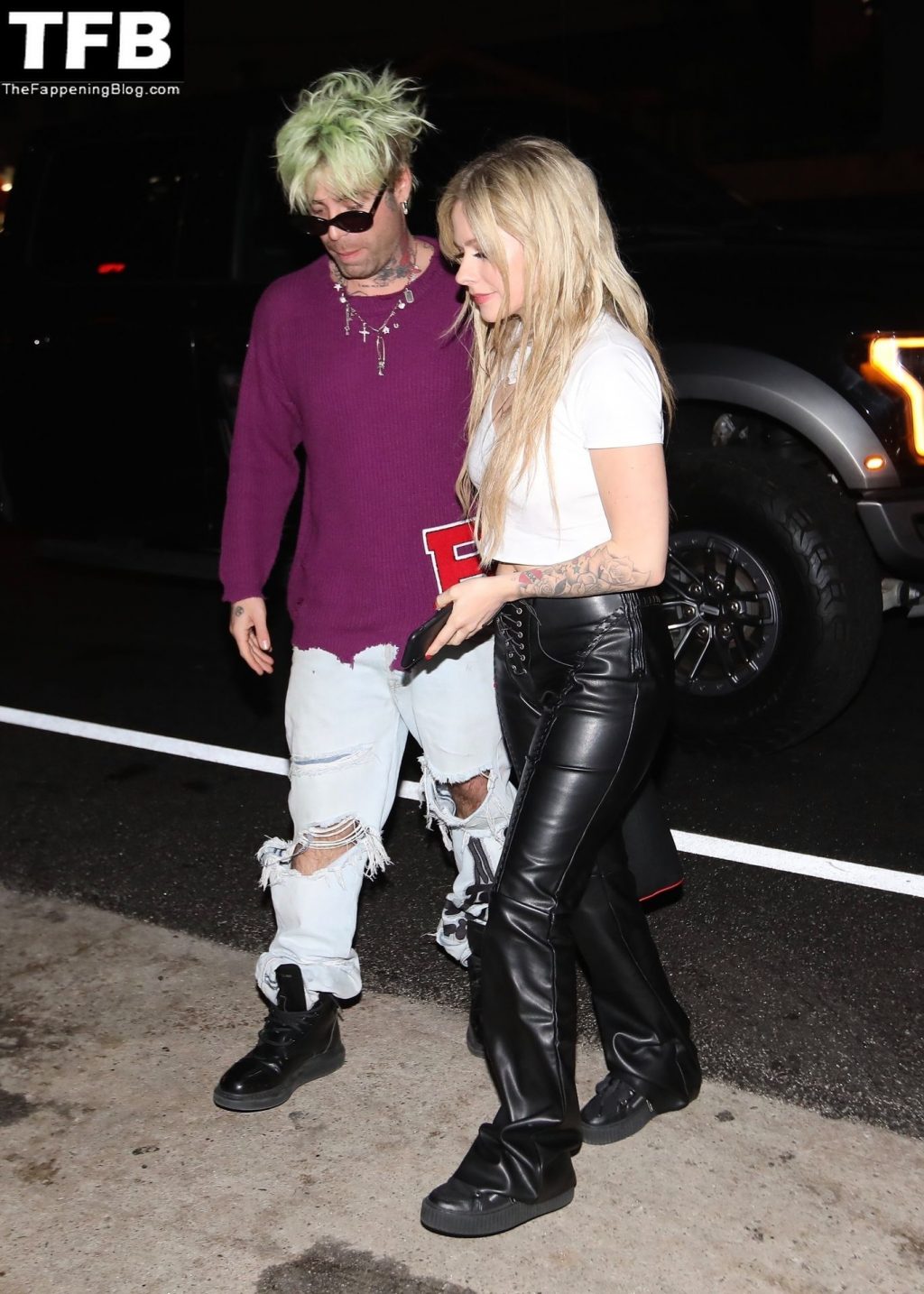 La cantante Avril Lavigne è stupenda con una maglietta bianca, pantaloni di pelle e mutandine rosa mentre lascia il Boa Steakhouse dopo cena a West Hollywood, 11/10/2021.