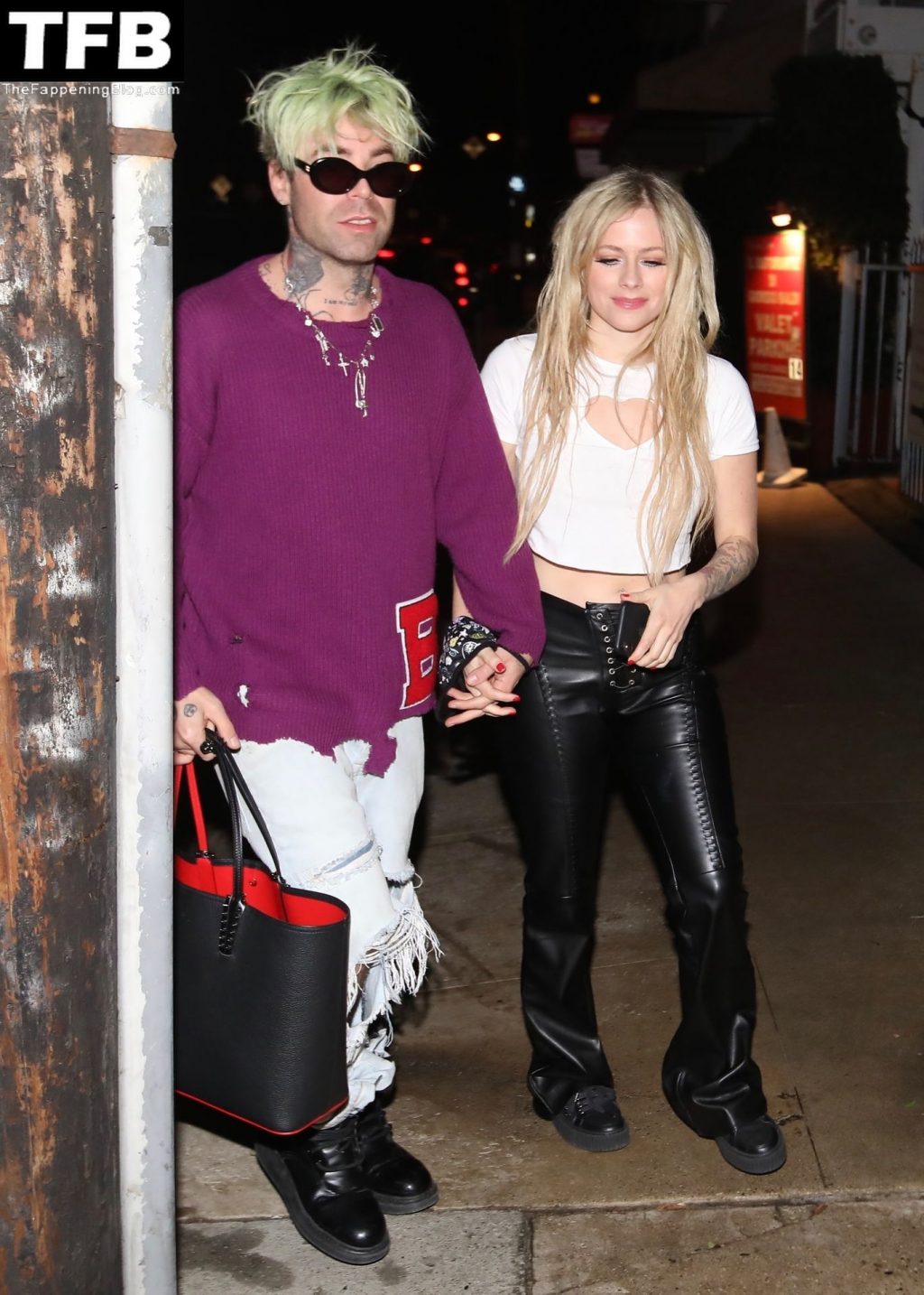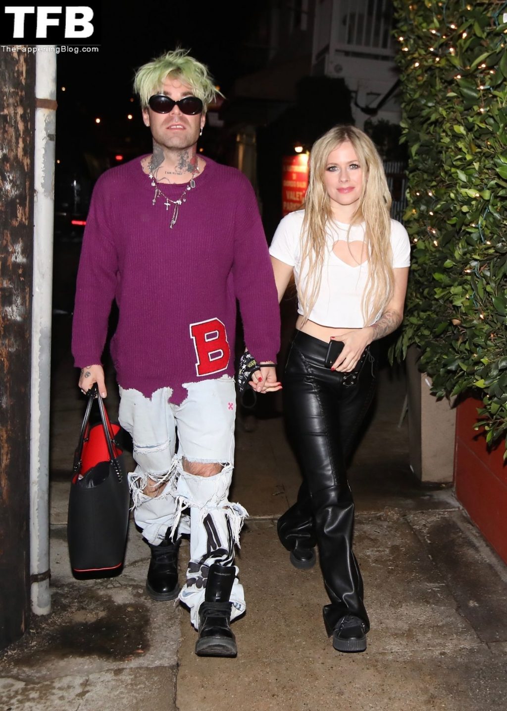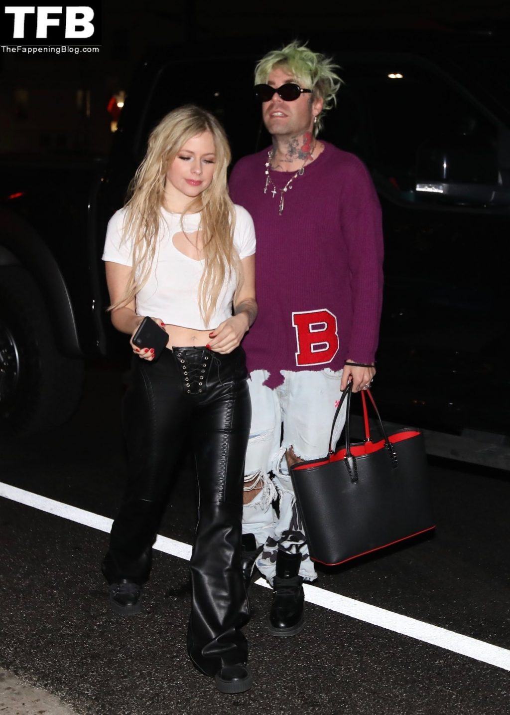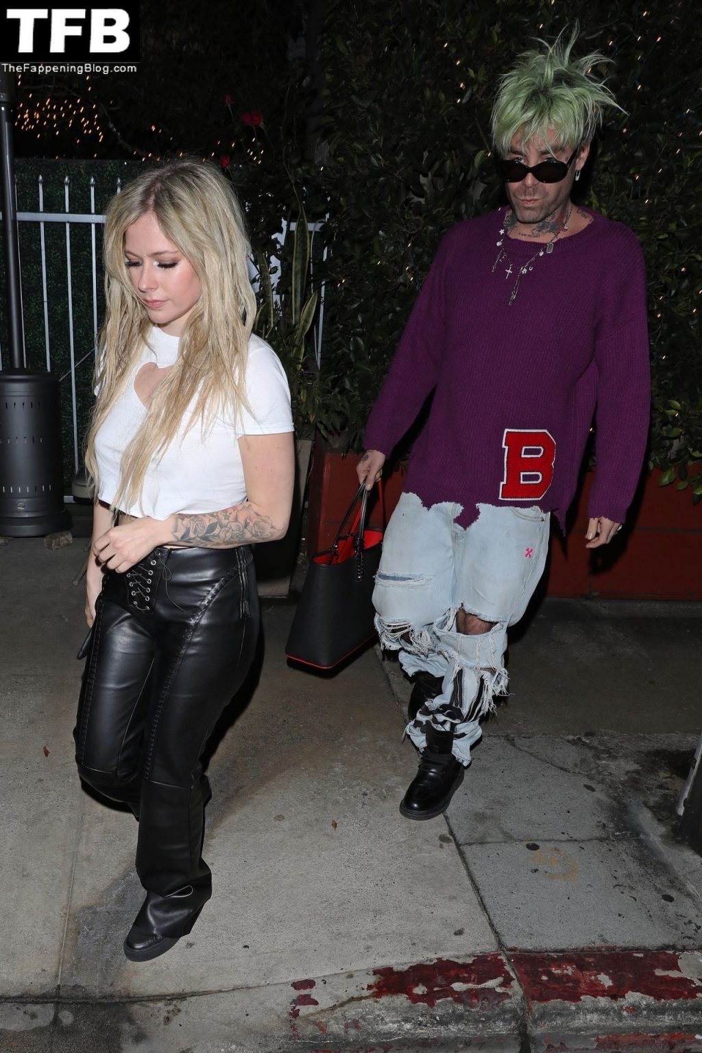 La cantante Avril Lavigne è stupenda con una maglietta bianca, pantaloni di pelle e mutandine rosa mentre lascia il Boa Steakhouse dopo cena a West Hollywood, 11/10/2021.