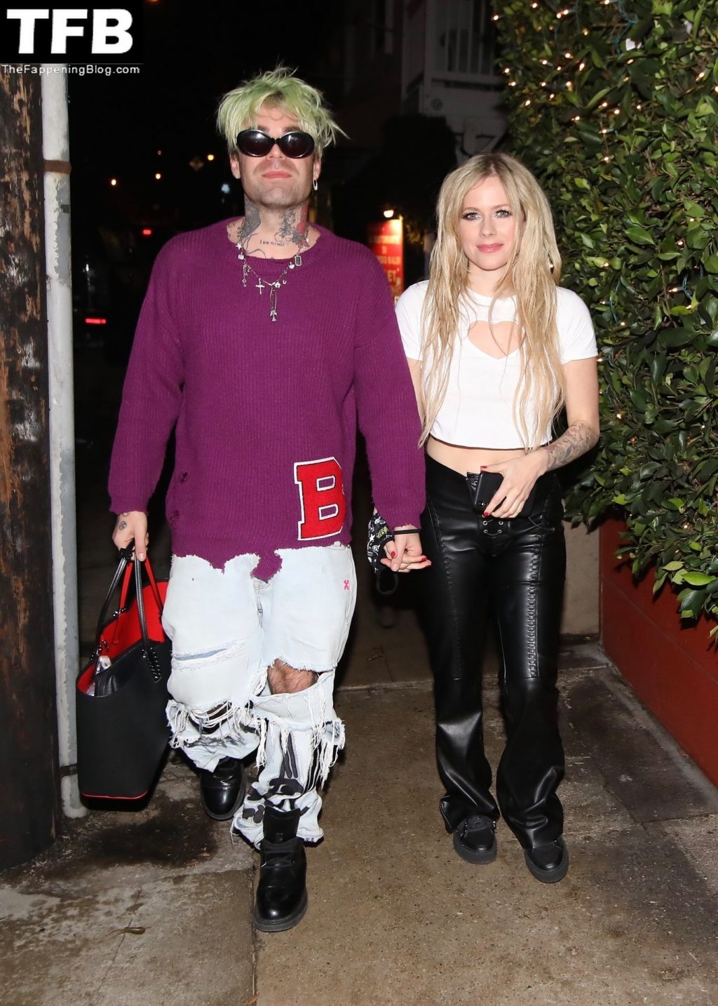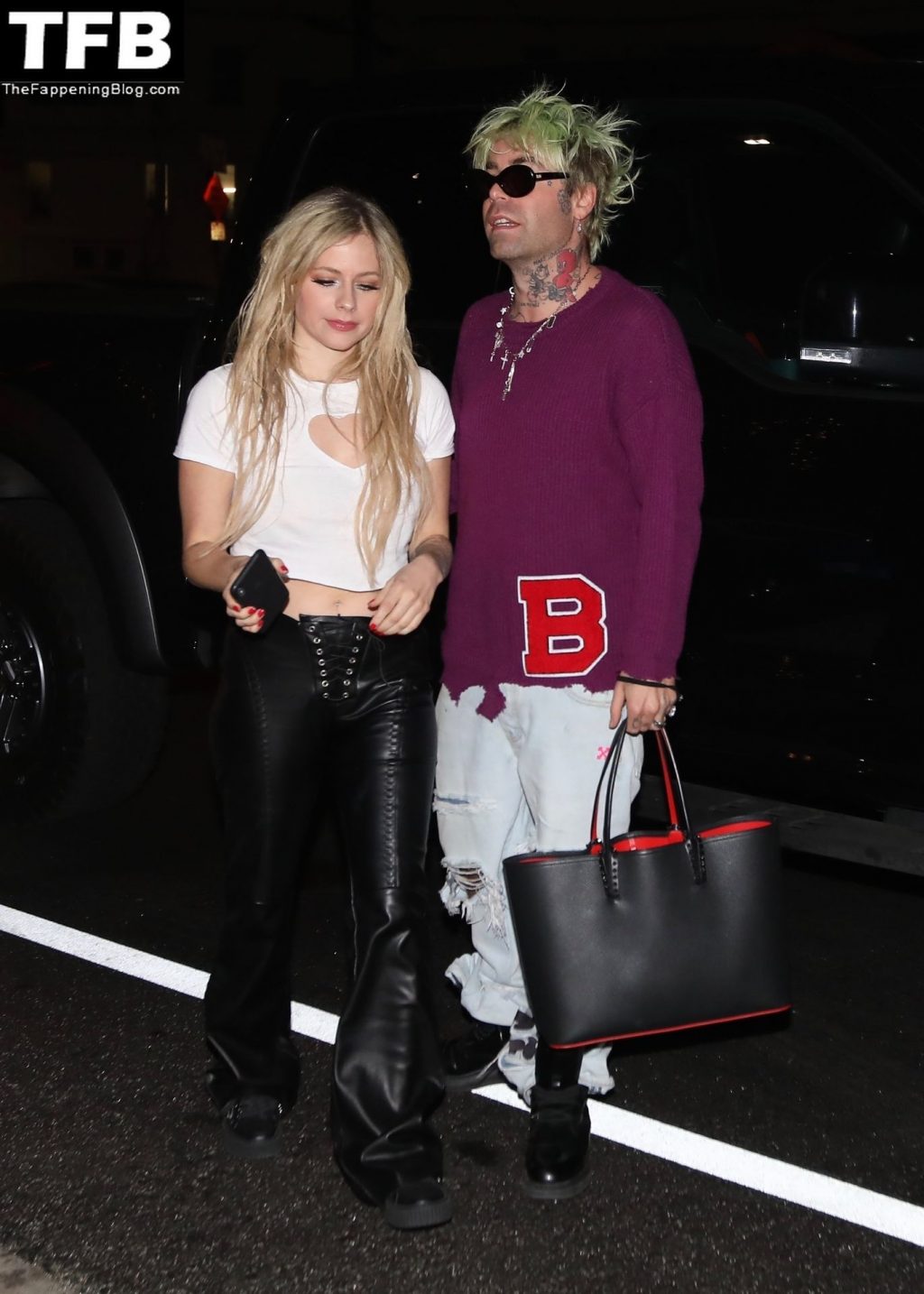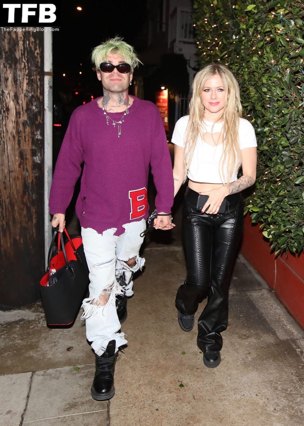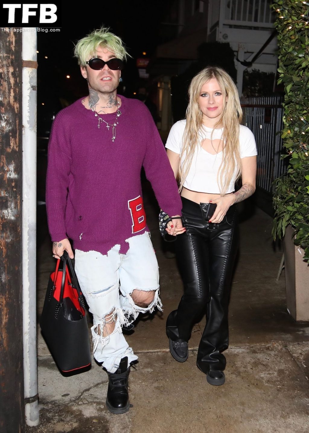 La cantante Avril Lavigne è stupenda con una maglietta bianca, pantaloni di pelle e mutandine rosa mentre lascia il Boa Steakhouse dopo cena a West Hollywood, 11/10/2021.