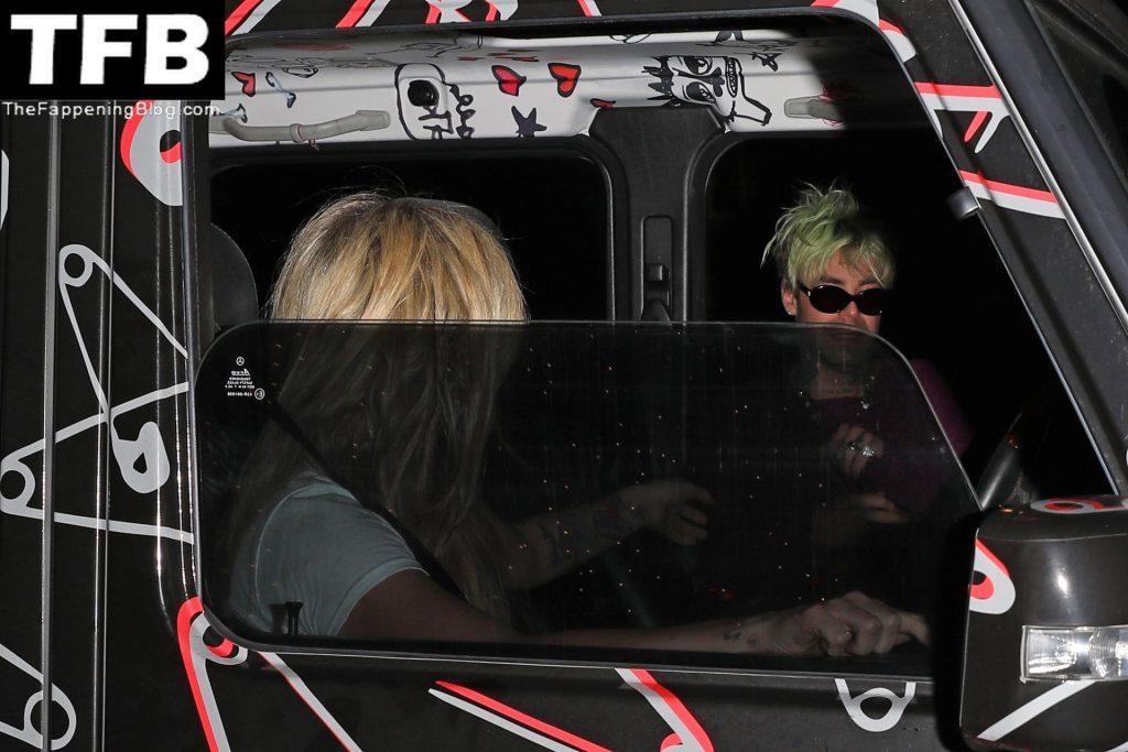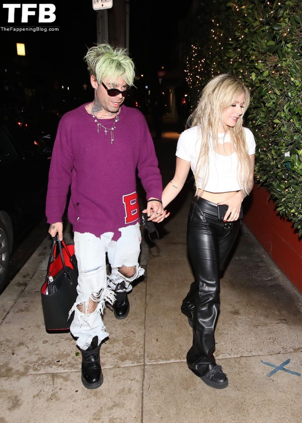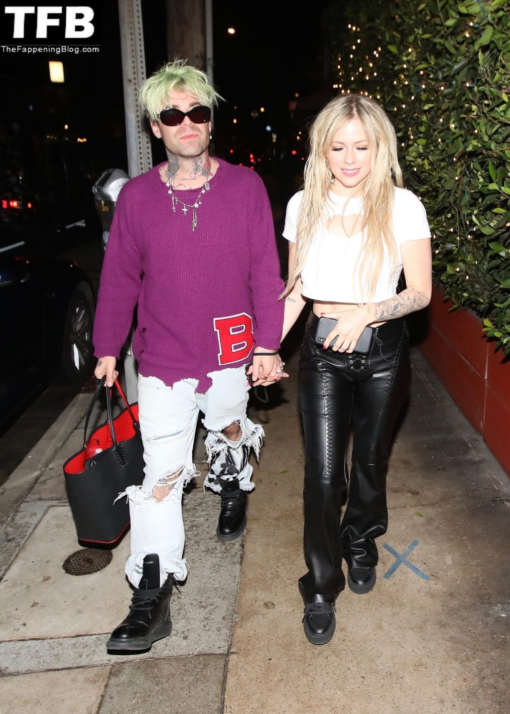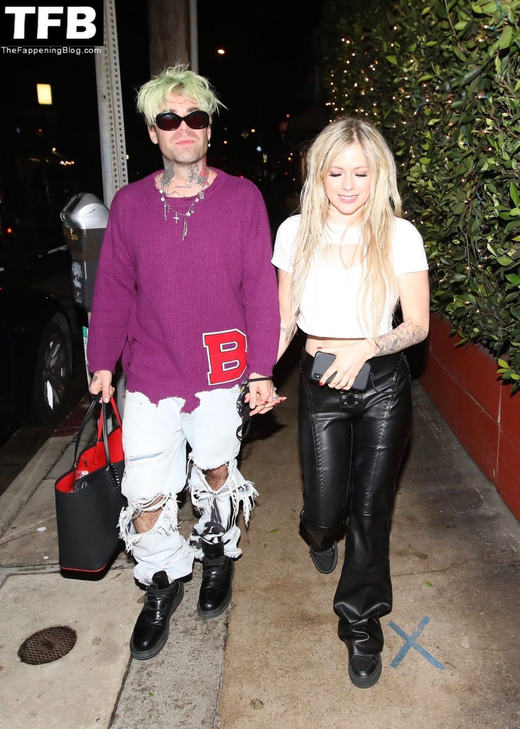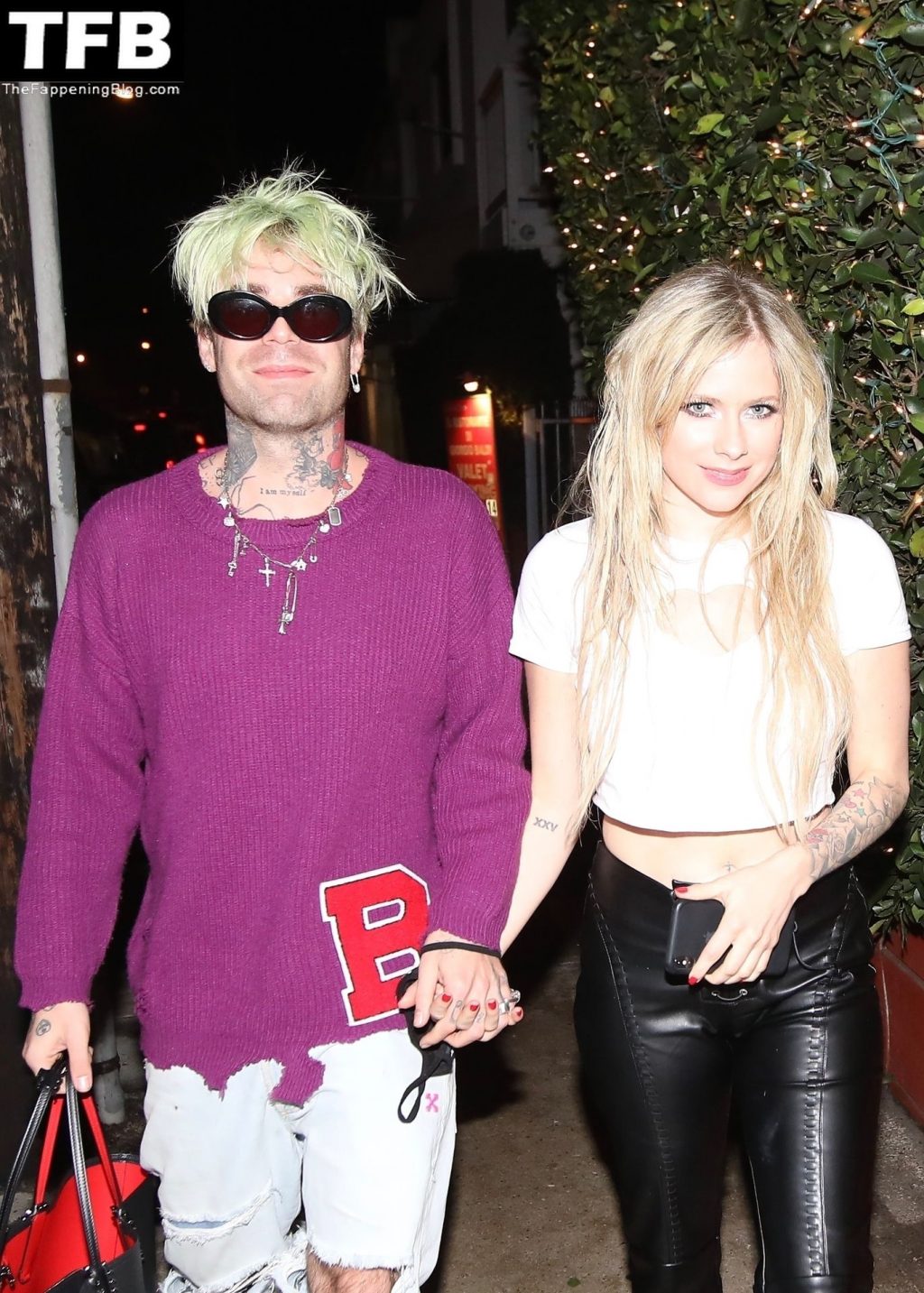 La cantante Avril Lavigne è stupenda con una maglietta bianca, pantaloni di pelle e mutandine rosa mentre lascia il Boa Steakhouse dopo cena a West Hollywood, 11/10/2021.