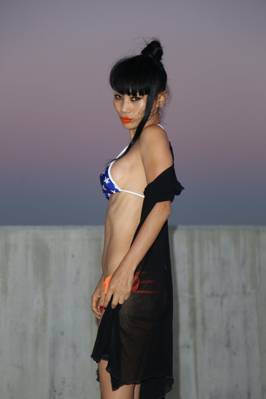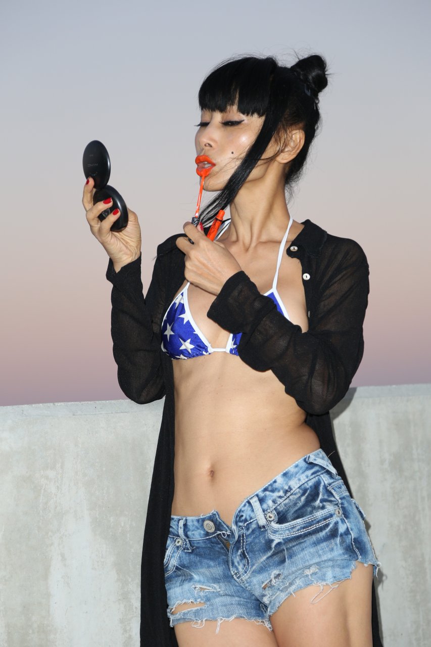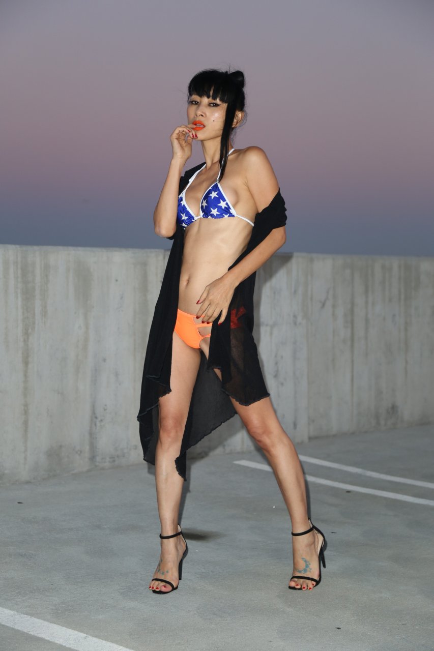 Bai Ling mostra la sua vita sottile in un bikini blu-arancione nel parcheggio del teatro ArcLight a Los Angeles, 10/08/2016. Bai Ling è un’attrice cinese-americana. Età: 49 (10 ottobre 1966).