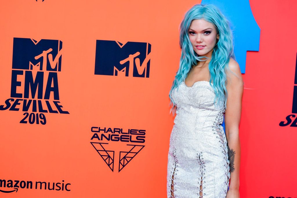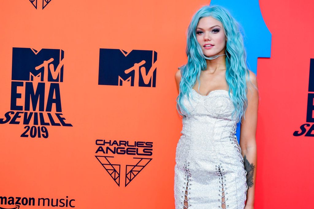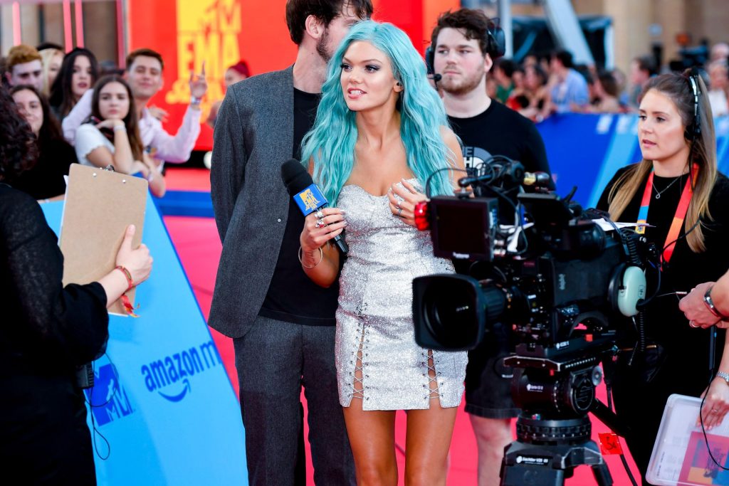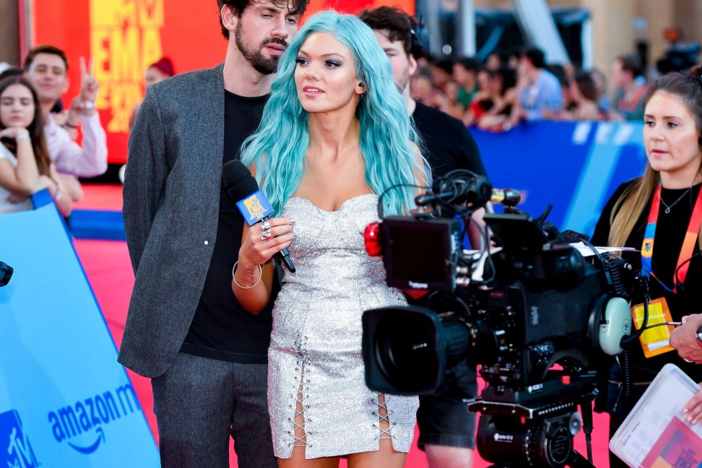 Leggy Becca Dudley posa su un tappeto rosso mentre arriva agli MTV Europe Music Awards 2019 presso il FIBES Conference and Exhibition Centre a Siviglia, Spagna, 11/03/2019.