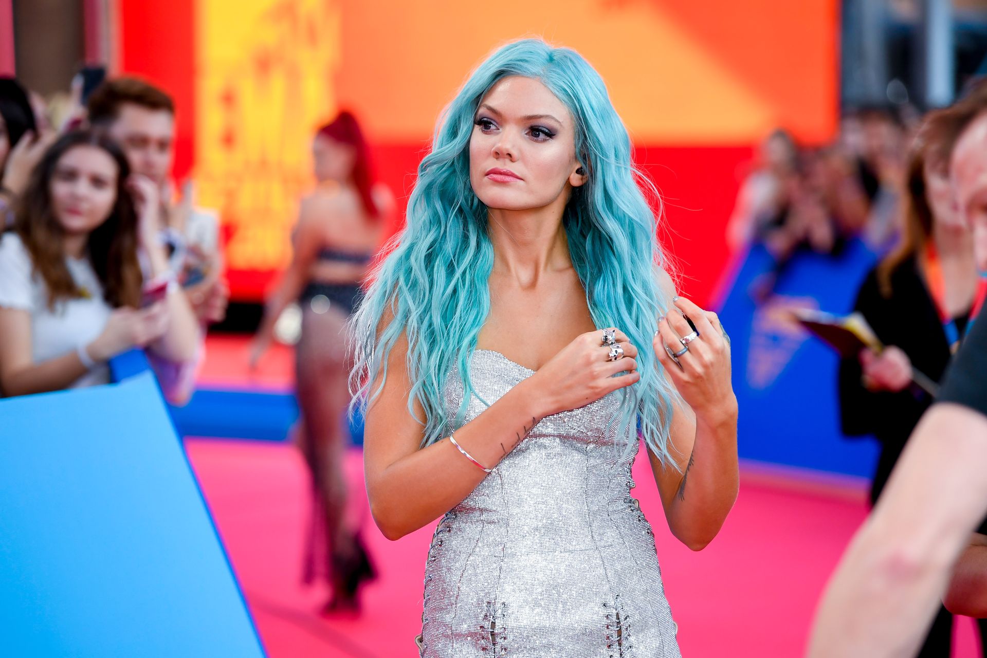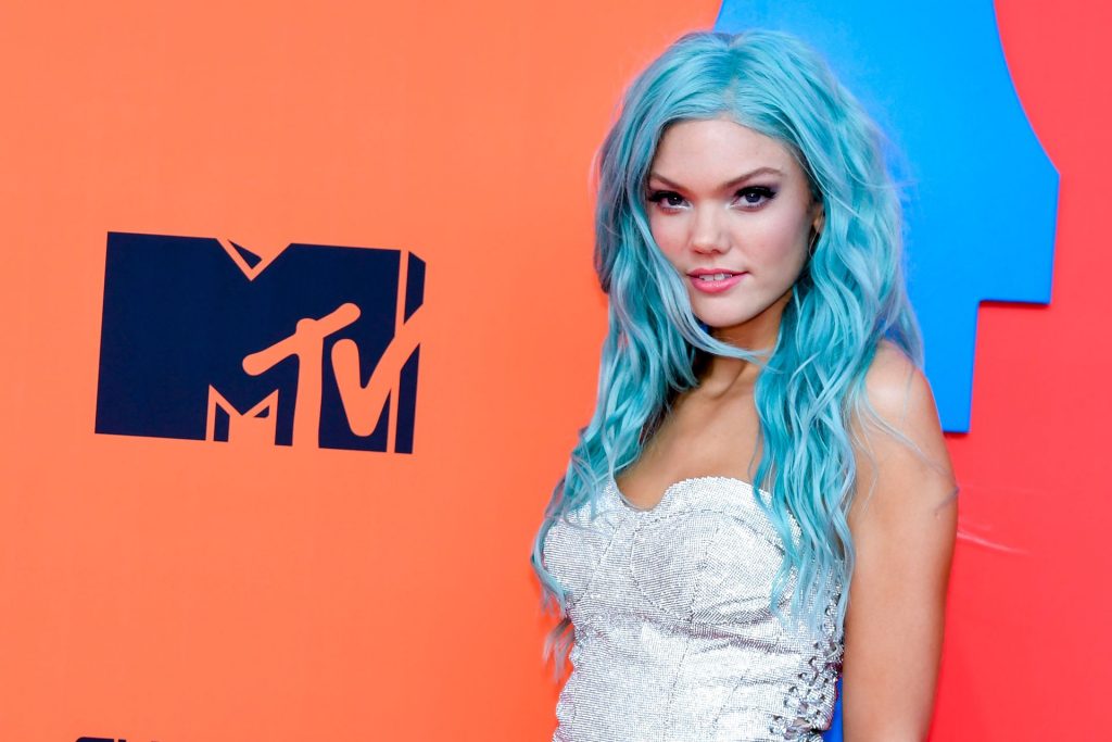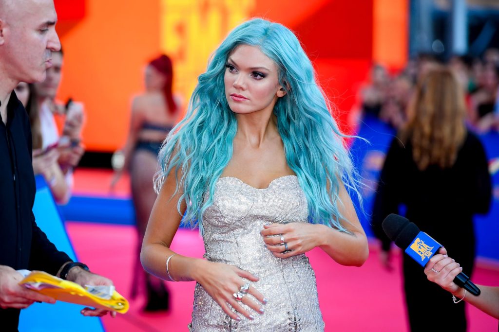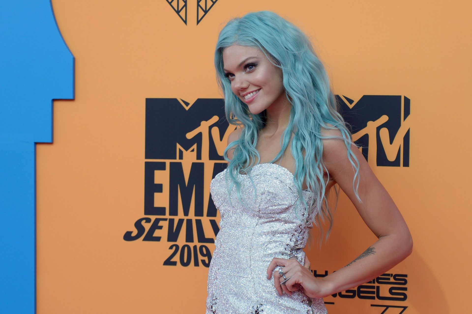 Leggy Becca Dudley posa su un tappeto rosso mentre arriva agli MTV Europe Music Awards 2019 presso il FIBES Conference and Exhibition Centre a Siviglia, Spagna, 11/03/2019.