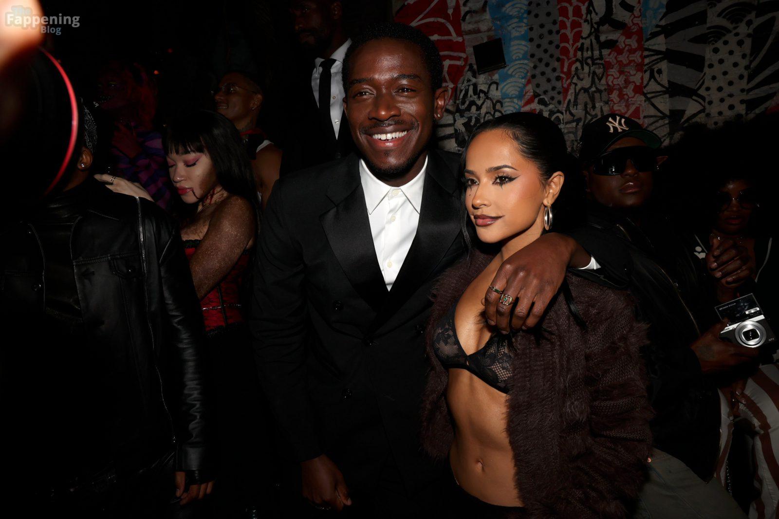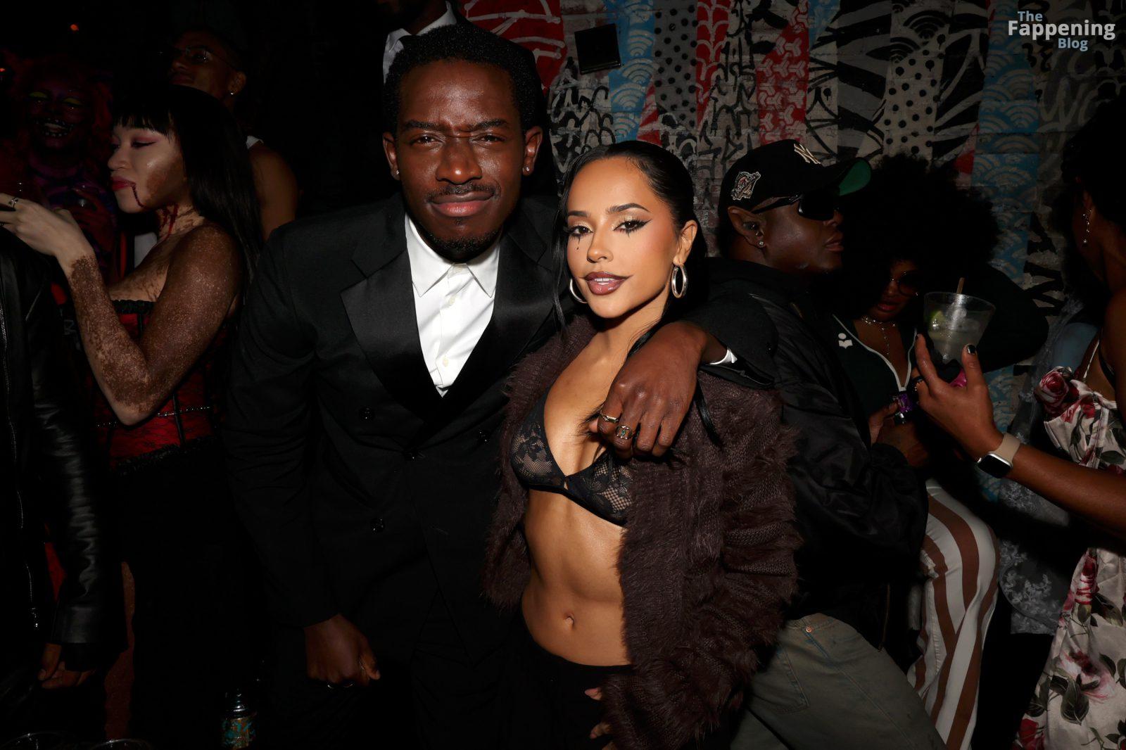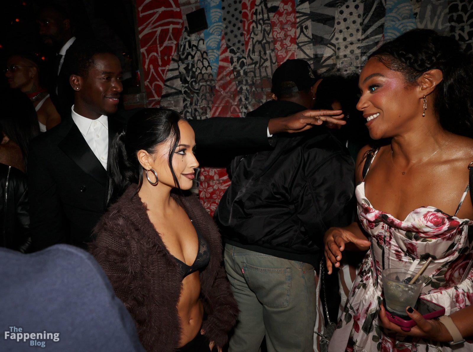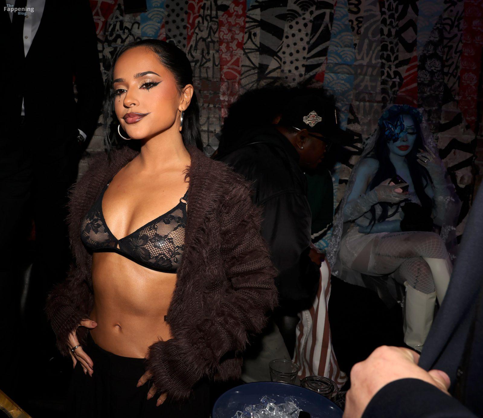 Becky G è stata fotografata al Costume Couture di NYC con un reggiseno trasparente e un cardigan peloso, mostrando il seno e gli addominali tonici.