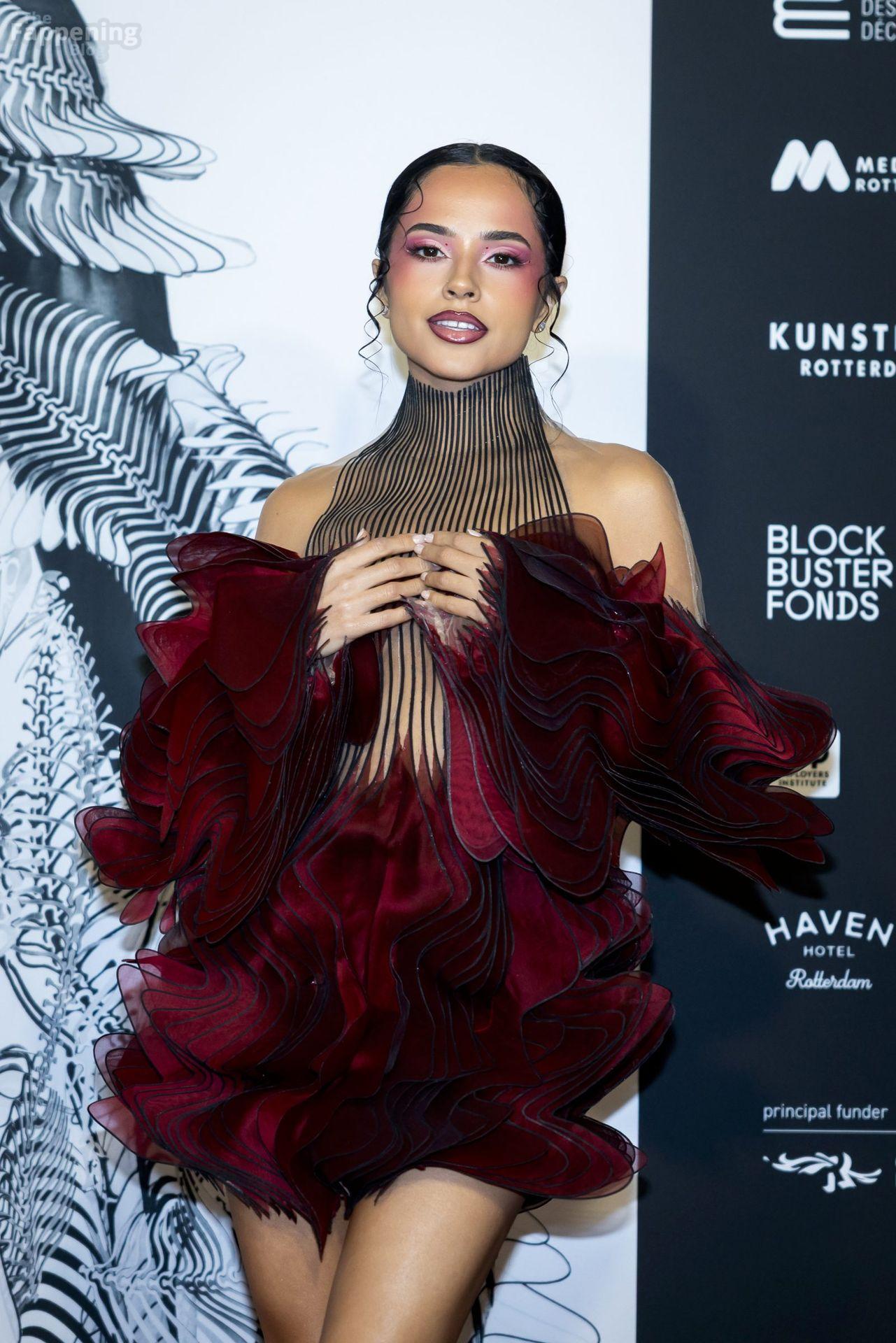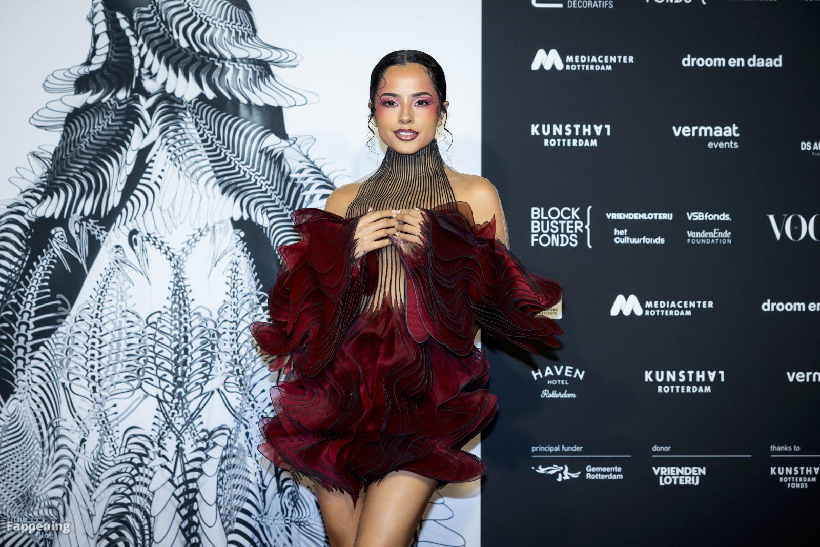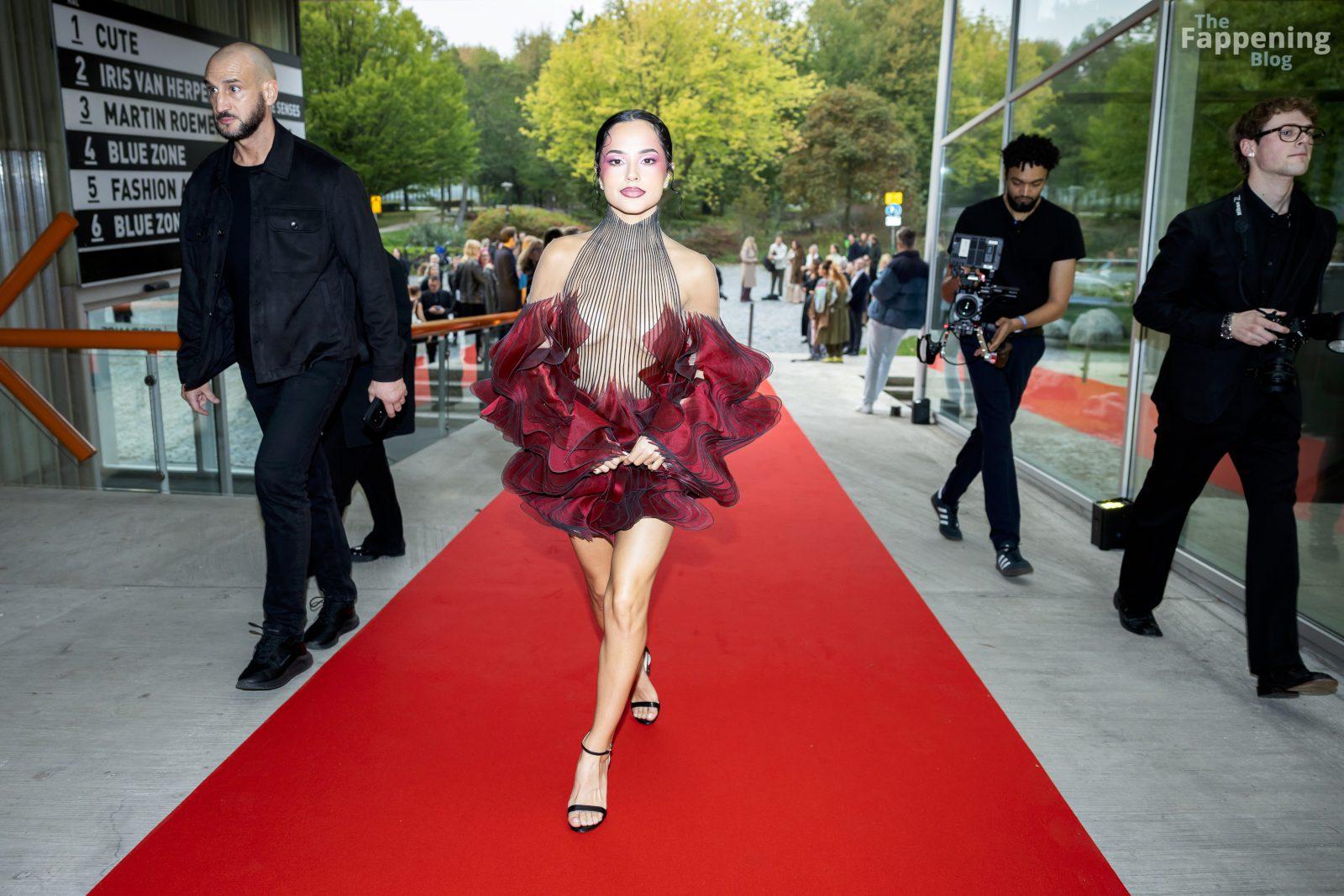 Becky G ha mostrato tutto a Rotterdam, indossando un abito illusion trasparente che metteva in mostra il suo sexy seno e le gambe toniche all’esposizione di Iris van Herpen.