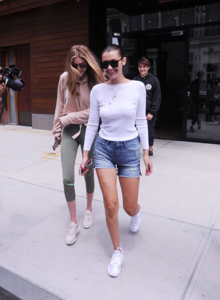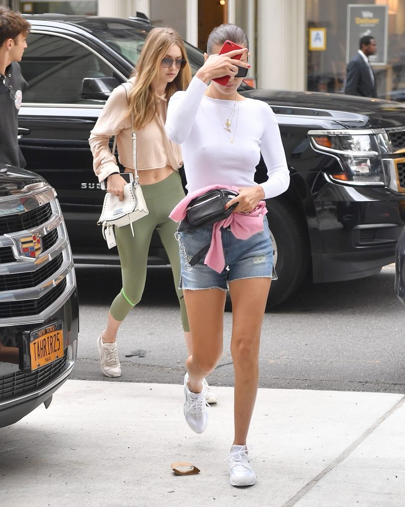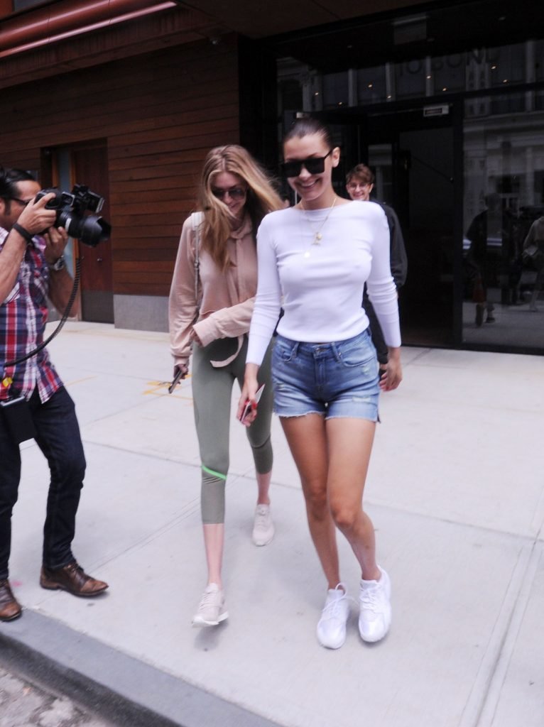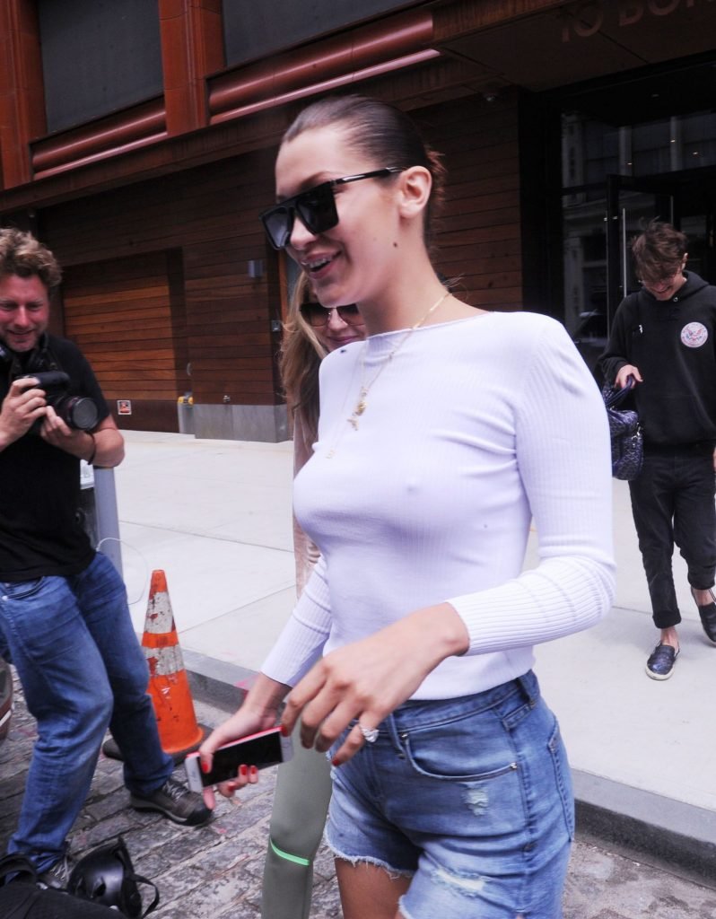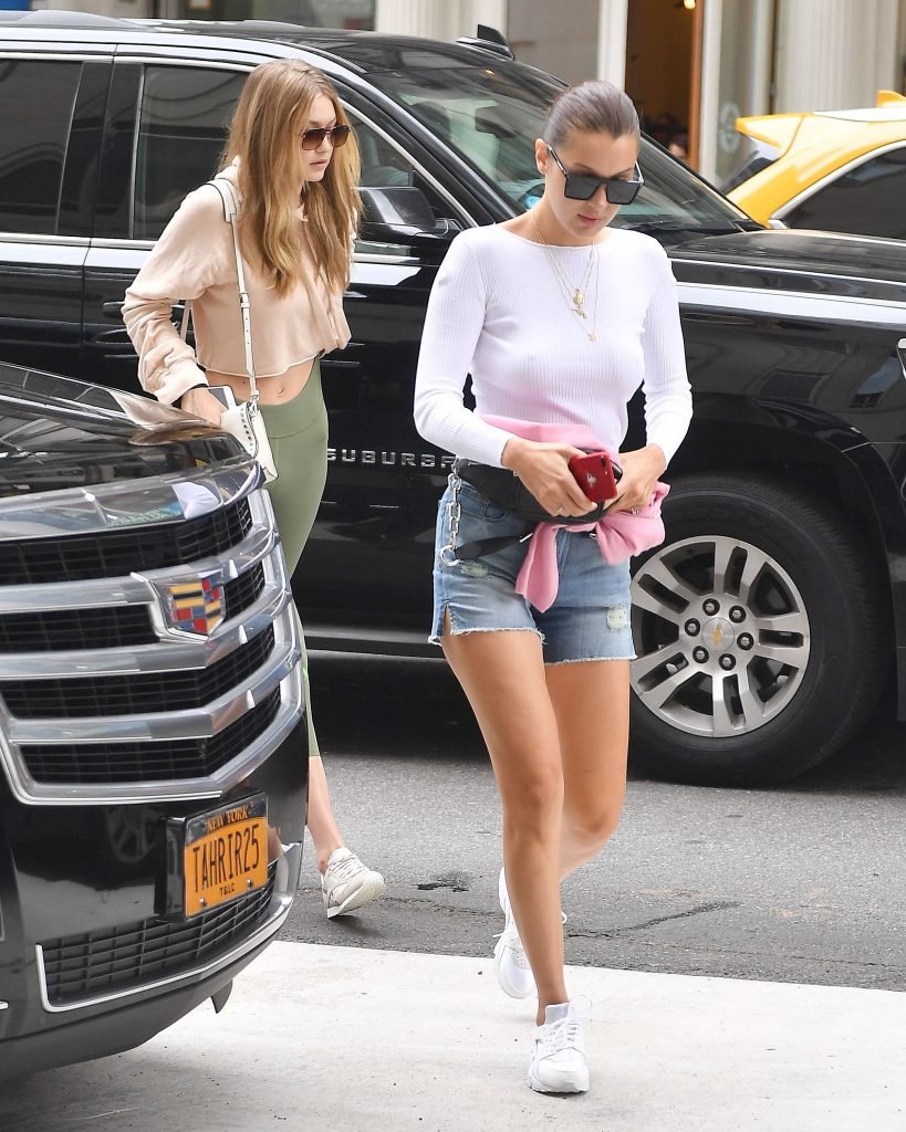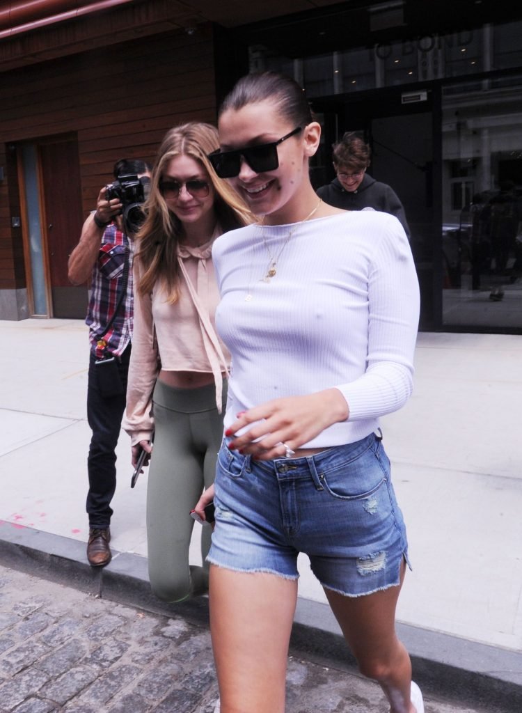 Gigi, Anwar e Bella Hadid senza reggiseno escono a New York, 27/07/2017. Isabella (Bella) Hadid è una top model e attrice americana. Età: 20.