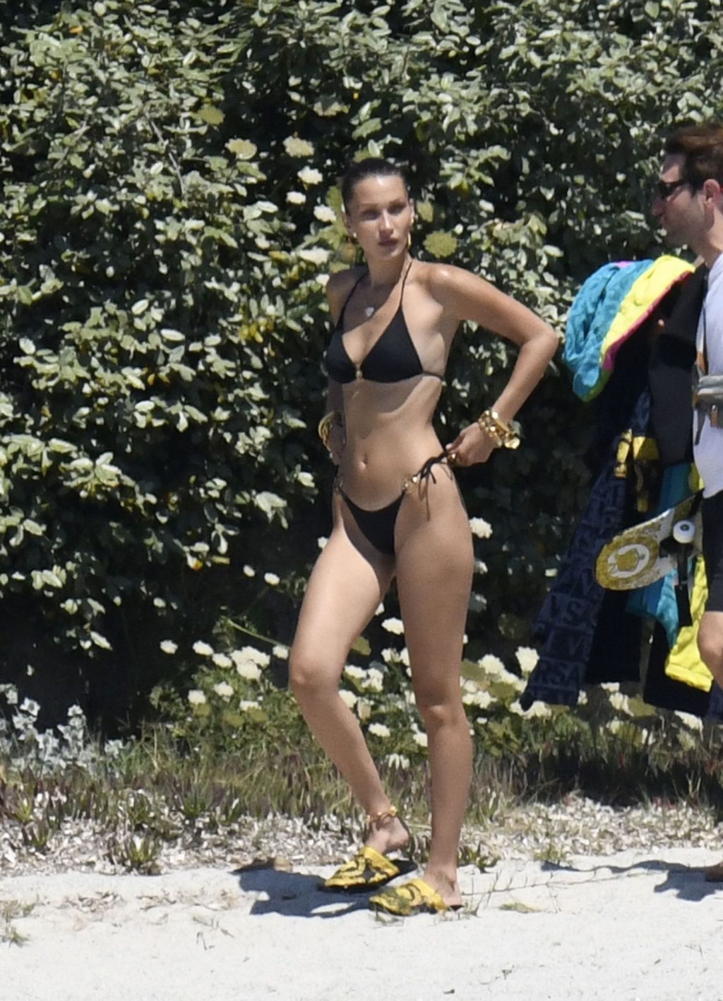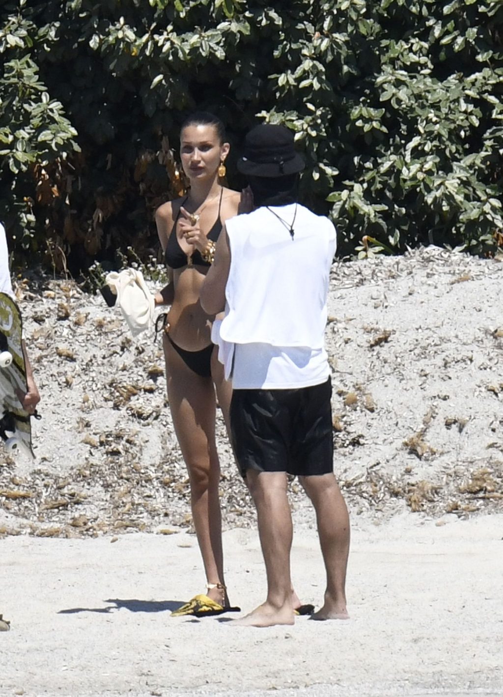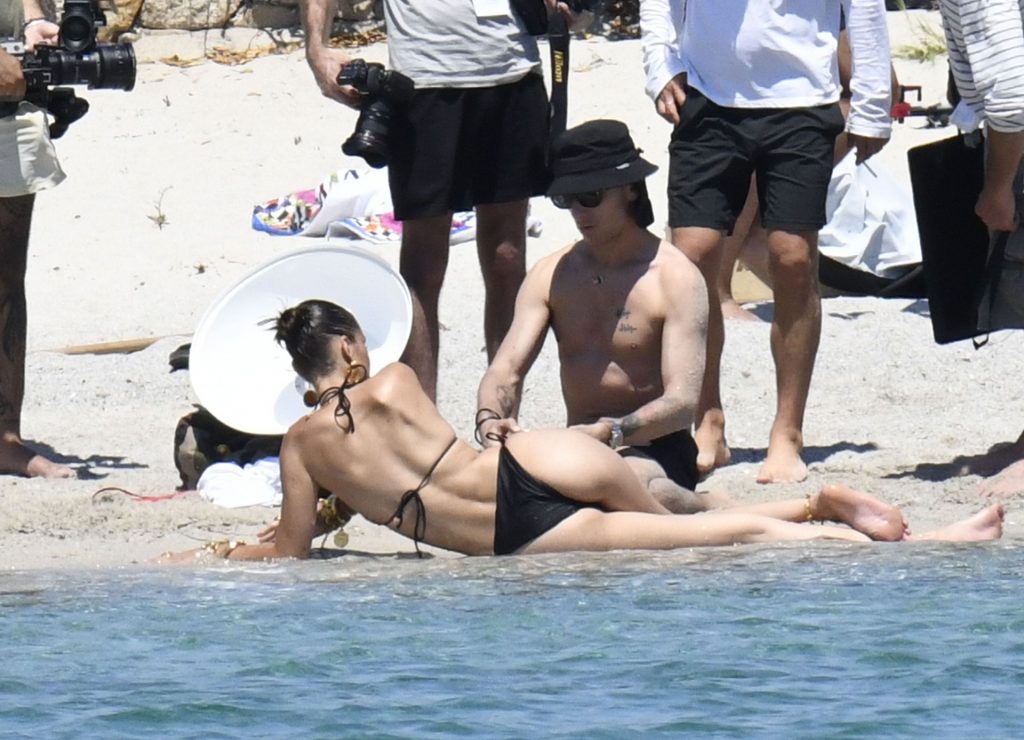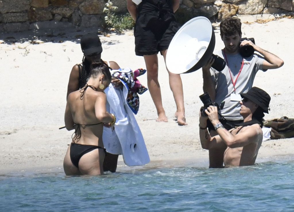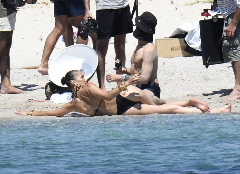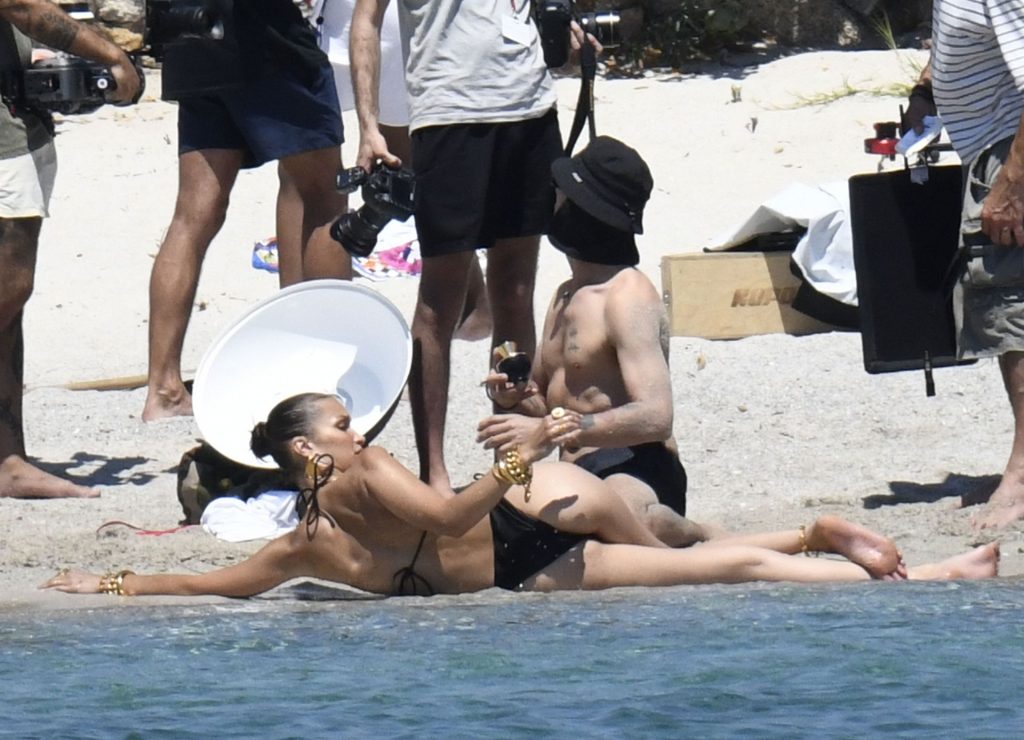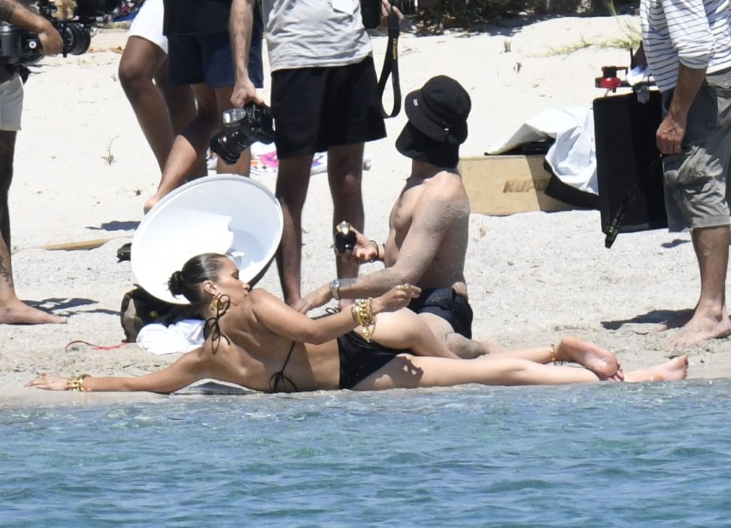 La modella Bella Hadid sfoggia il suo incredibile fisico in un bikini nero durante un servizio fotografico in Corsica, 24/06/2020.