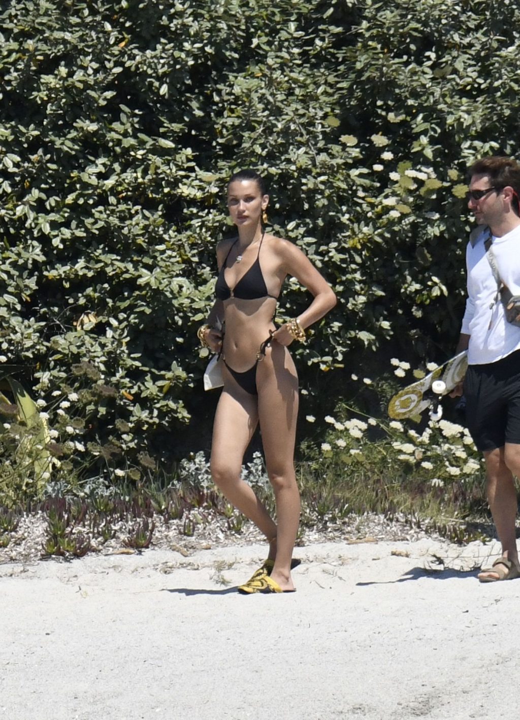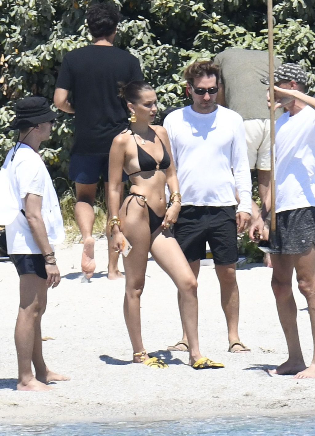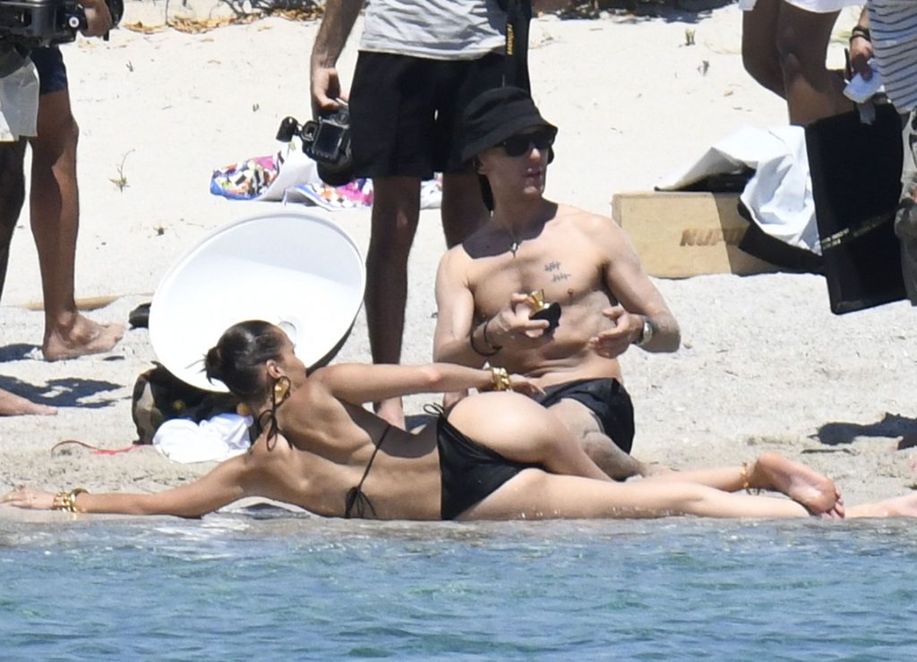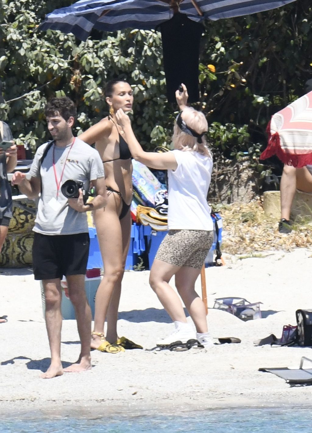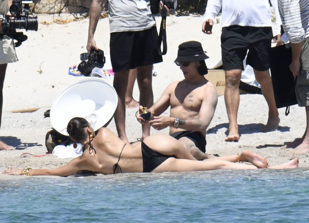 La modella Bella Hadid sfoggia il suo incredibile fisico in un bikini nero durante un servizio fotografico in Corsica, 24/06/2020.