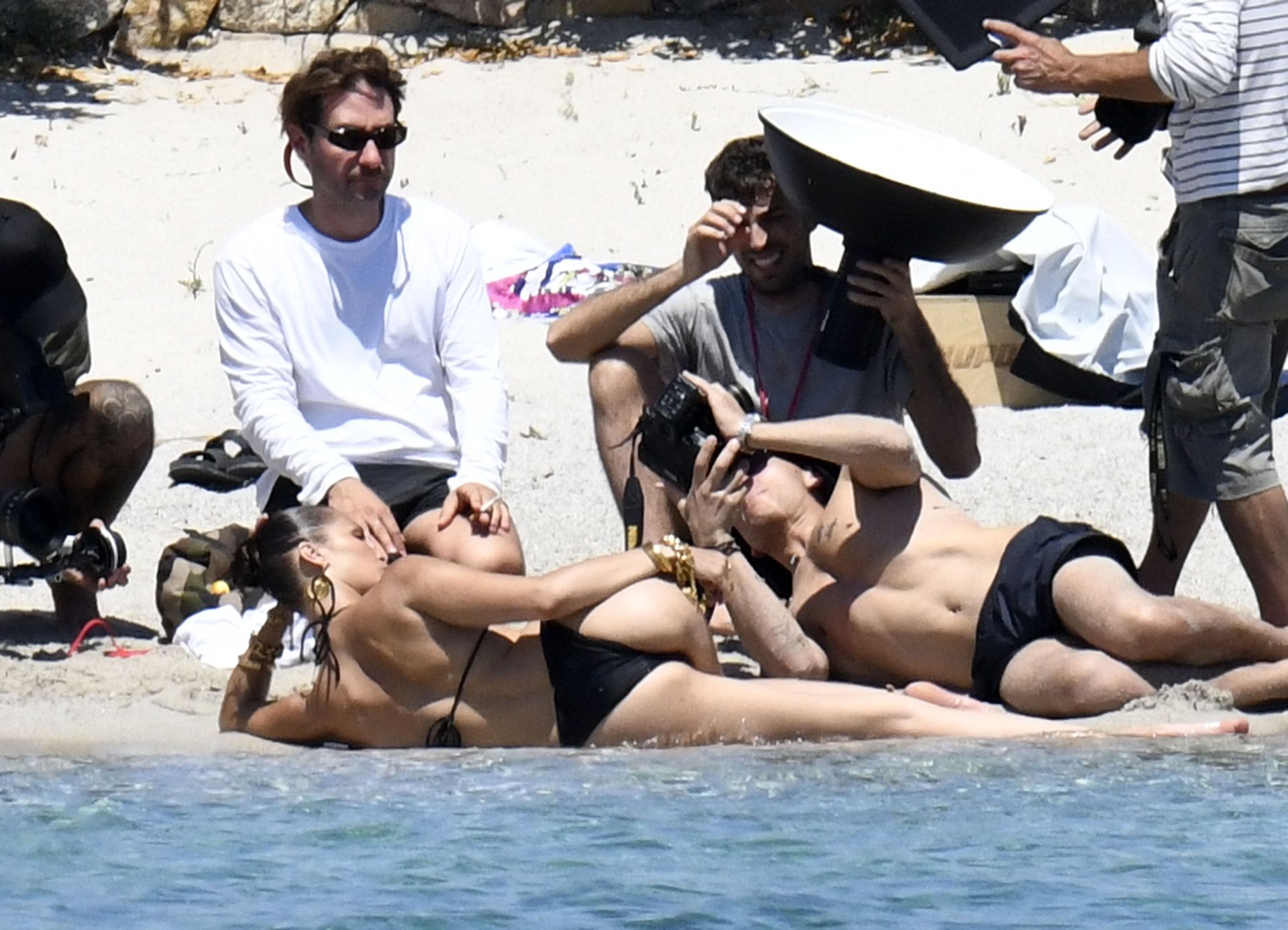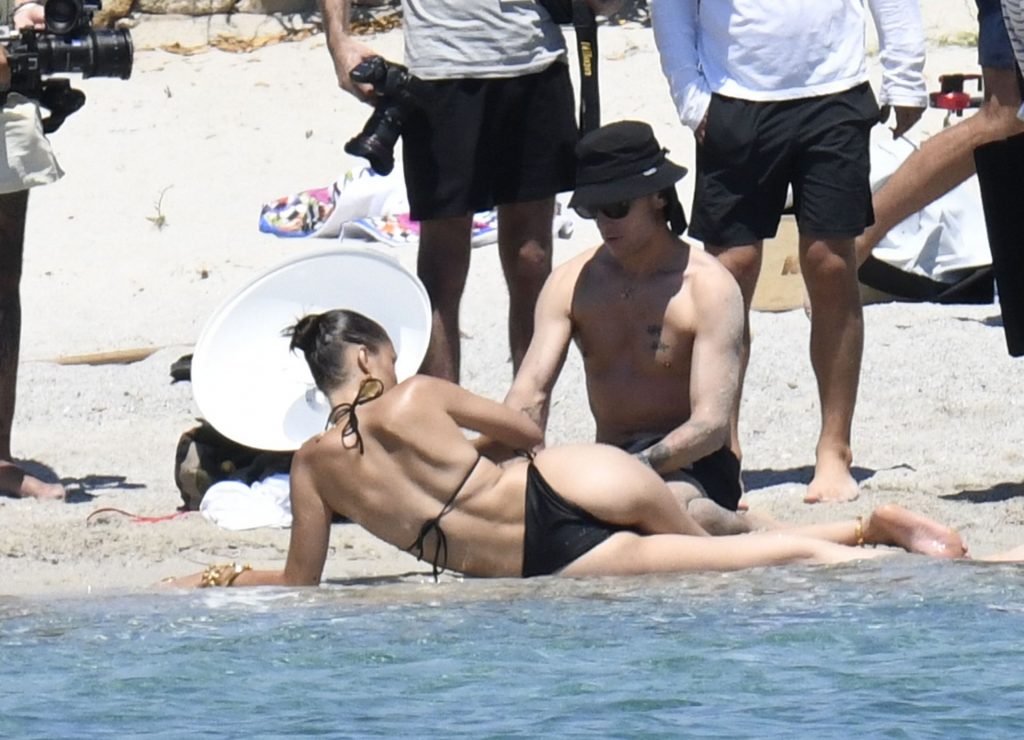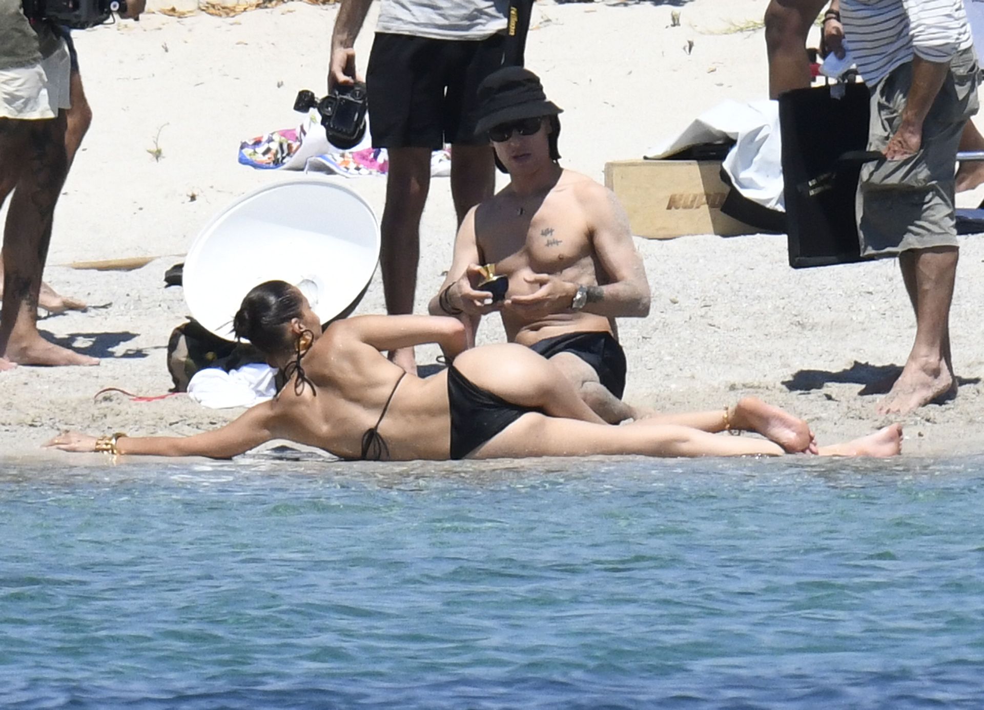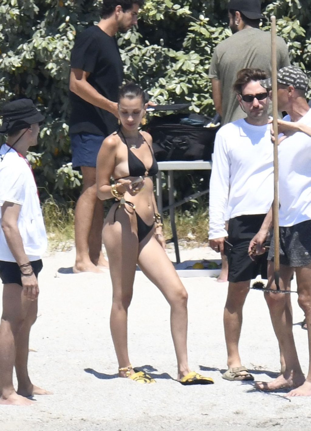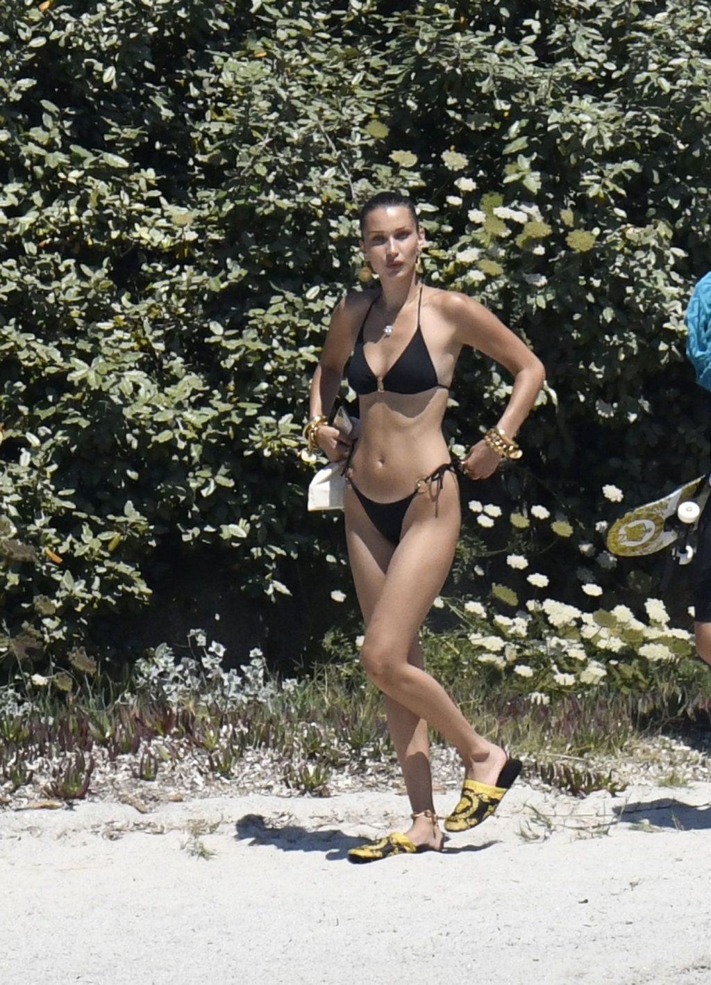 La modella Bella Hadid sfoggia il suo incredibile fisico in un bikini nero durante un servizio fotografico in Corsica, 24/06/2020.