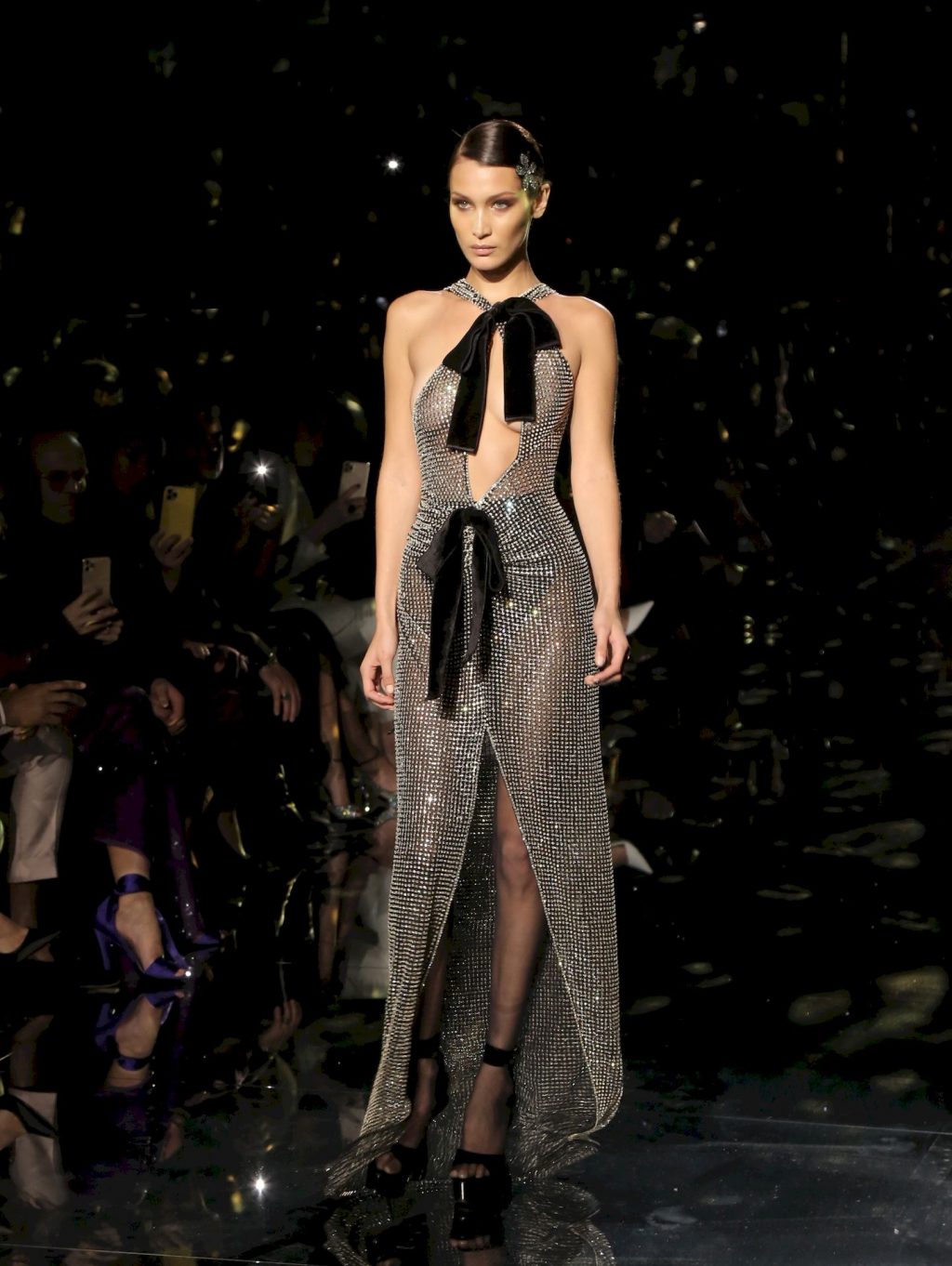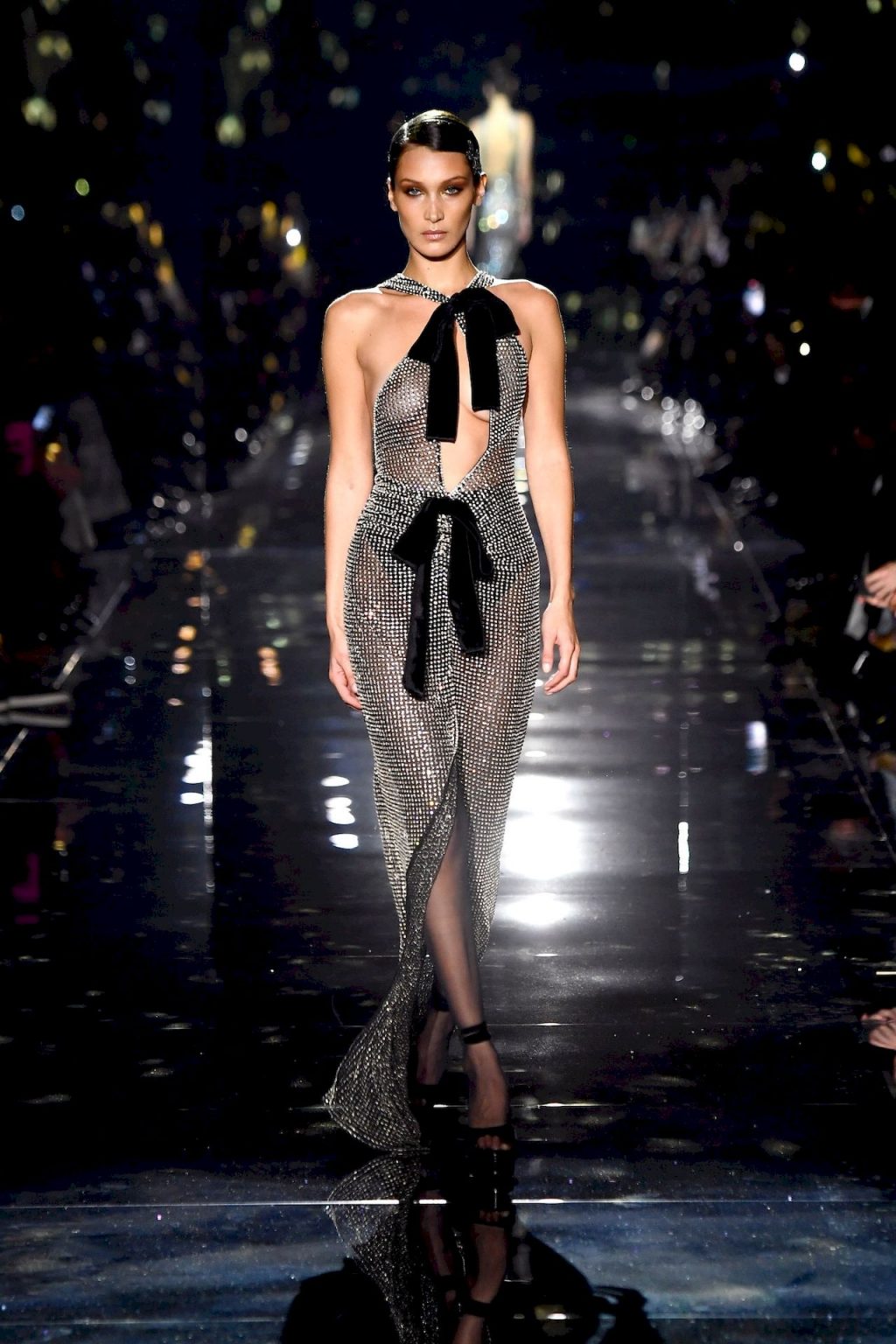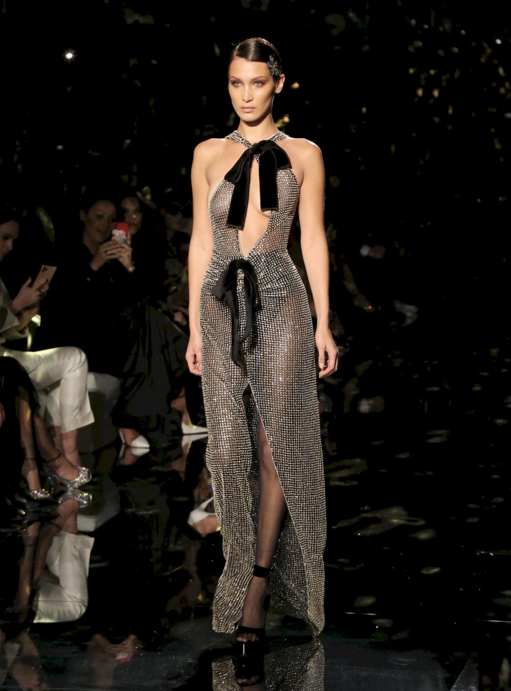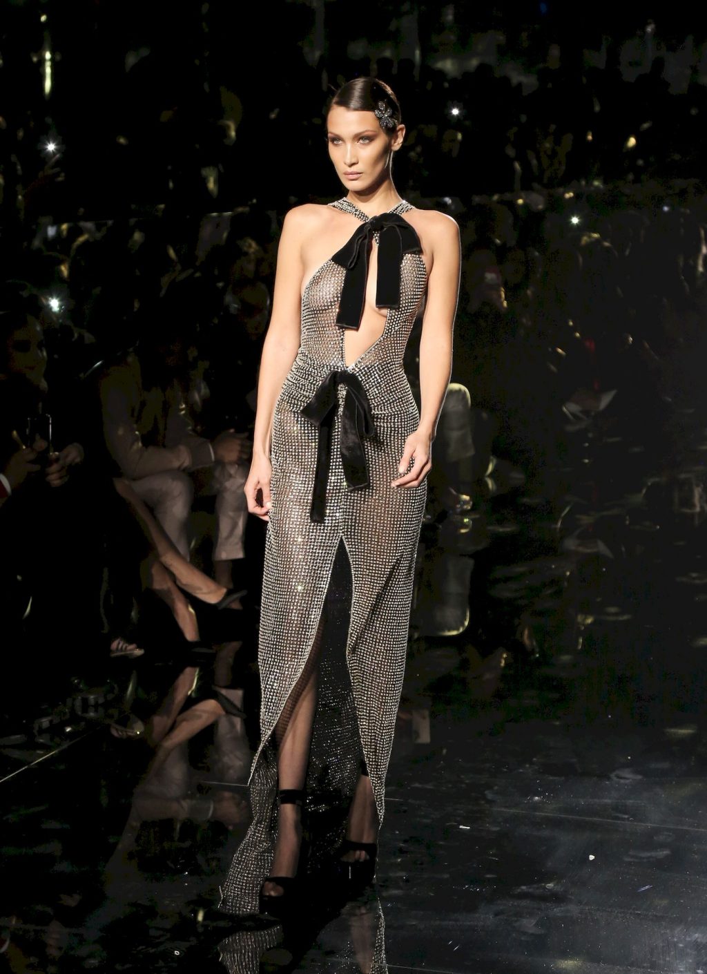 Modella Bella Hadid sfila con un abito trasparente, mostrando il suo seno nudo a tutti gli ospiti della sfilata di moda a Hollywood, 02/07/2020.