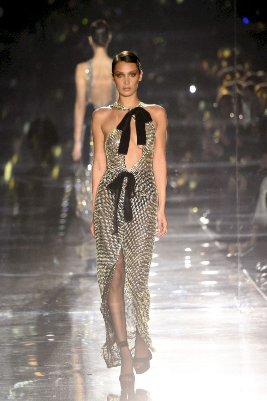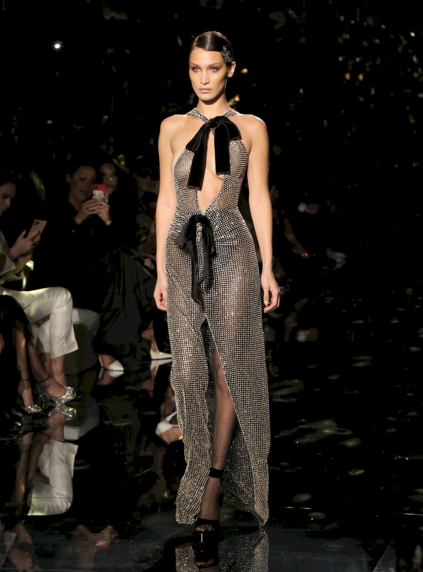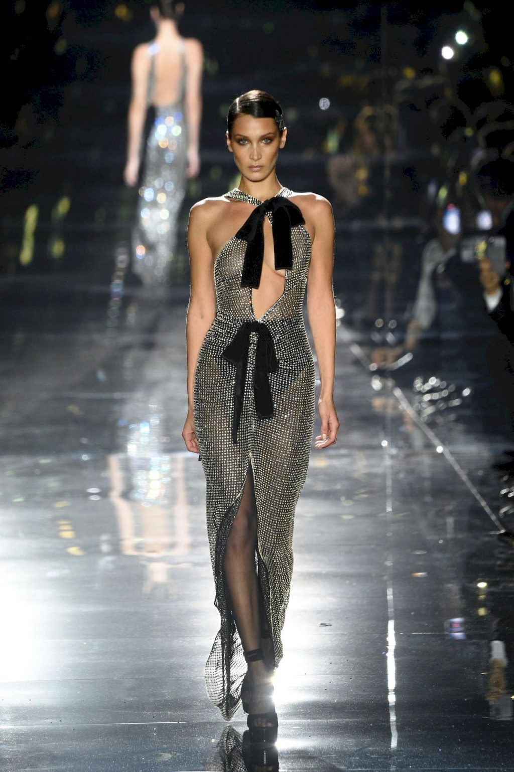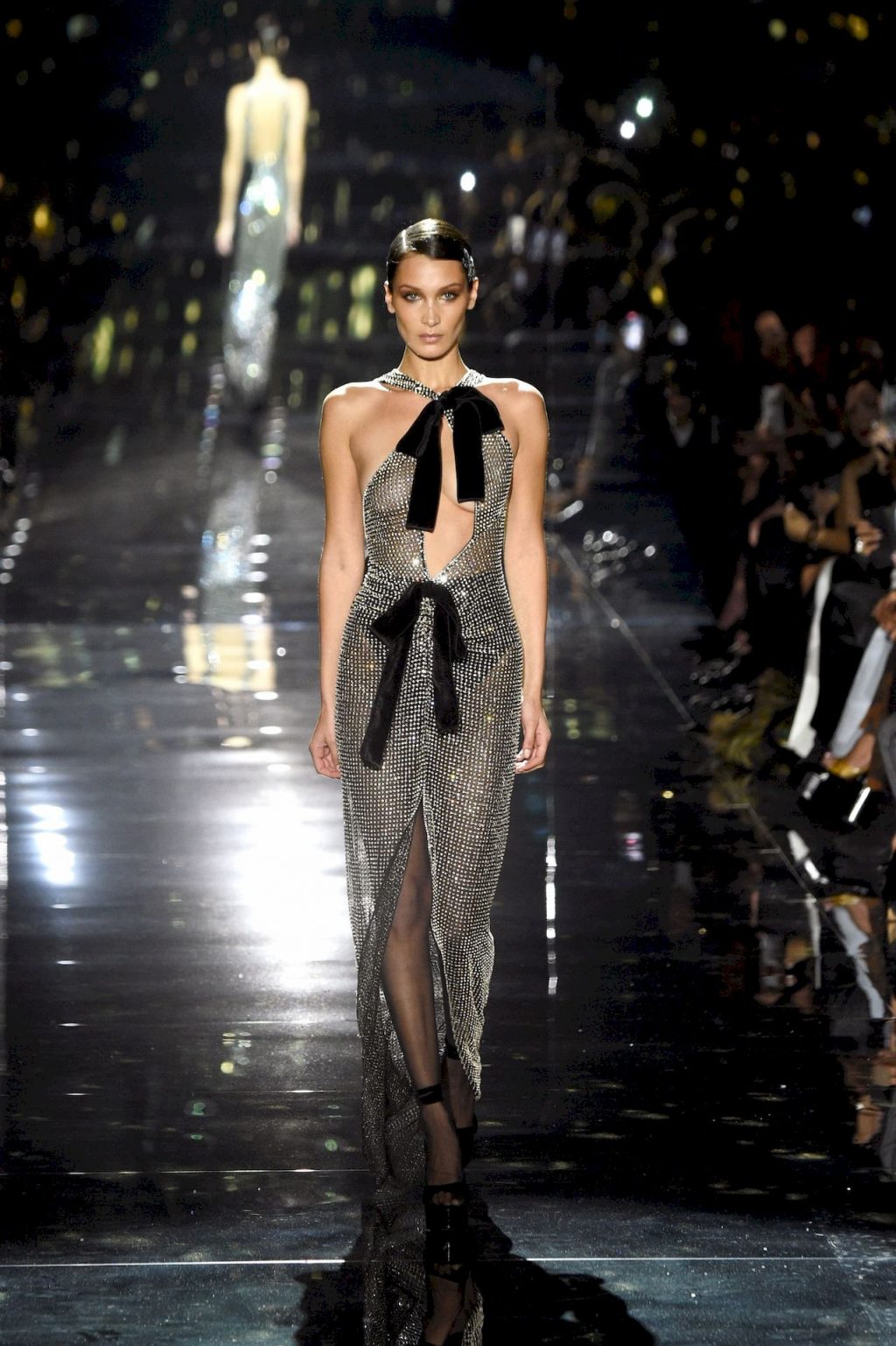 Modella Bella Hadid sfila con un abito trasparente, mostrando il suo seno nudo a tutti gli ospiti della sfilata di moda a Hollywood, 02/07/2020.