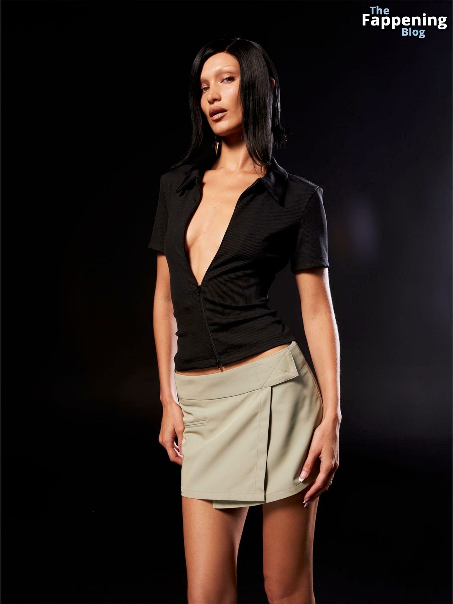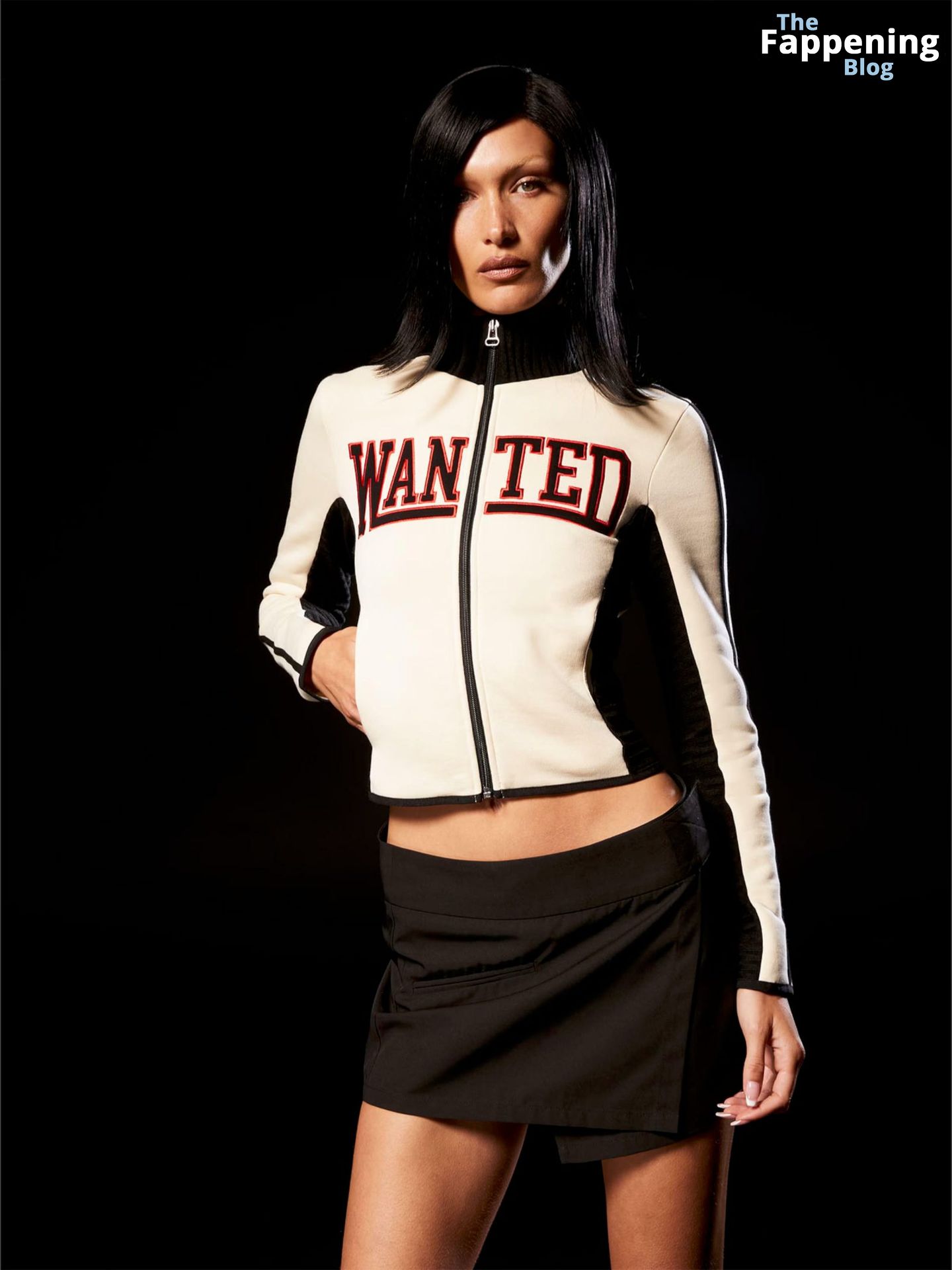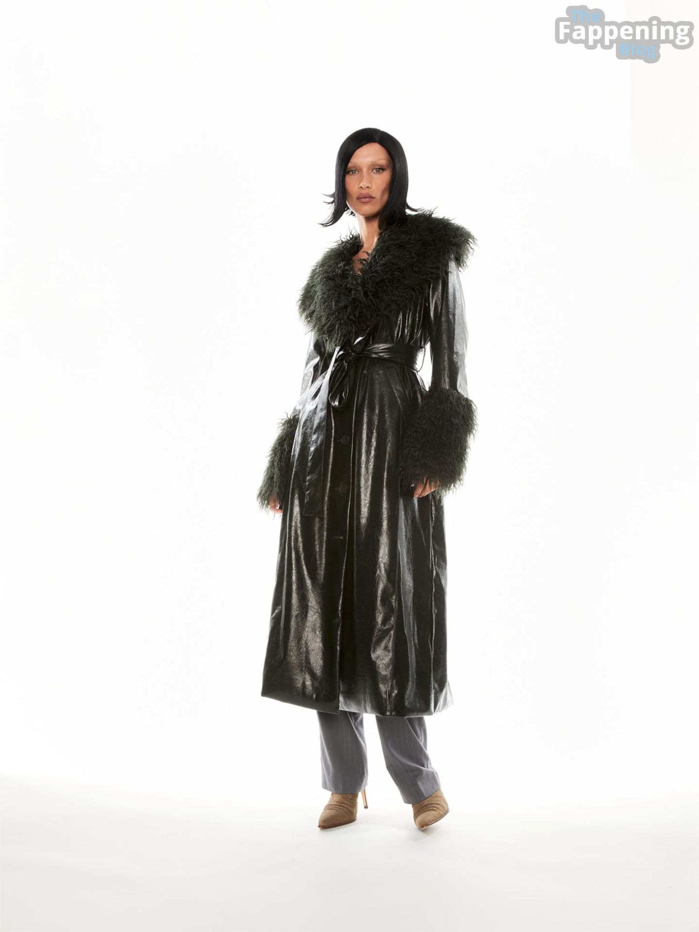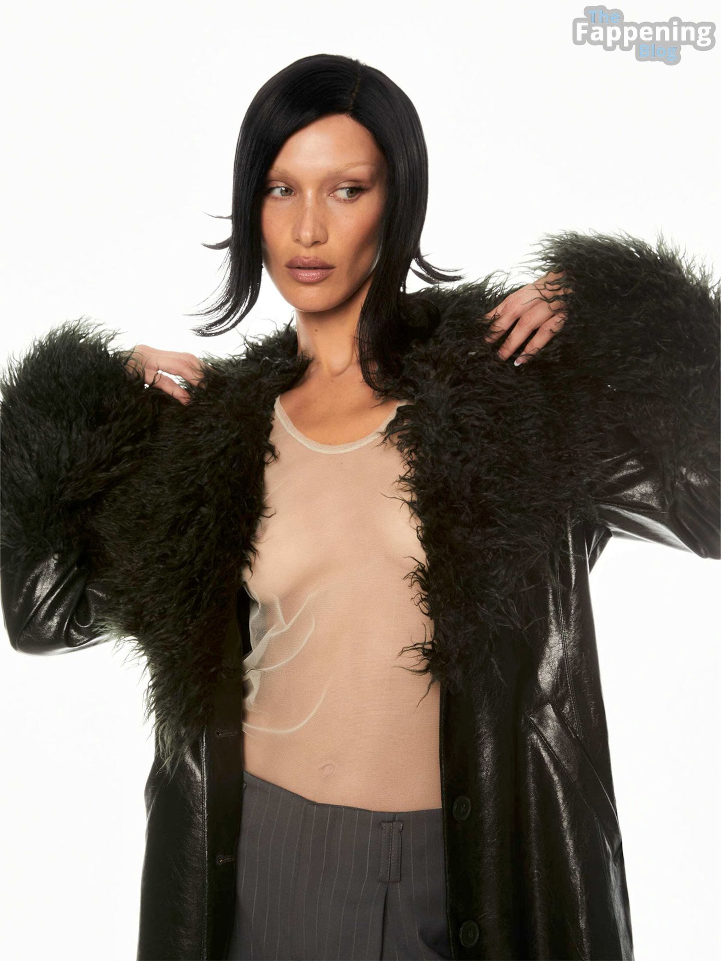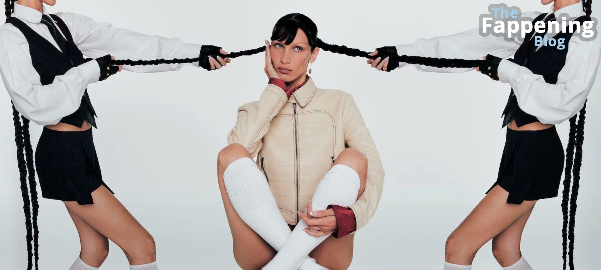 Bella Hadid sfoggia le sue gambe attraenti e posa senza reggiseno nella collezione autunno/inverno per “About You”, mostrando i suoi capezzoli (2023).