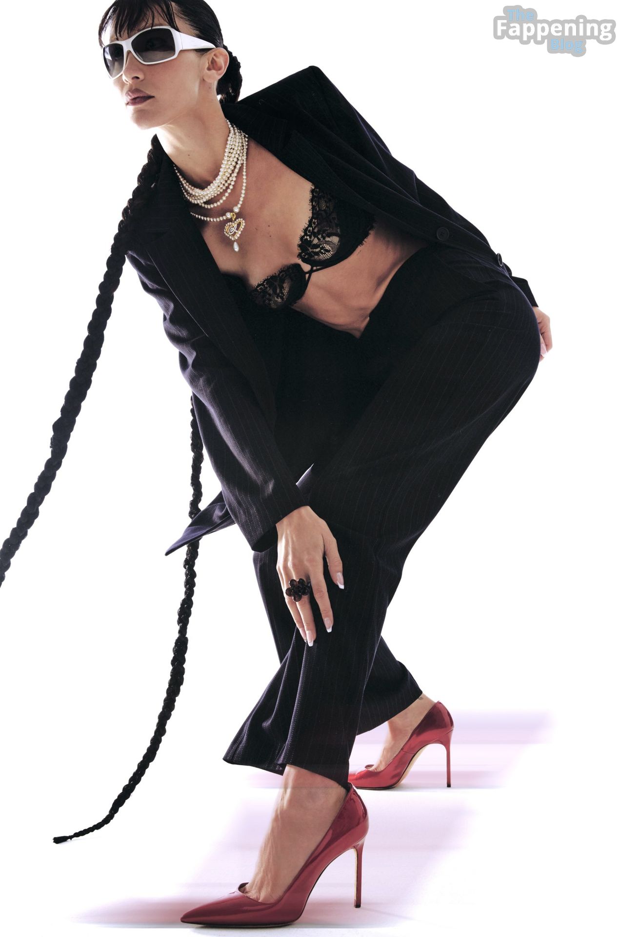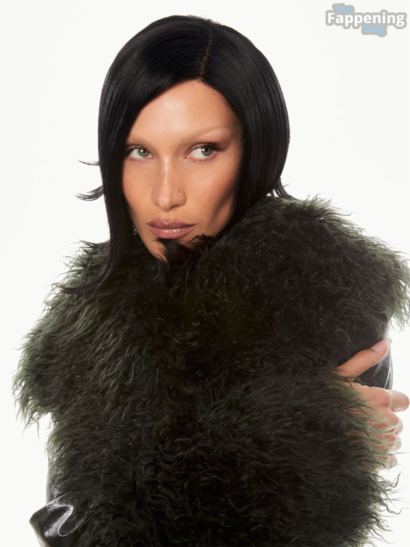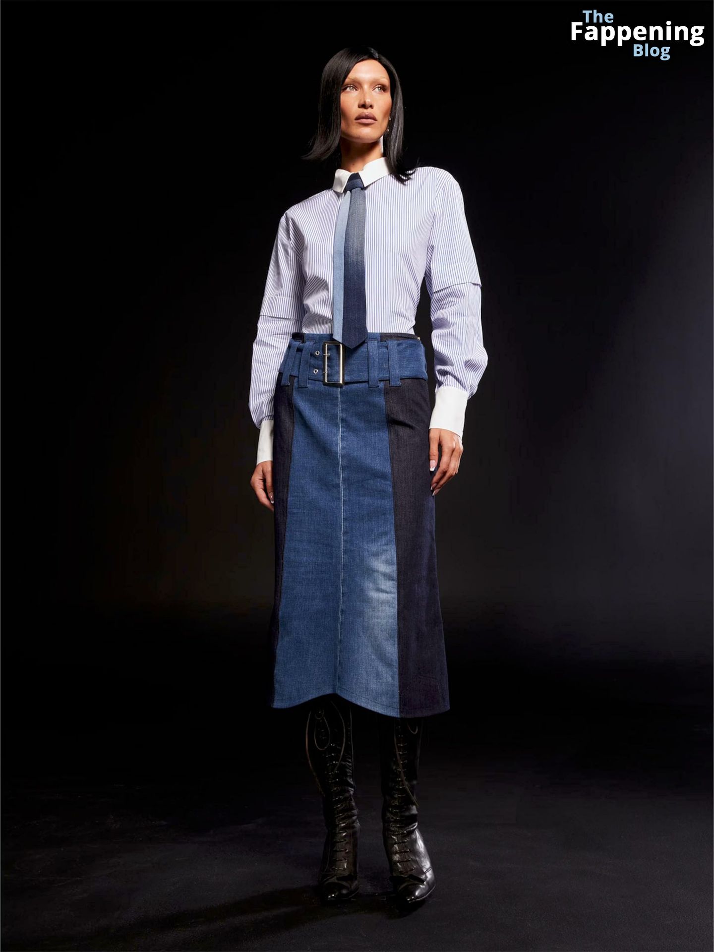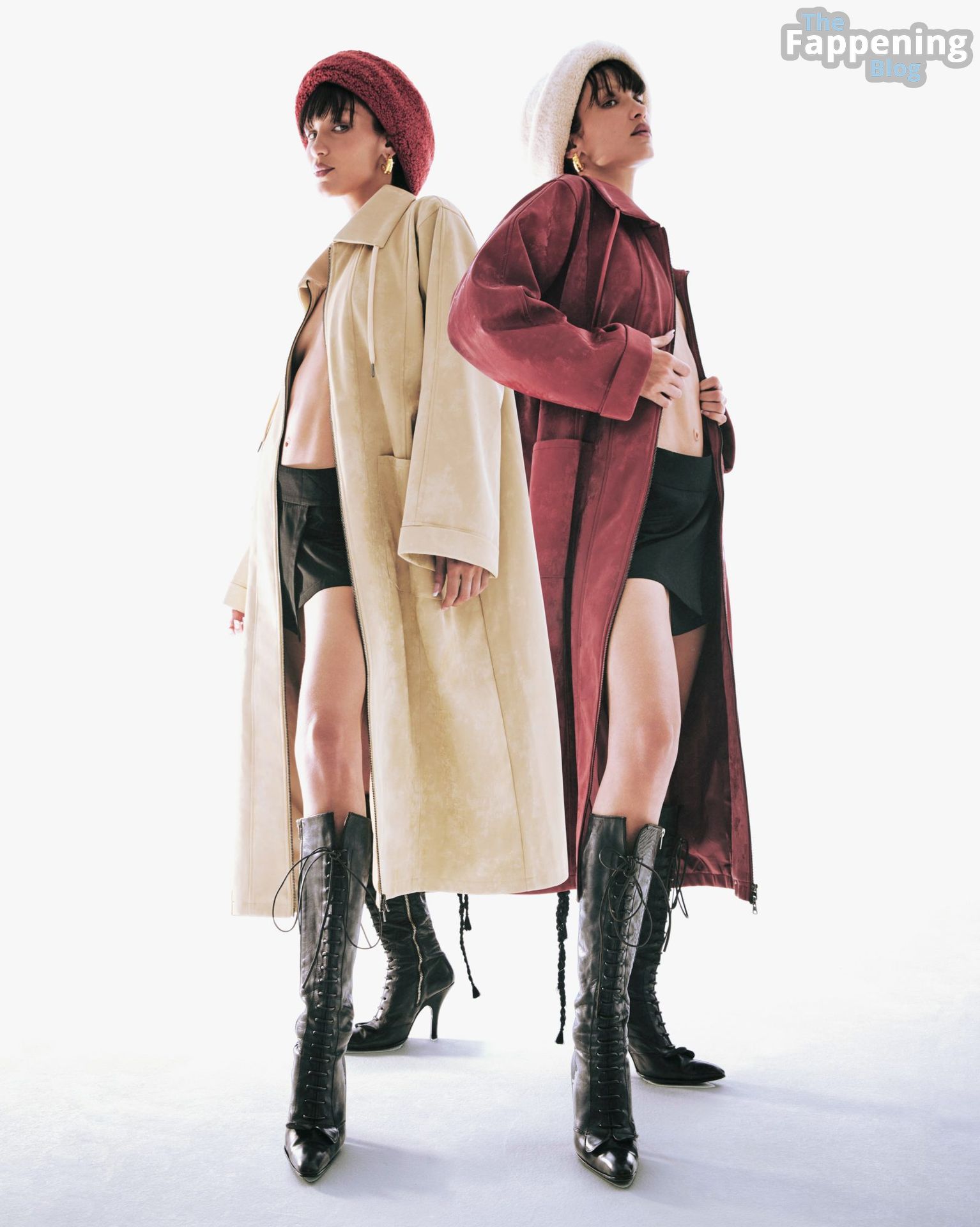 Bella Hadid sfoggia le sue gambe attraenti e posa senza reggiseno nella collezione autunno/inverno per “About You”, mostrando i suoi capezzoli (2023).