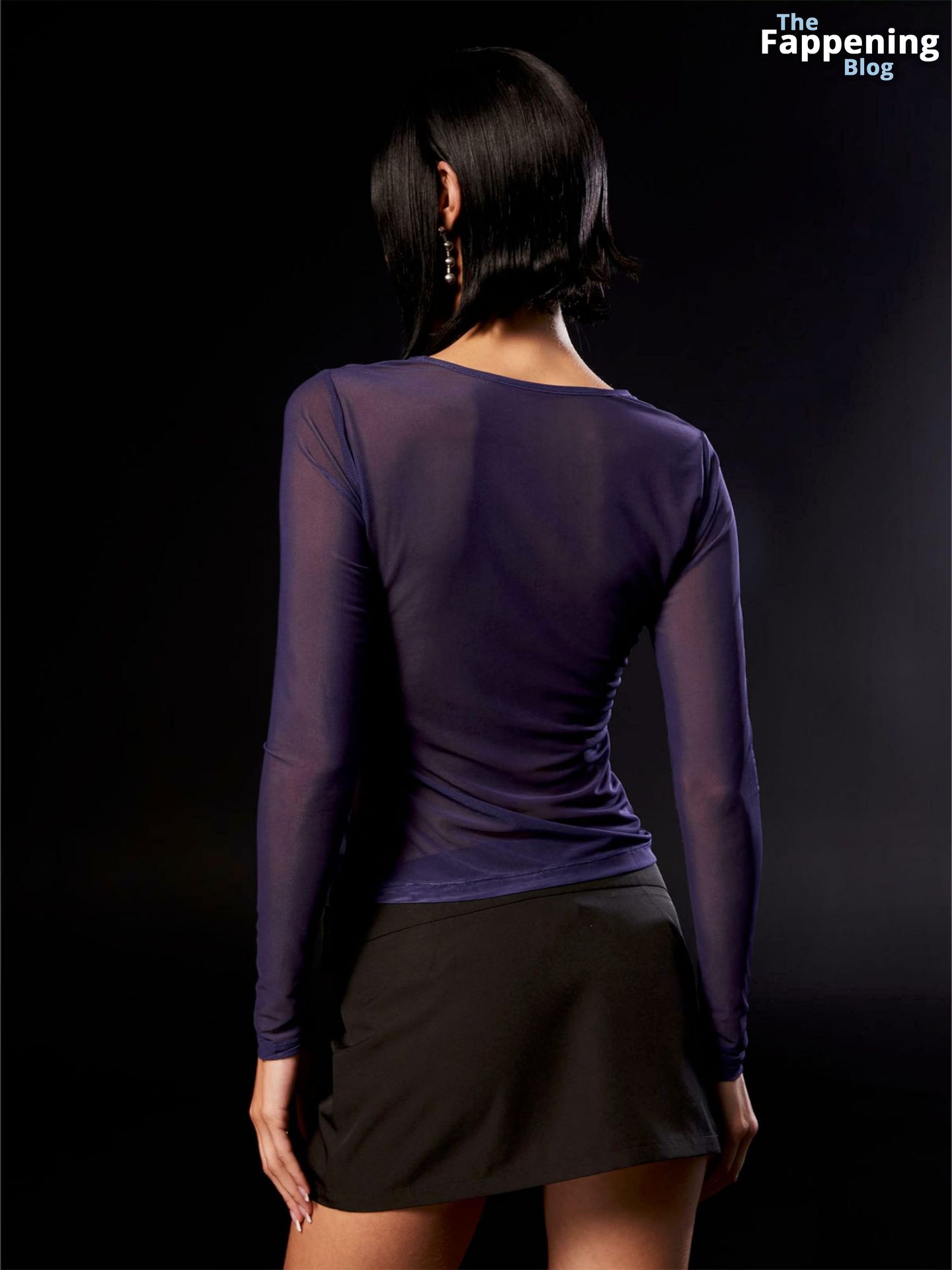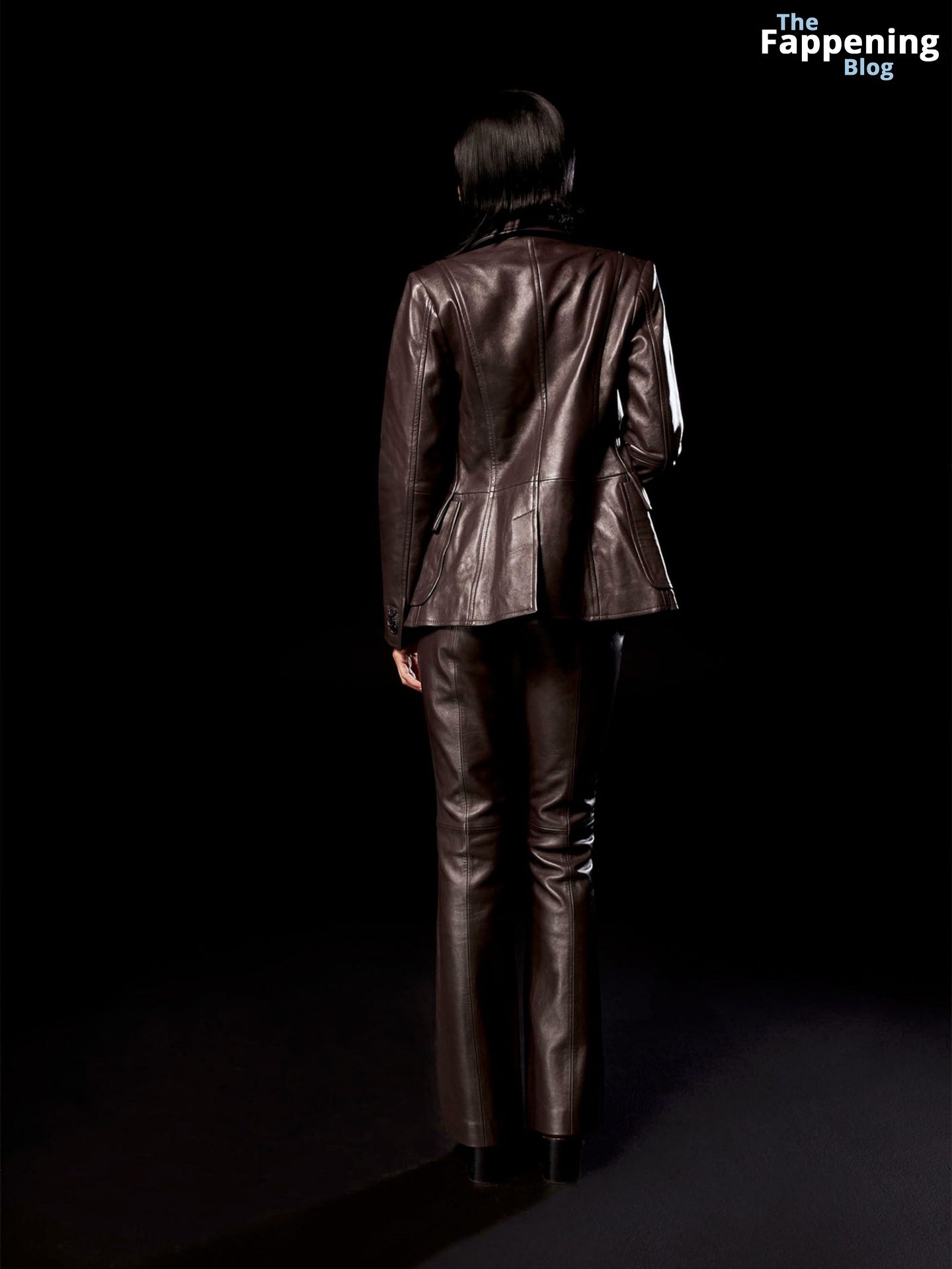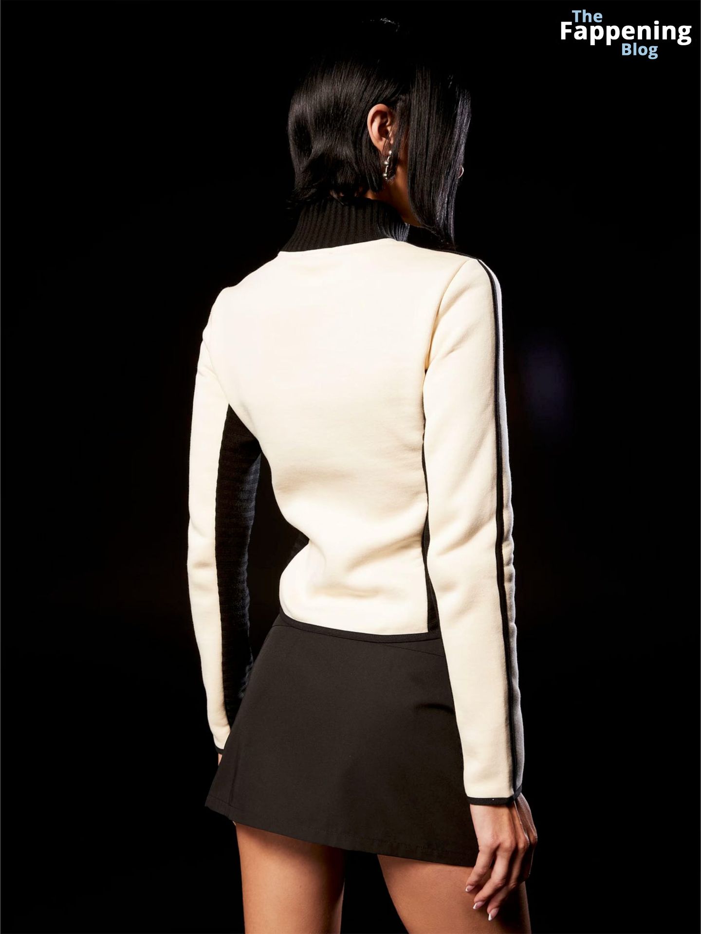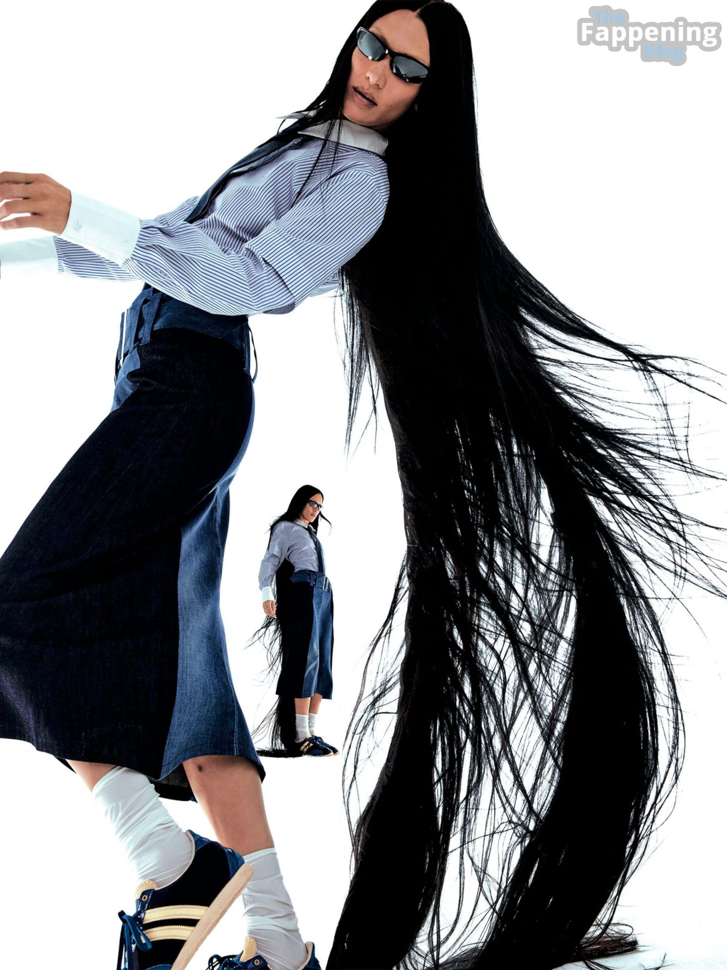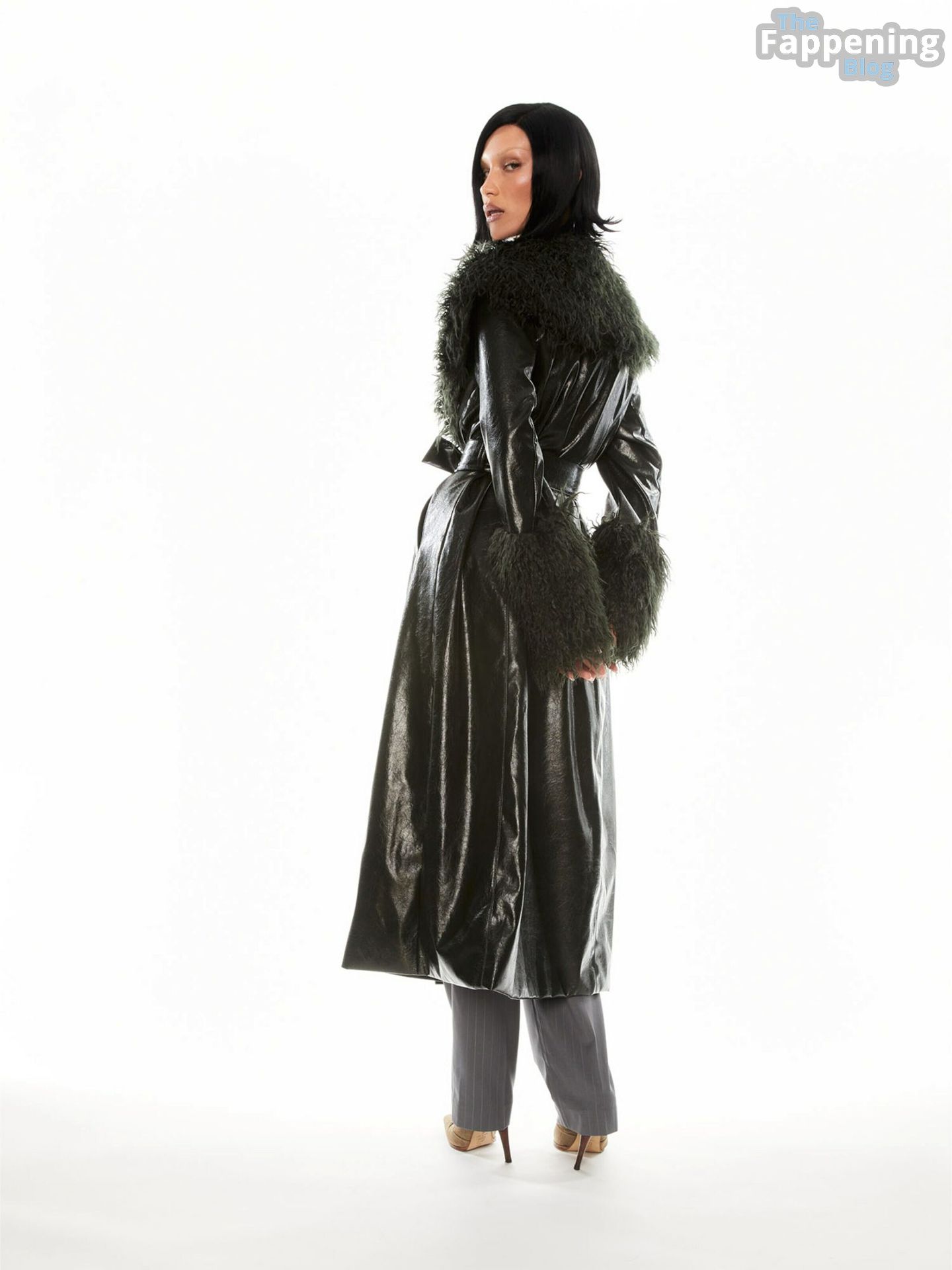 Bella Hadid sfoggia le sue gambe attraenti e posa senza reggiseno nella collezione autunno/inverno per “About You”, mostrando i suoi capezzoli (2023).