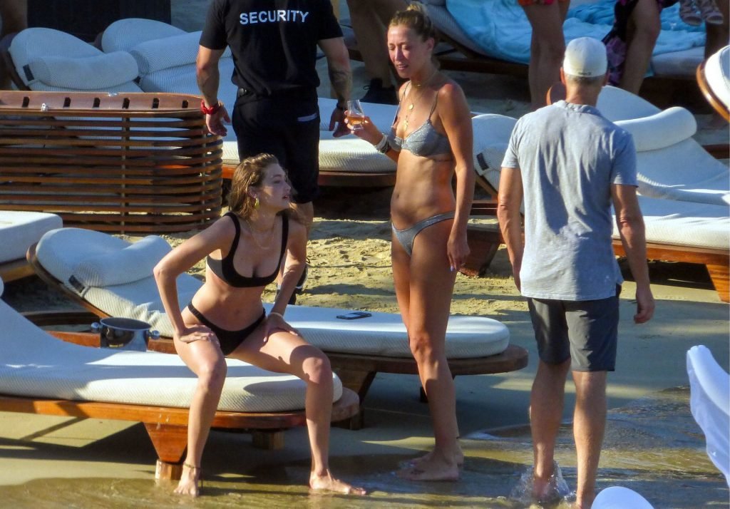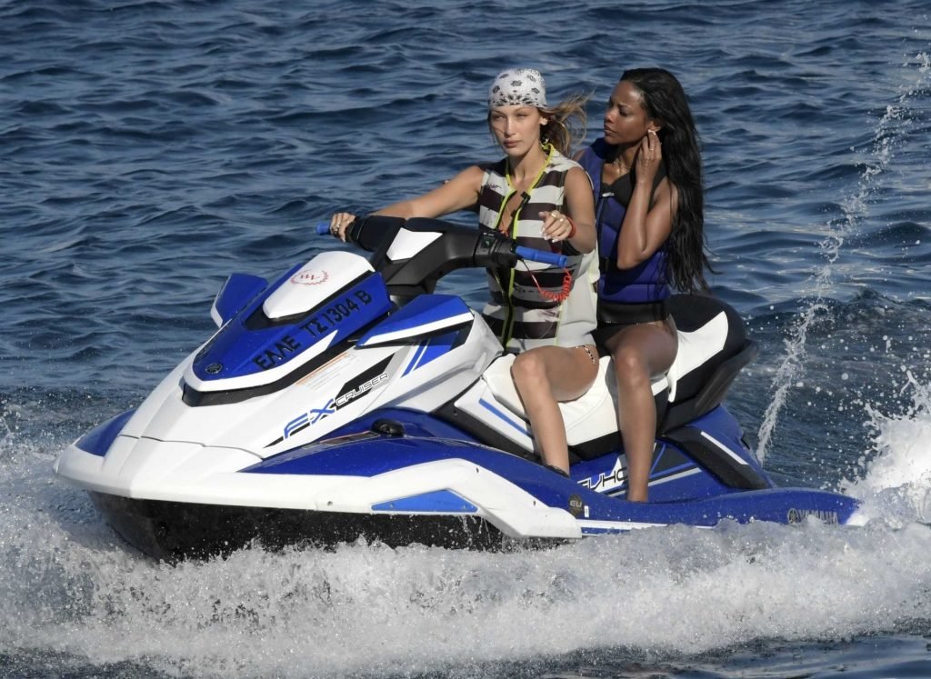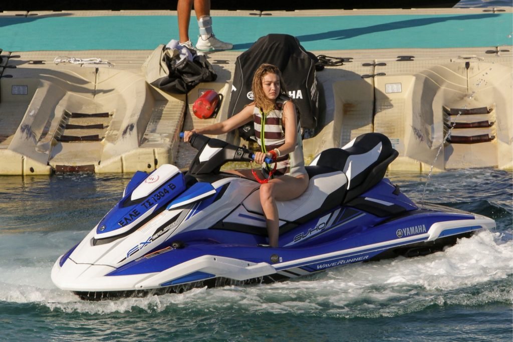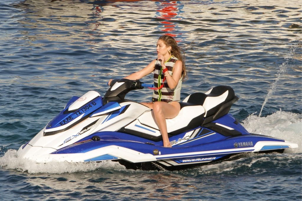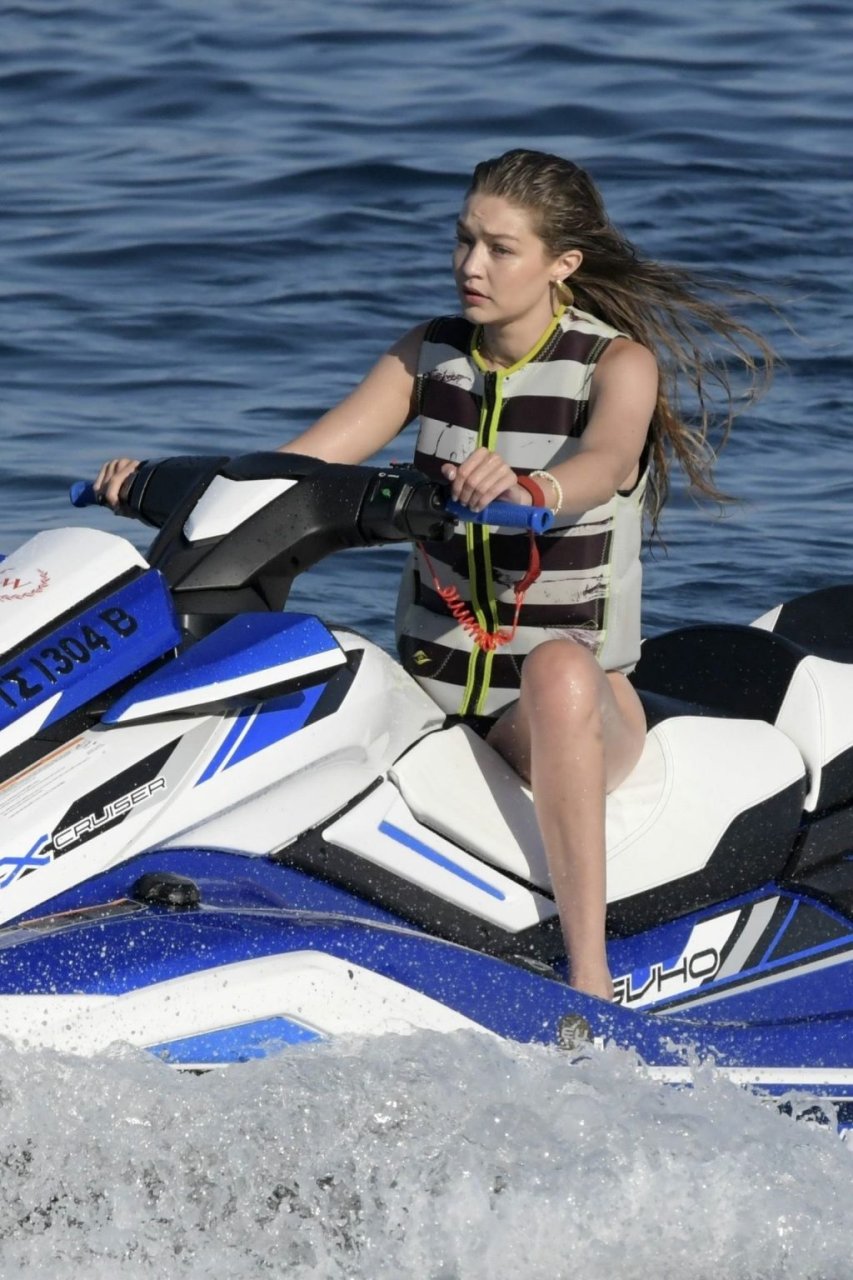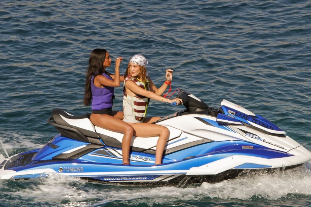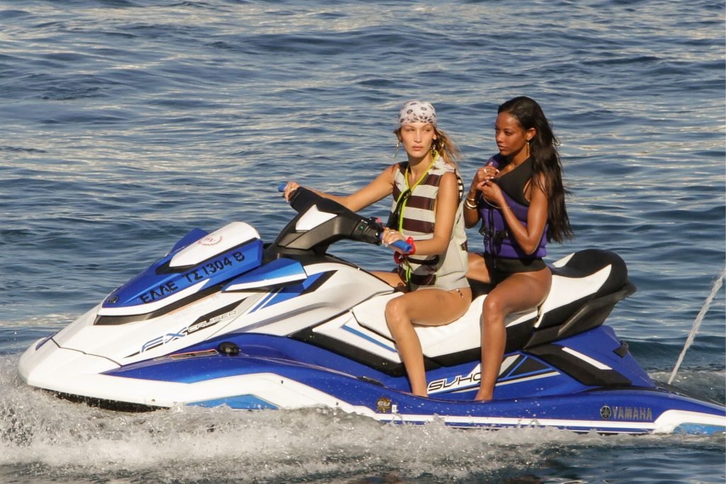 Gigi Hadid e la sorella Bella Hadid sembrano divertirsi sulla spiaggia dell’isola di Mykonos, Grecia, 30/07/2019. Guidano il jet ski. Incontrano gli amici Dean e Dan sulla spiaggia di Nammos.