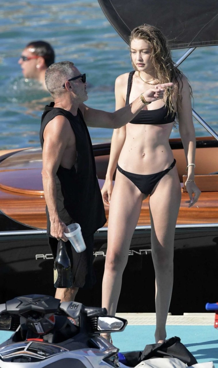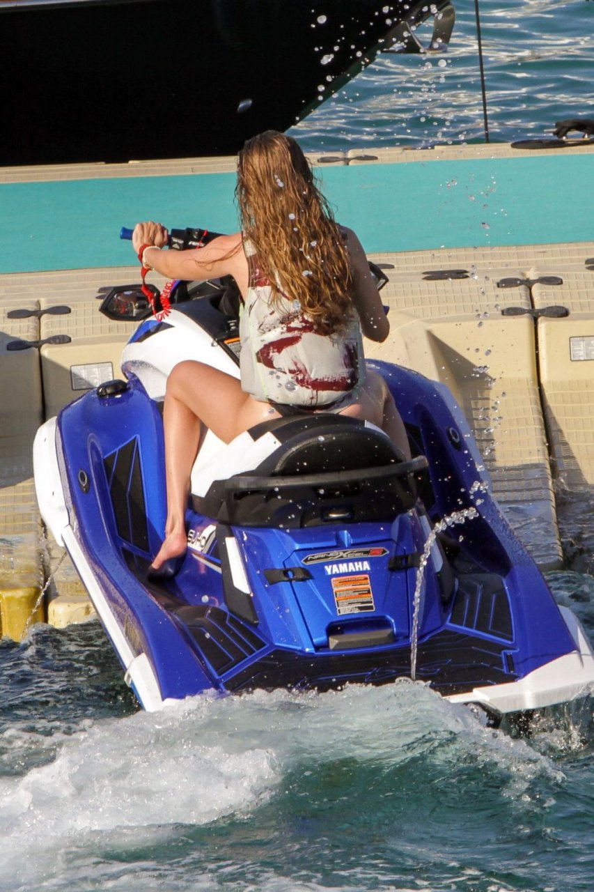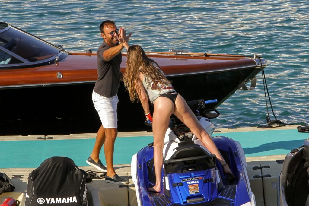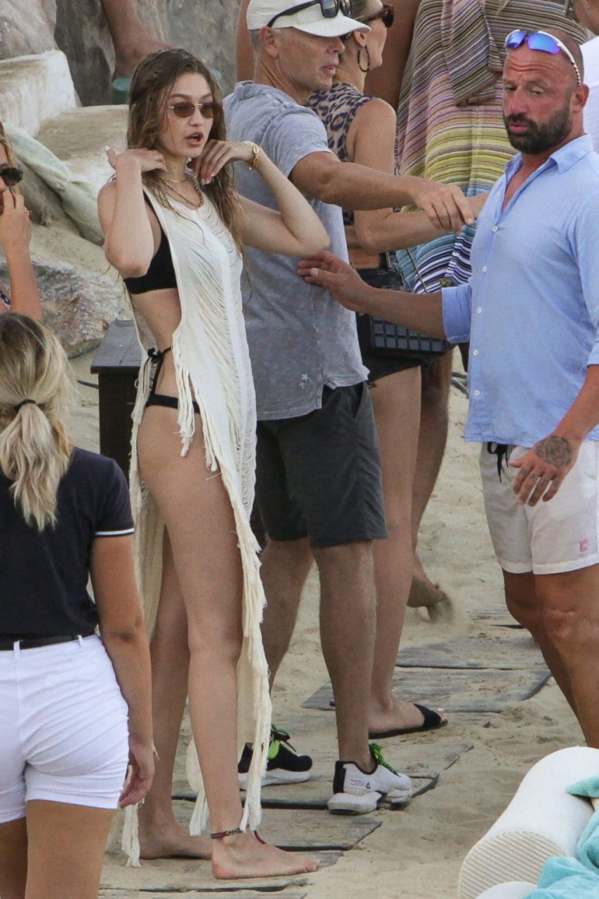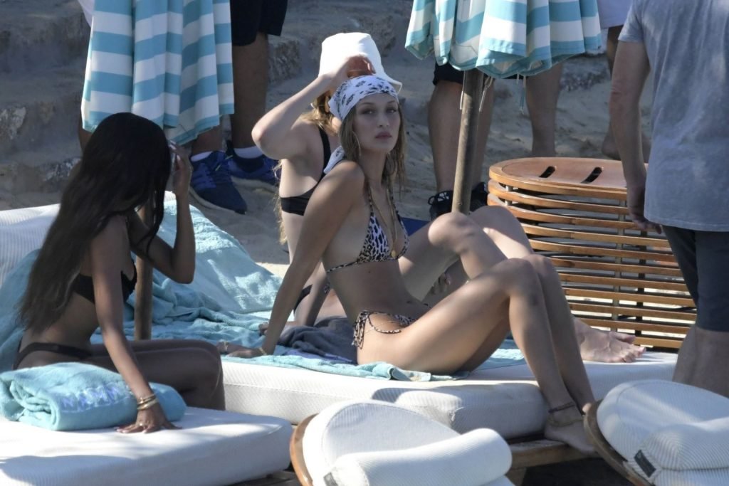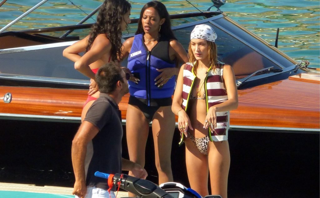 Gigi Hadid e la sorella Bella Hadid sembrano divertirsi sulla spiaggia dell’isola di Mykonos, Grecia, 30/07/2019. Guidano il jet ski. Incontrano gli amici Dean e Dan sulla spiaggia di Nammos.