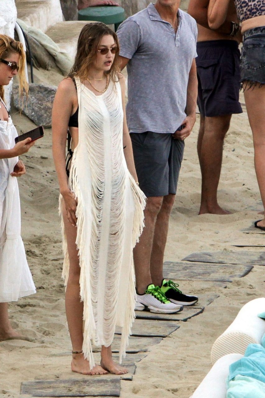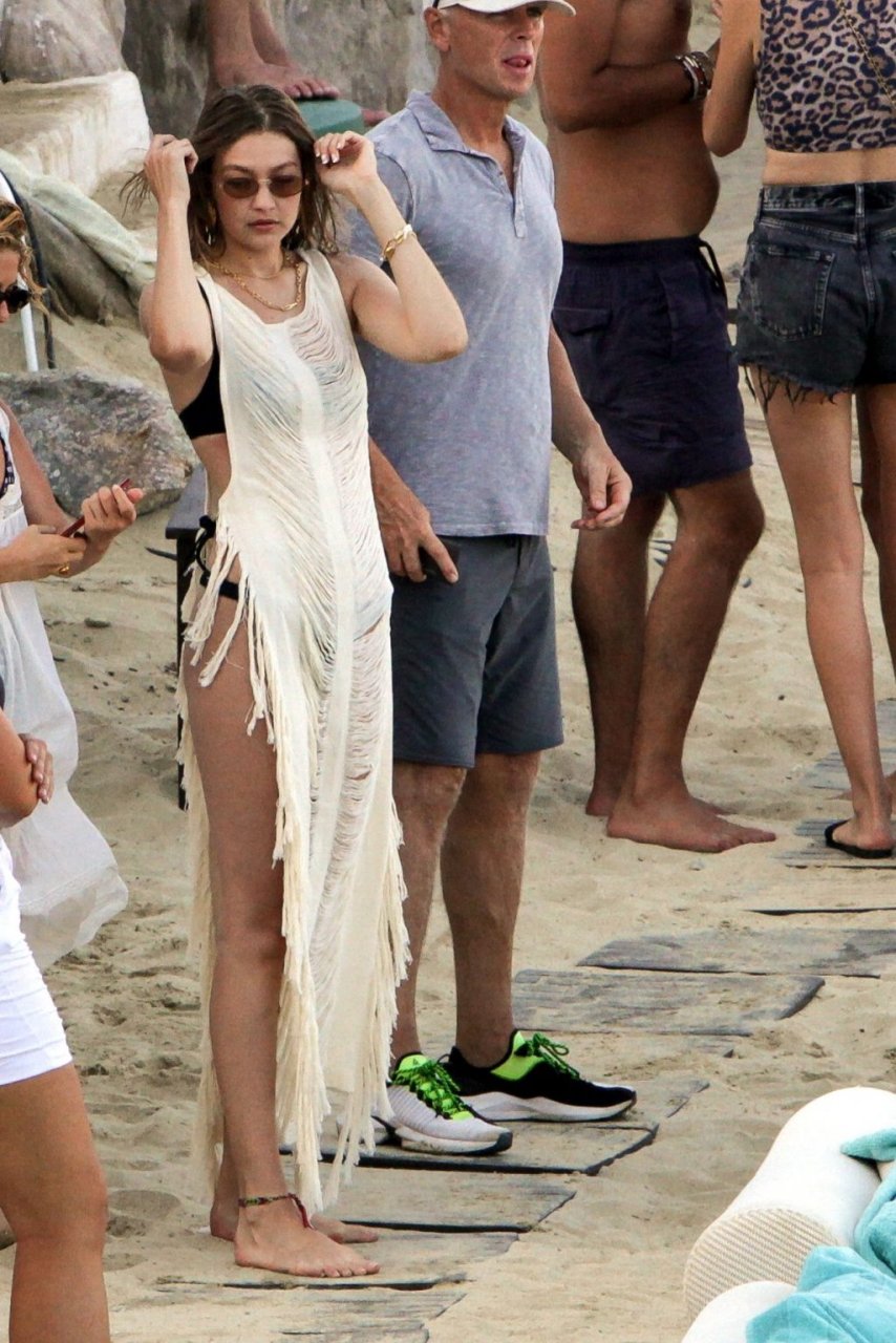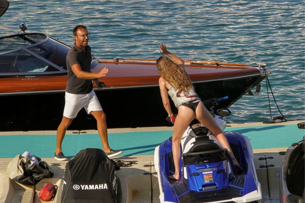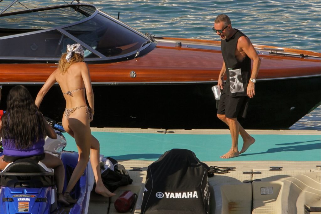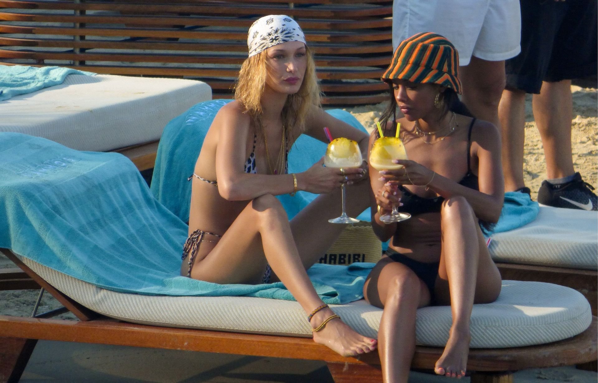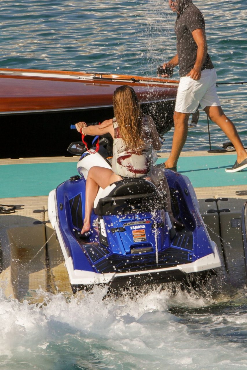 Gigi Hadid e la sorella Bella Hadid sembrano divertirsi sulla spiaggia dell’isola di Mykonos, Grecia, 30/07/2019. Guidano il jet ski. Incontrano gli amici Dean e Dan sulla spiaggia di Nammos.