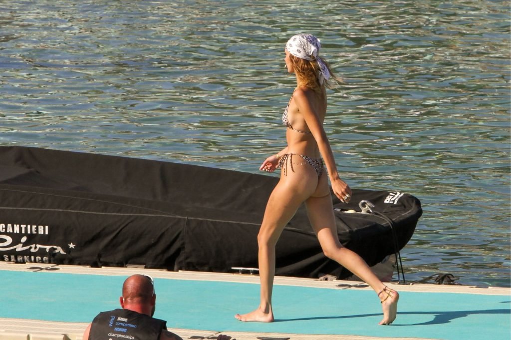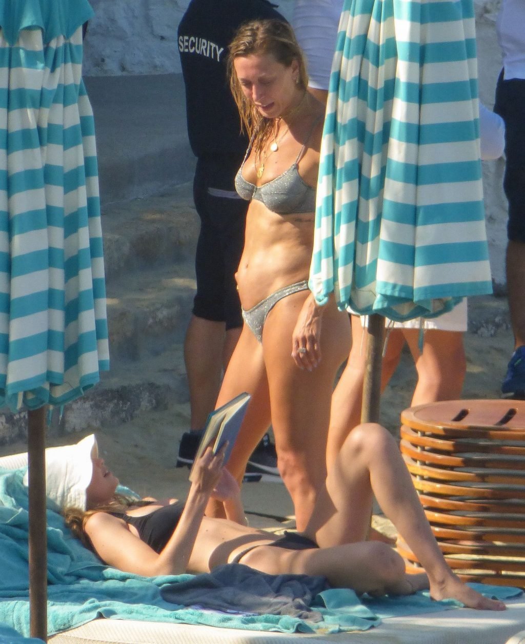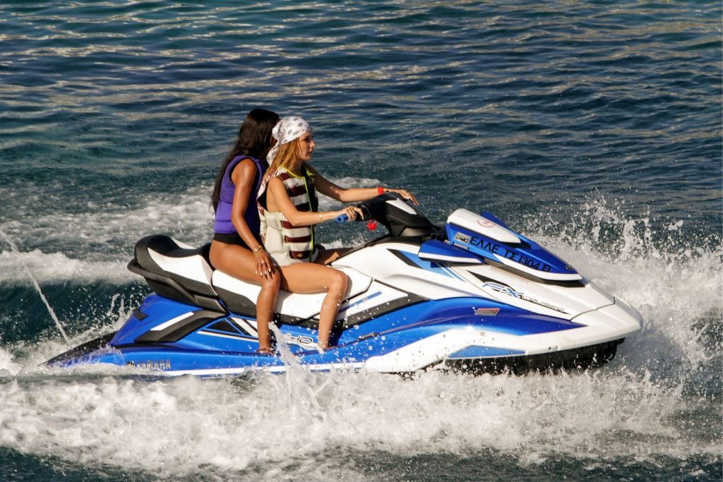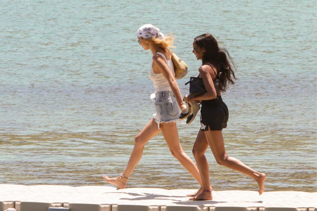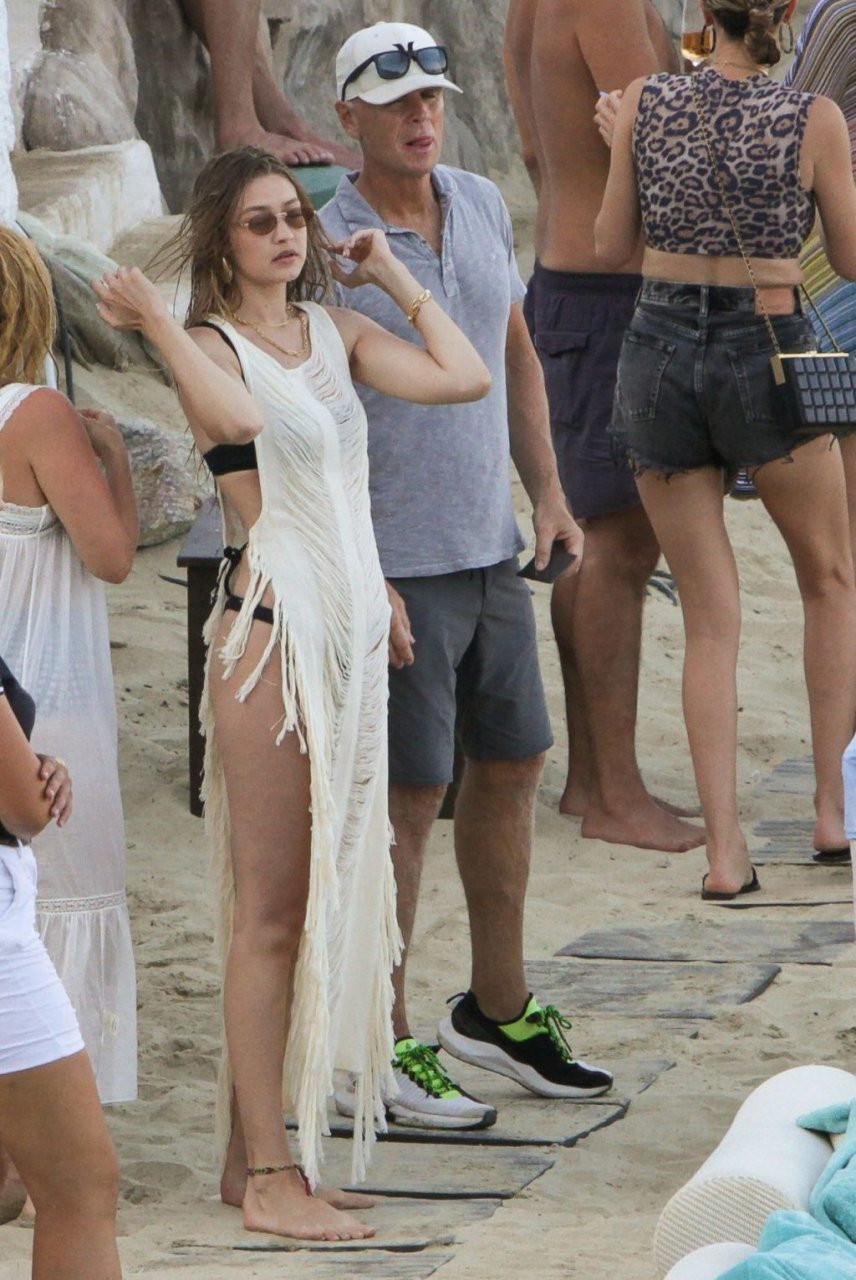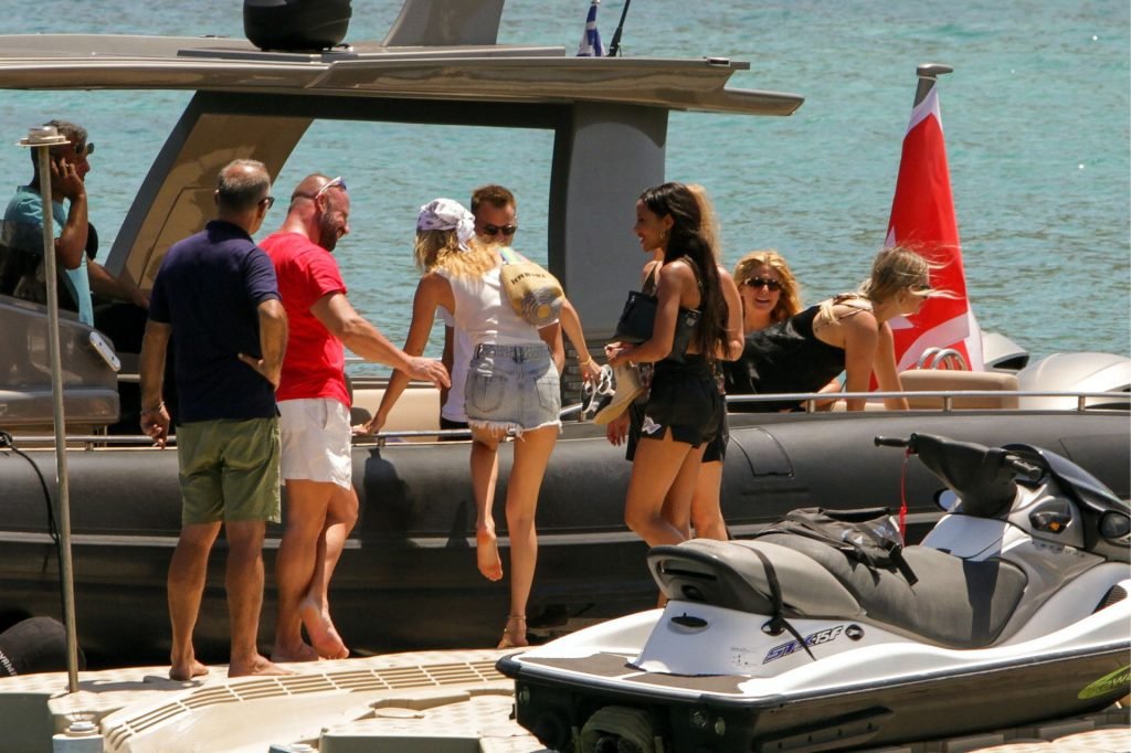 Gigi Hadid e la sorella Bella Hadid sembrano divertirsi sulla spiaggia dell’isola di Mykonos, Grecia, 30/07/2019. Guidano il jet ski. Incontrano gli amici Dean e Dan sulla spiaggia di Nammos.