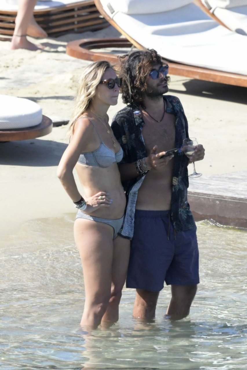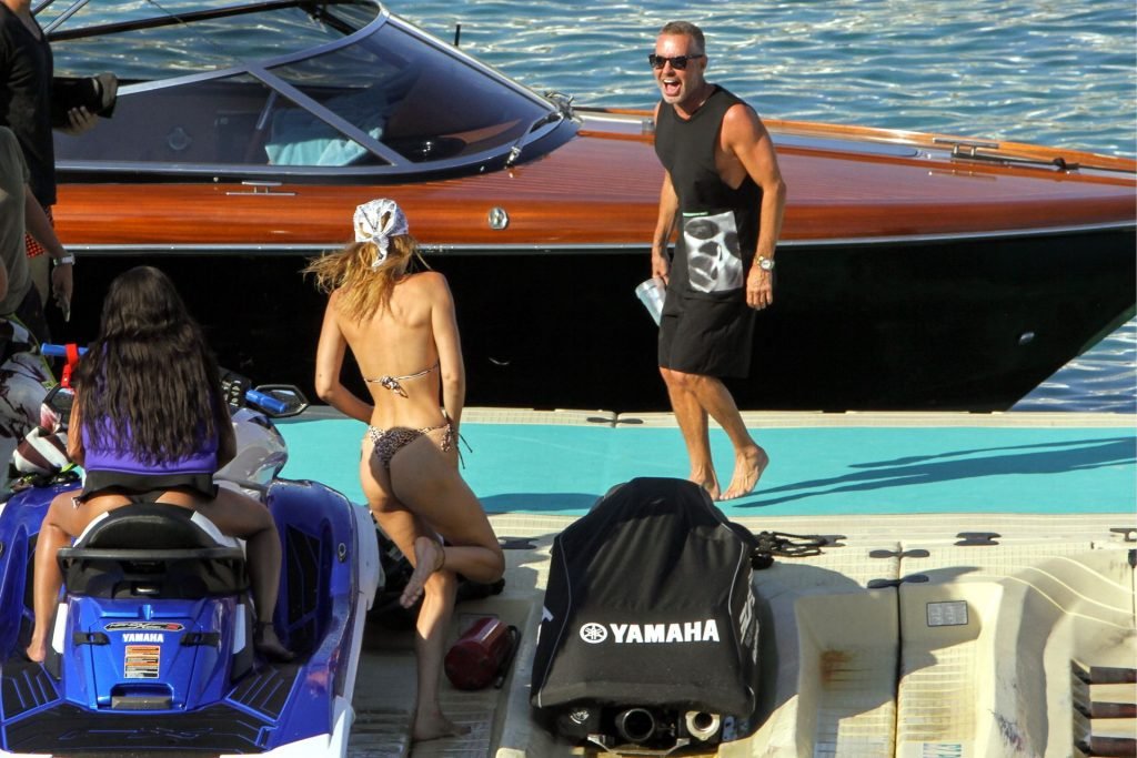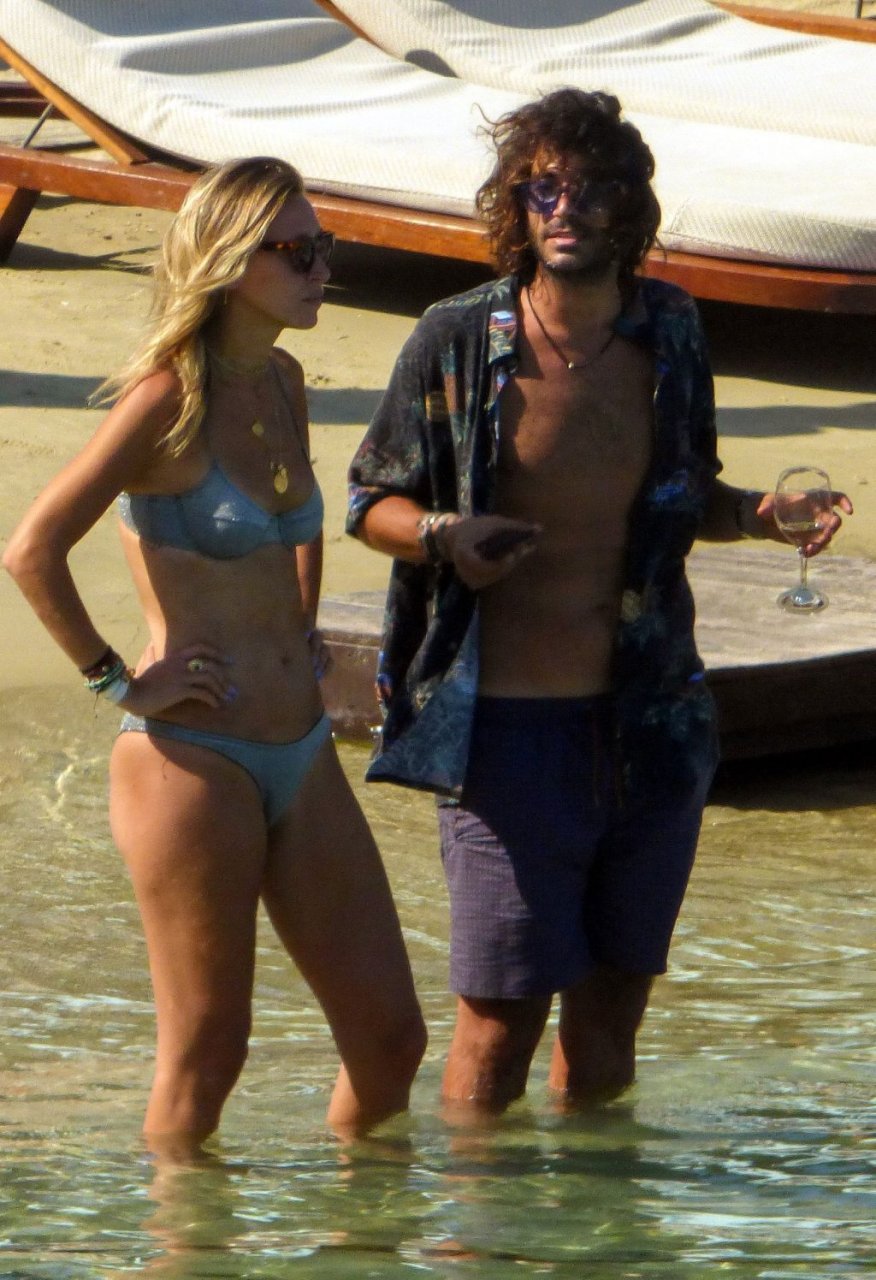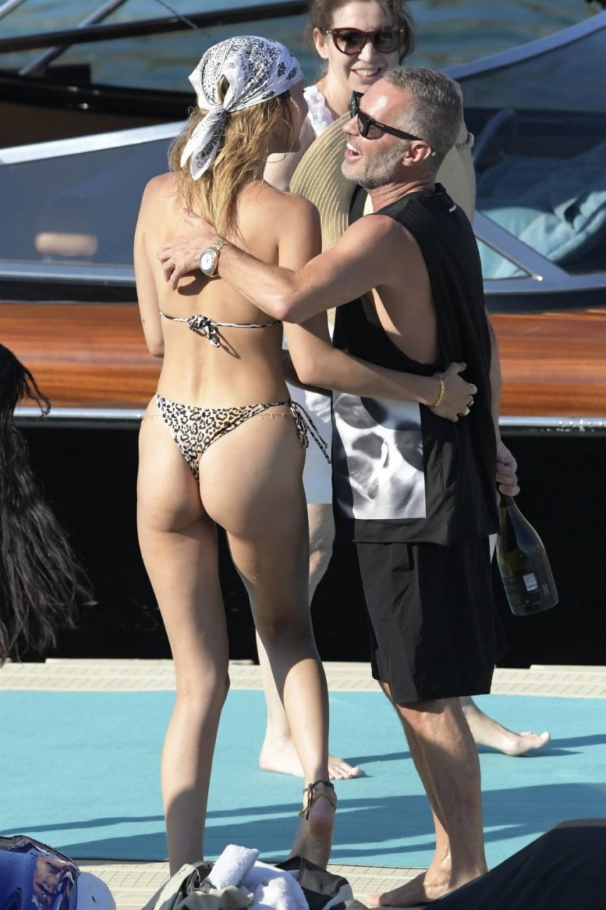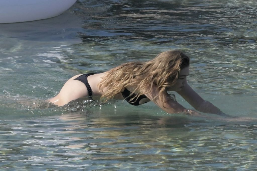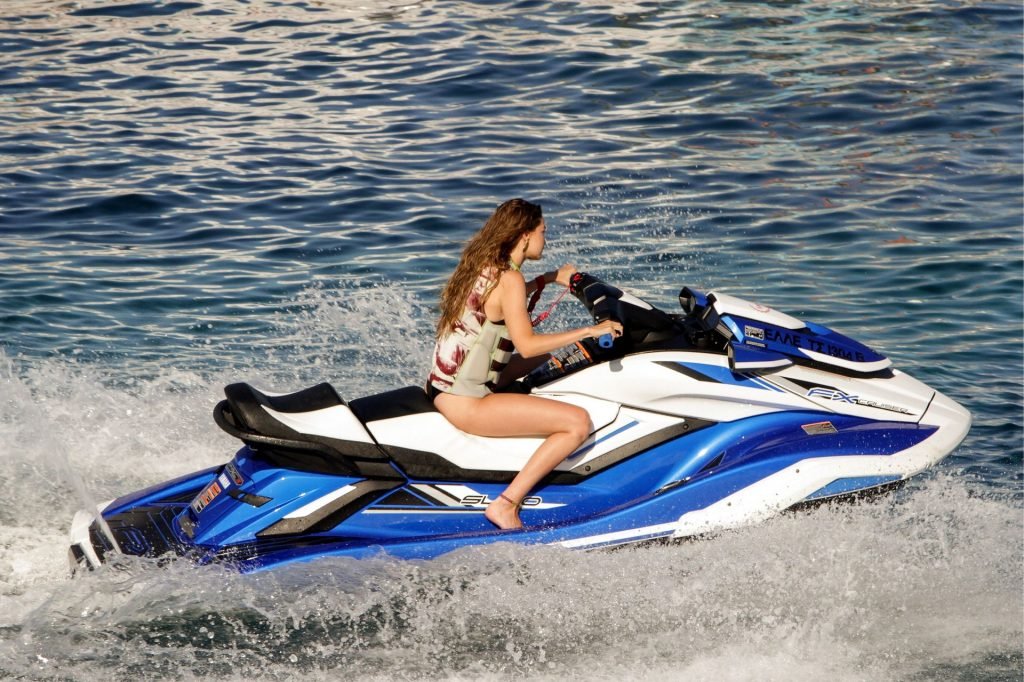Gigi Hadid e la sorella Bella Hadid sembrano divertirsi sulla spiaggia dell’isola di Mykonos, Grecia, 30/07/2019. Guidano il jet ski. Incontrano gli amici Dean e Dan sulla spiaggia di Nammos.