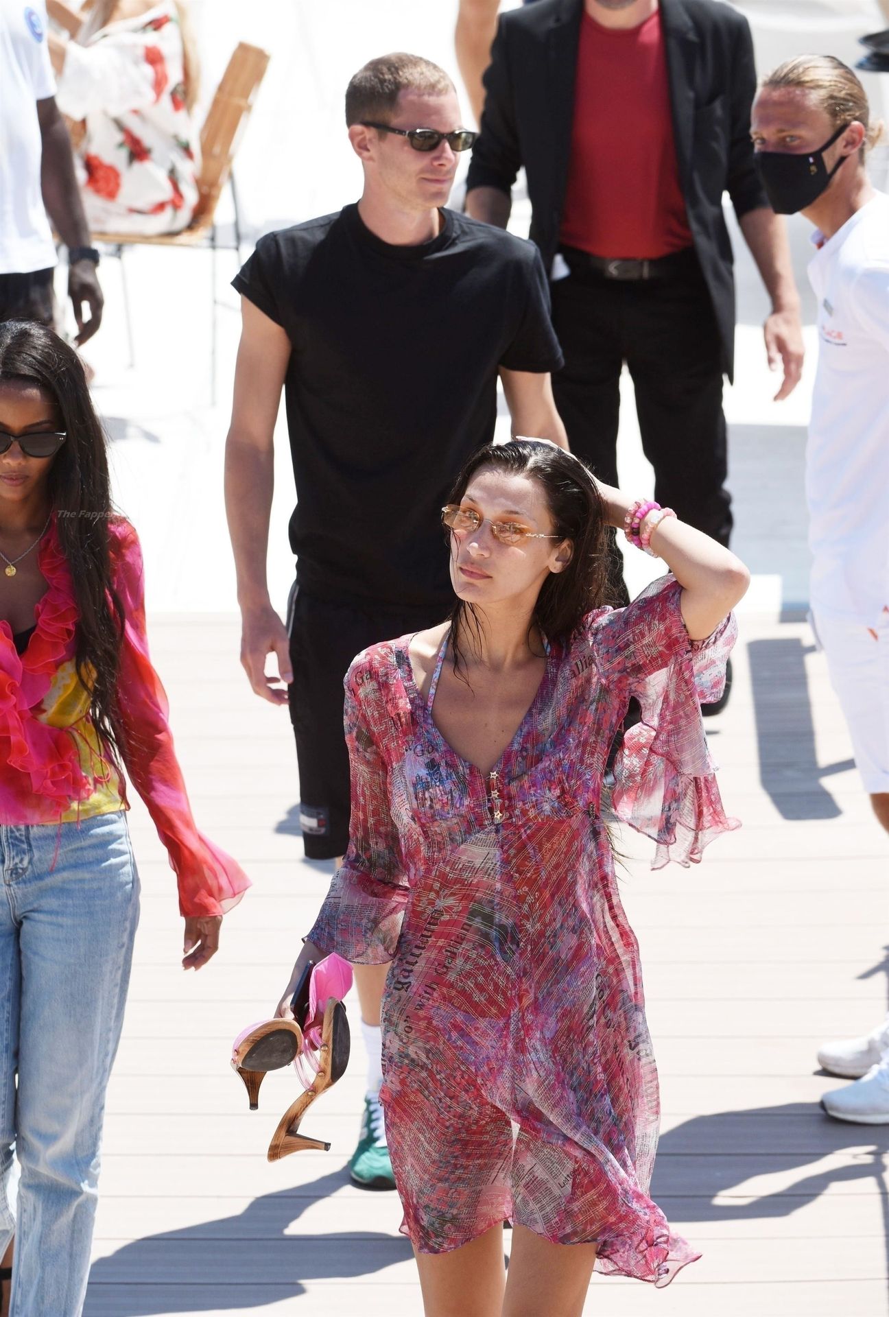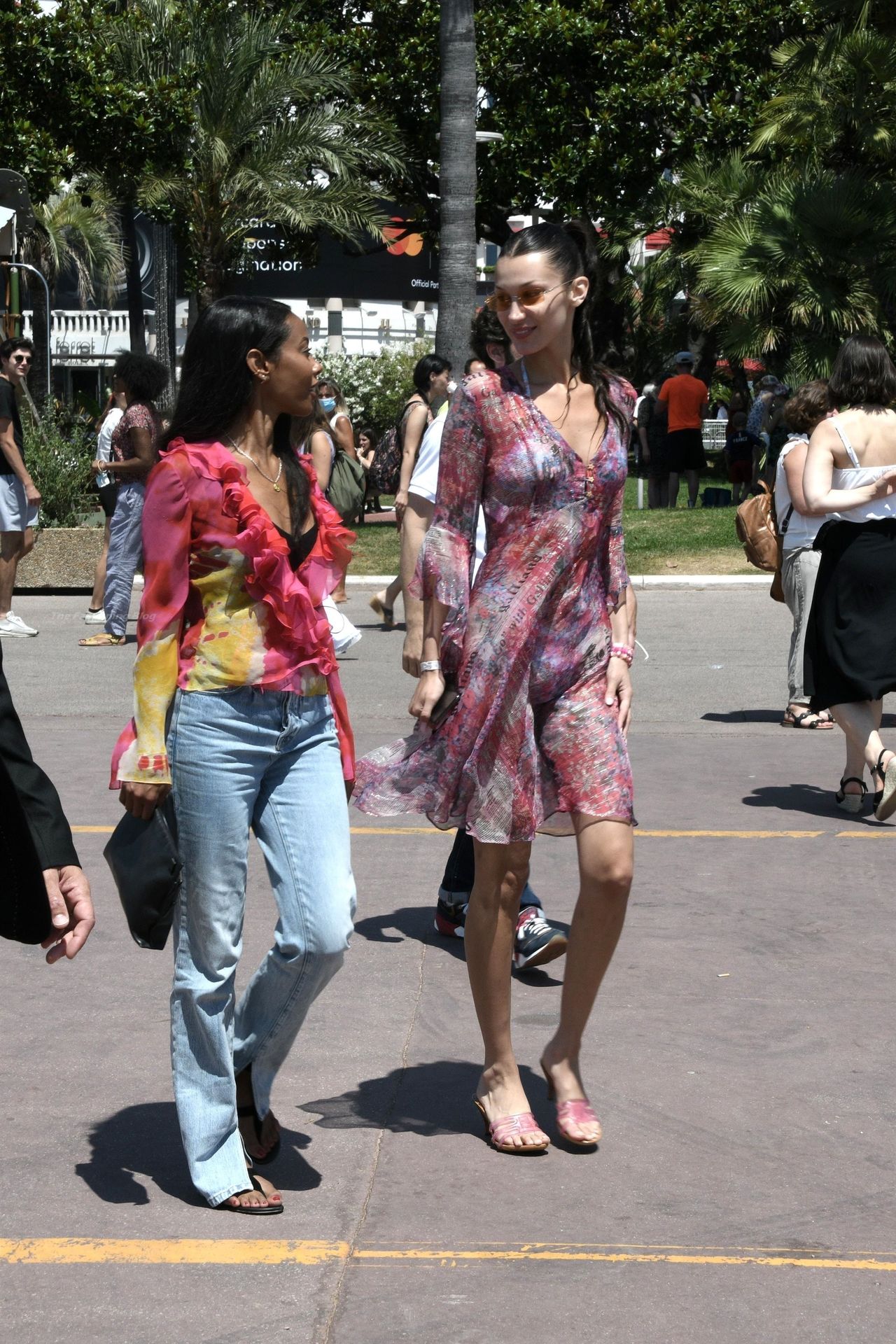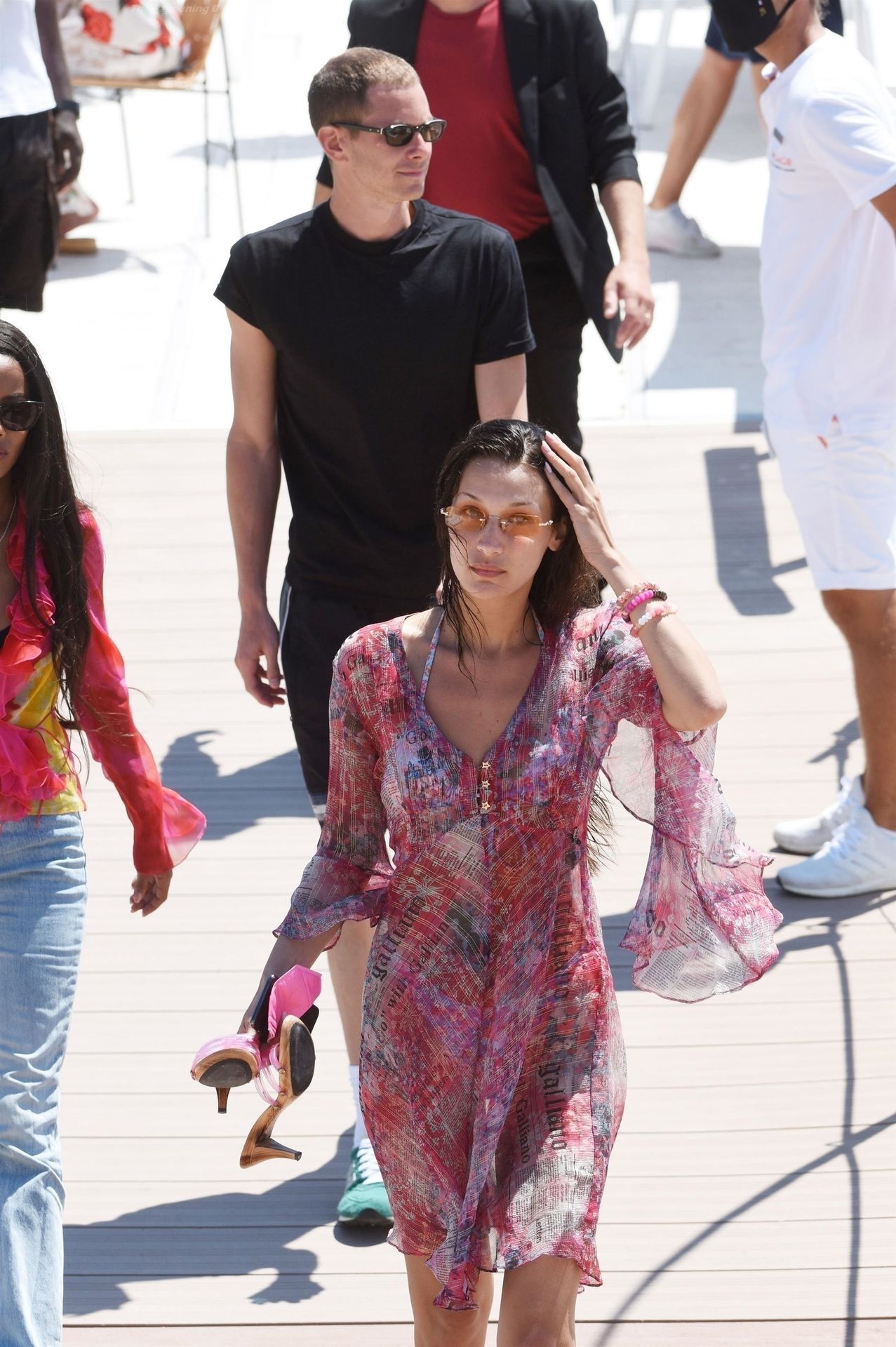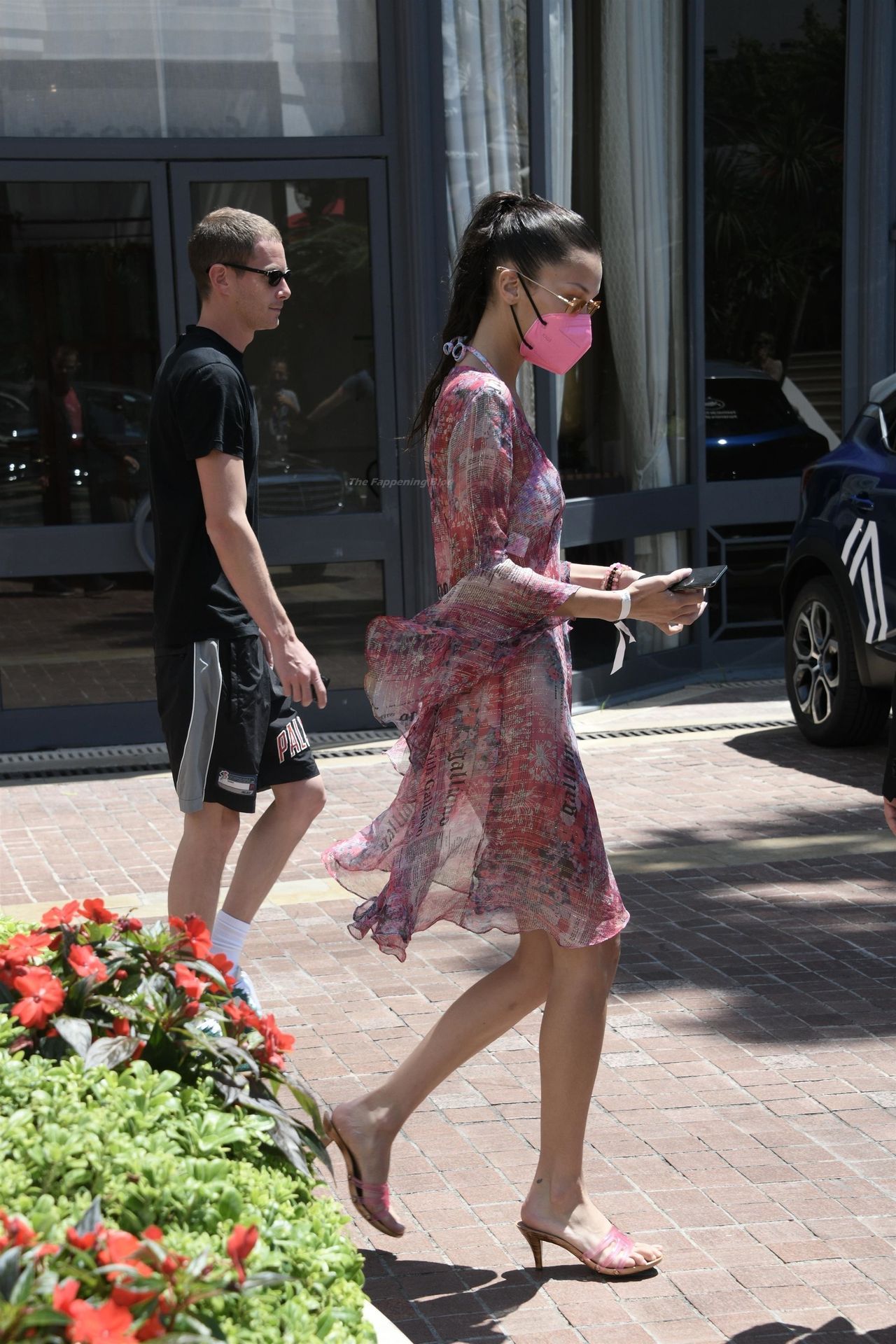 La modella Bella Hadid è stata vista durante il 74º Festival del Cinema di Cannes a Cannes, 11/07/2021. La modella sfoggia un look tipicamente elegante con un abito trasparente e décolleté rosa con tacco kitten mentre esce per pranzo.