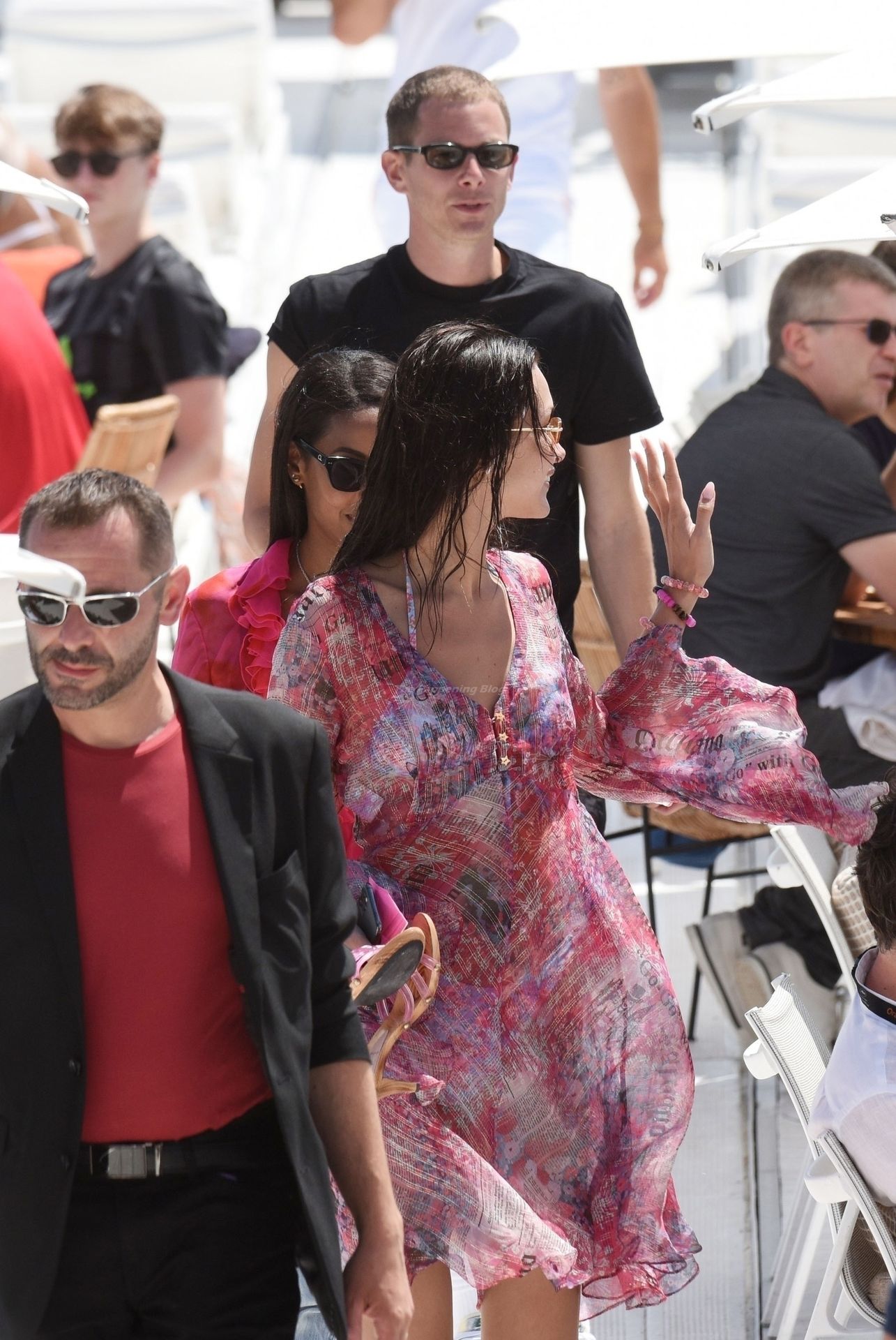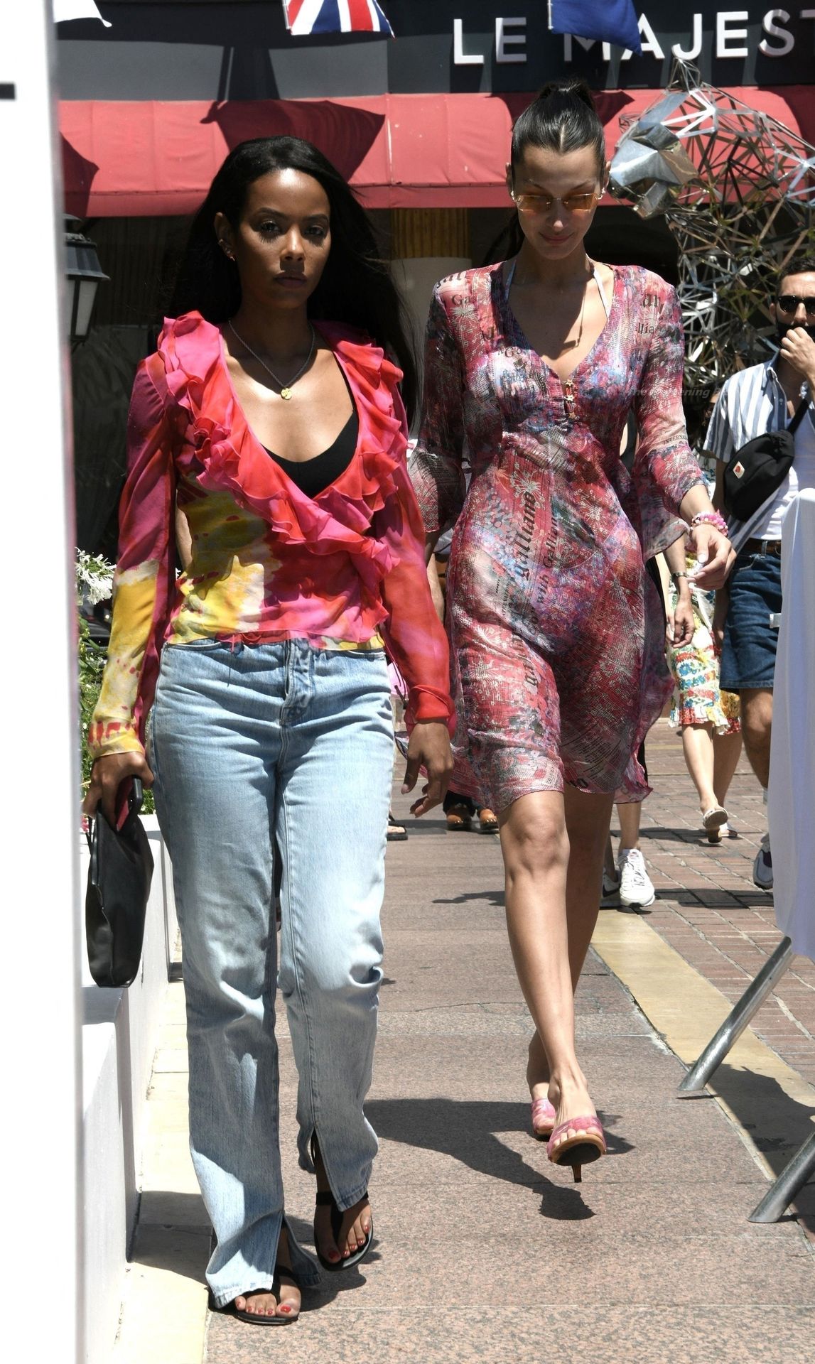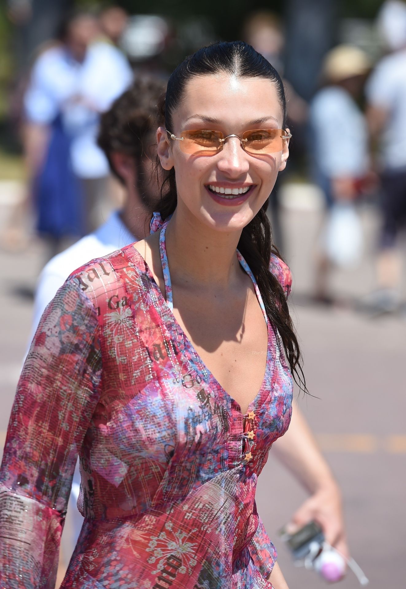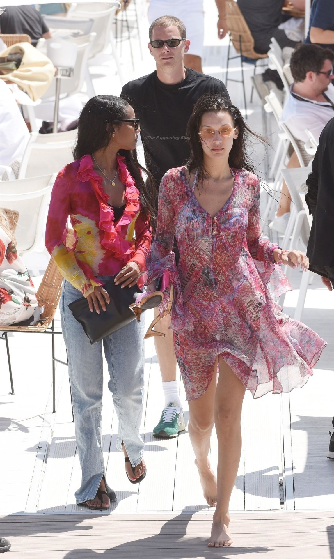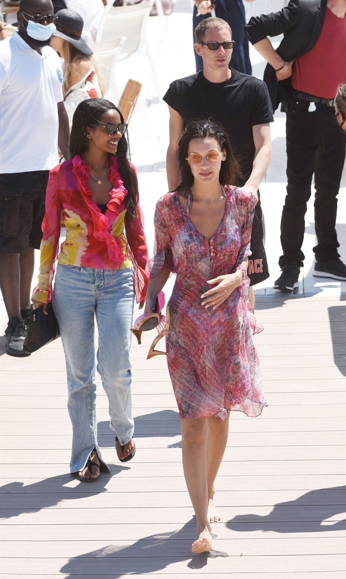 La modella Bella Hadid è stata vista durante il 74º Festival del Cinema di Cannes a Cannes, 11/07/2021. La modella sfoggia un look tipicamente elegante con un abito trasparente e décolleté rosa con tacco kitten mentre esce per pranzo.
