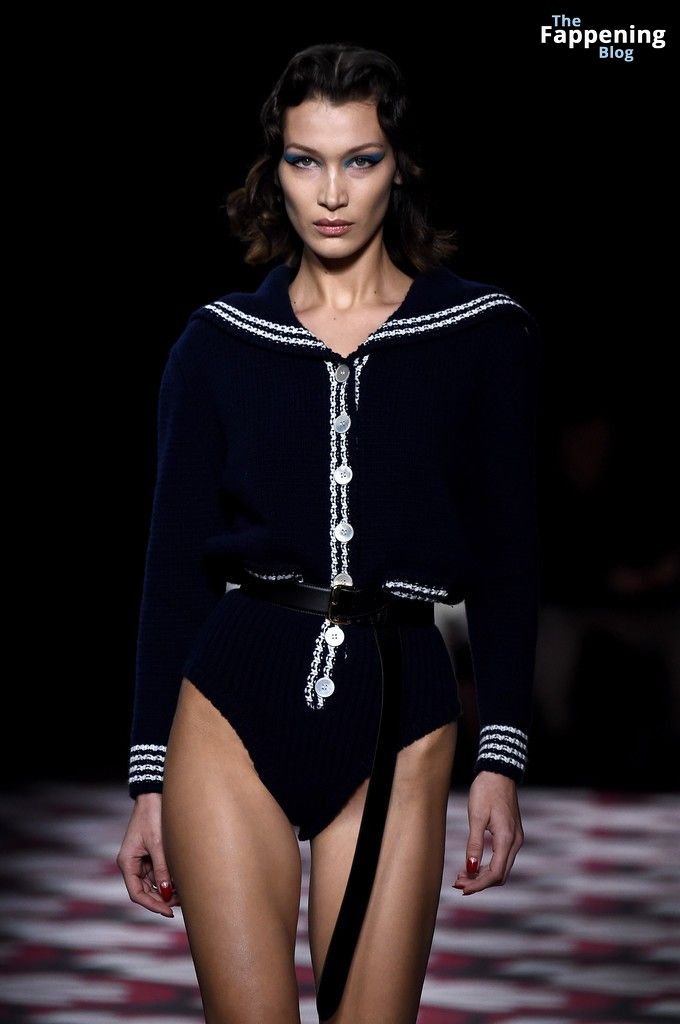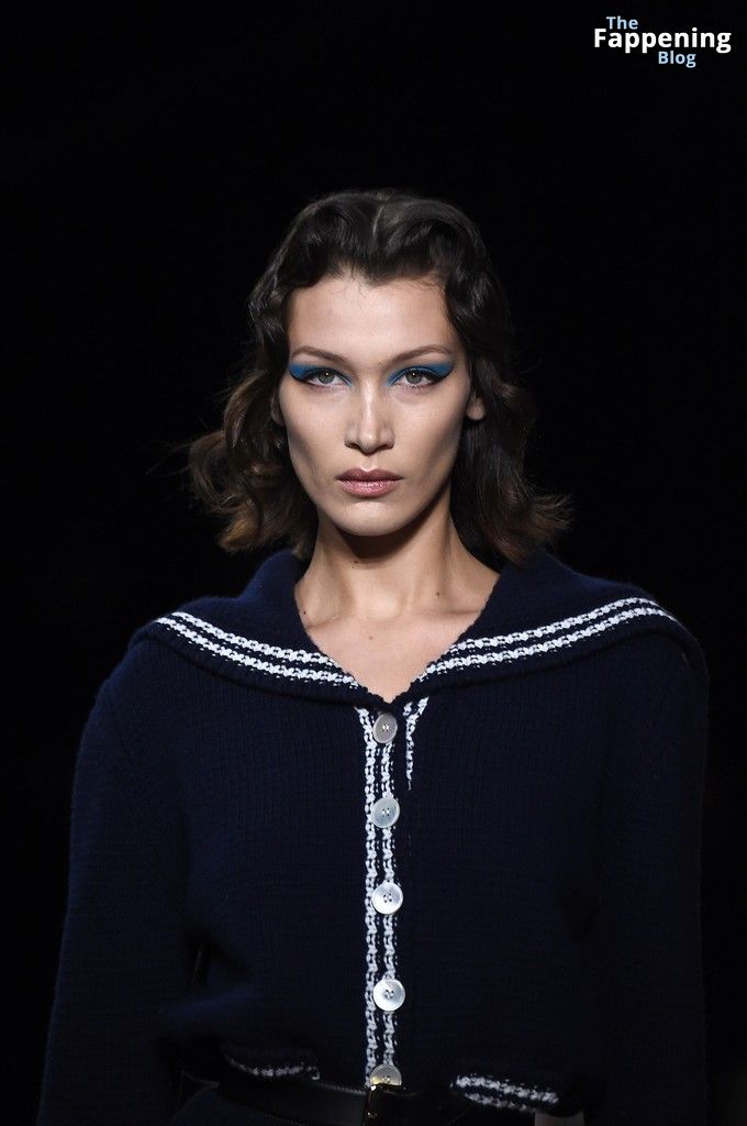 Quando Bella ha calpestato la passerella durante lo show di Miu Miu a Parigi, l’ha assolutamente dominata. Indossava un body ispirato al nautico con bottoni bianchi, e quei tacchi alti rossi e soffici erano una vera bomba. Il suo trucco era perfetto, con un audace eyeliner blu che faceva risaltare i suoi occhi da 23 anni.