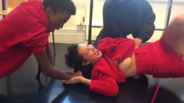 Wow, e mentre i ragazzi venivano maltrattati tutto questo tempo, la stronza sorrideva tutto il tempo. Questo non è affatto sessista. Tutto quello che è successo alle donne nel Golfo e in Africa, ora vedo che lo meritano. Spaccate loro quelle teste sessiste. Tch-tch!