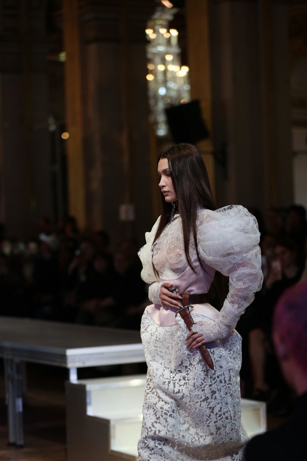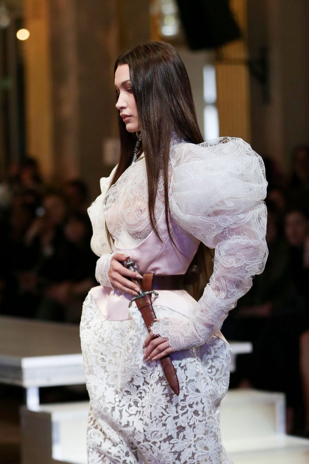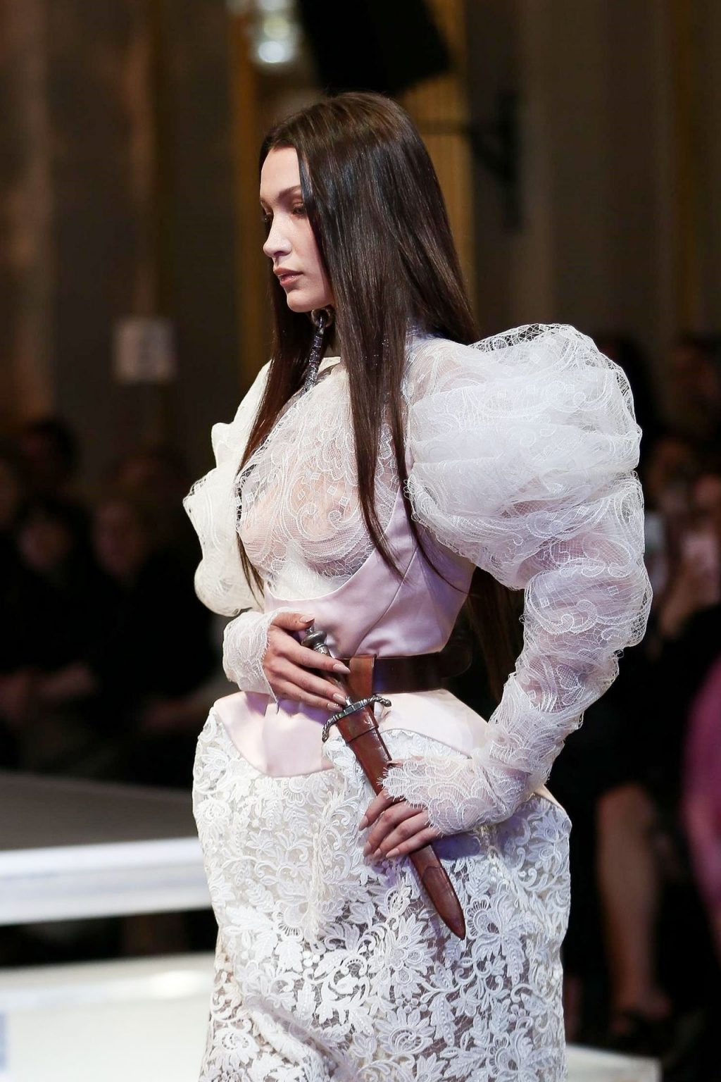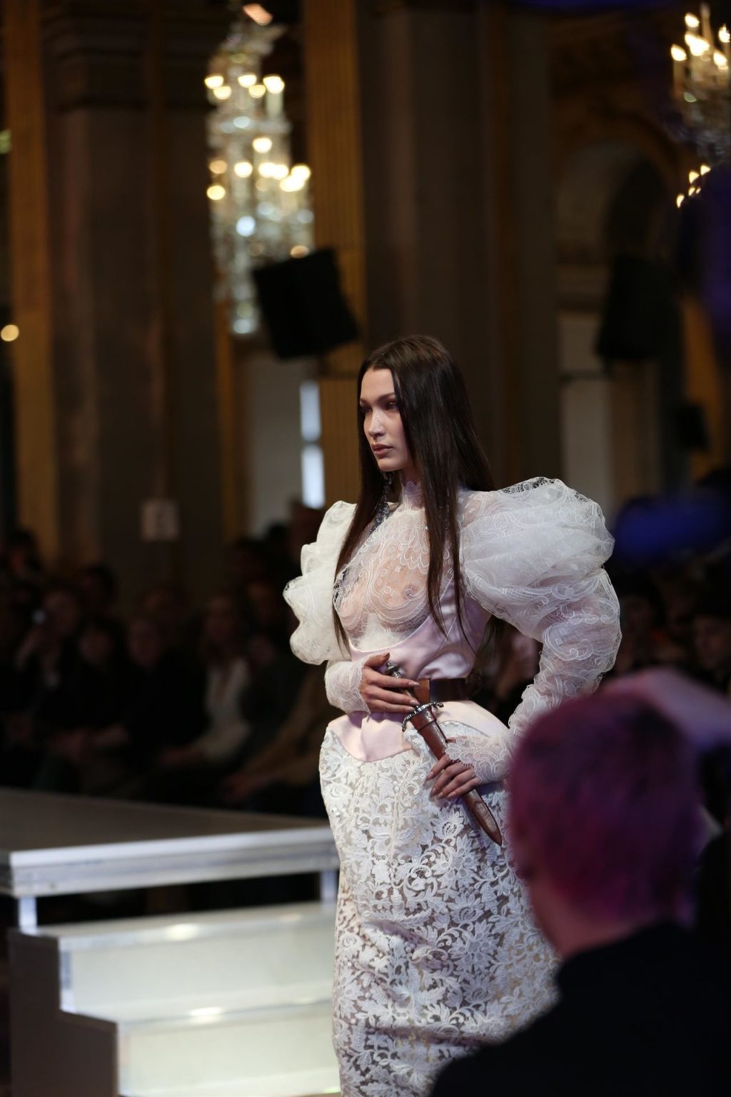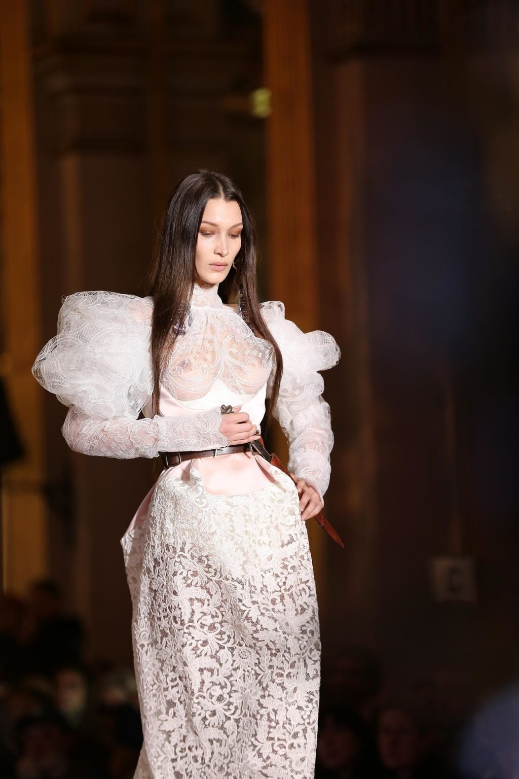 La modella Bella Hadid è stata fotografata senza reggiseno mentre sfilava alla sfilata di moda di Vivienne Westwood durante la Paris Fashion Week, 29/02/2020. Bella ti taglierà i gioielli se guardi i suoi seni!