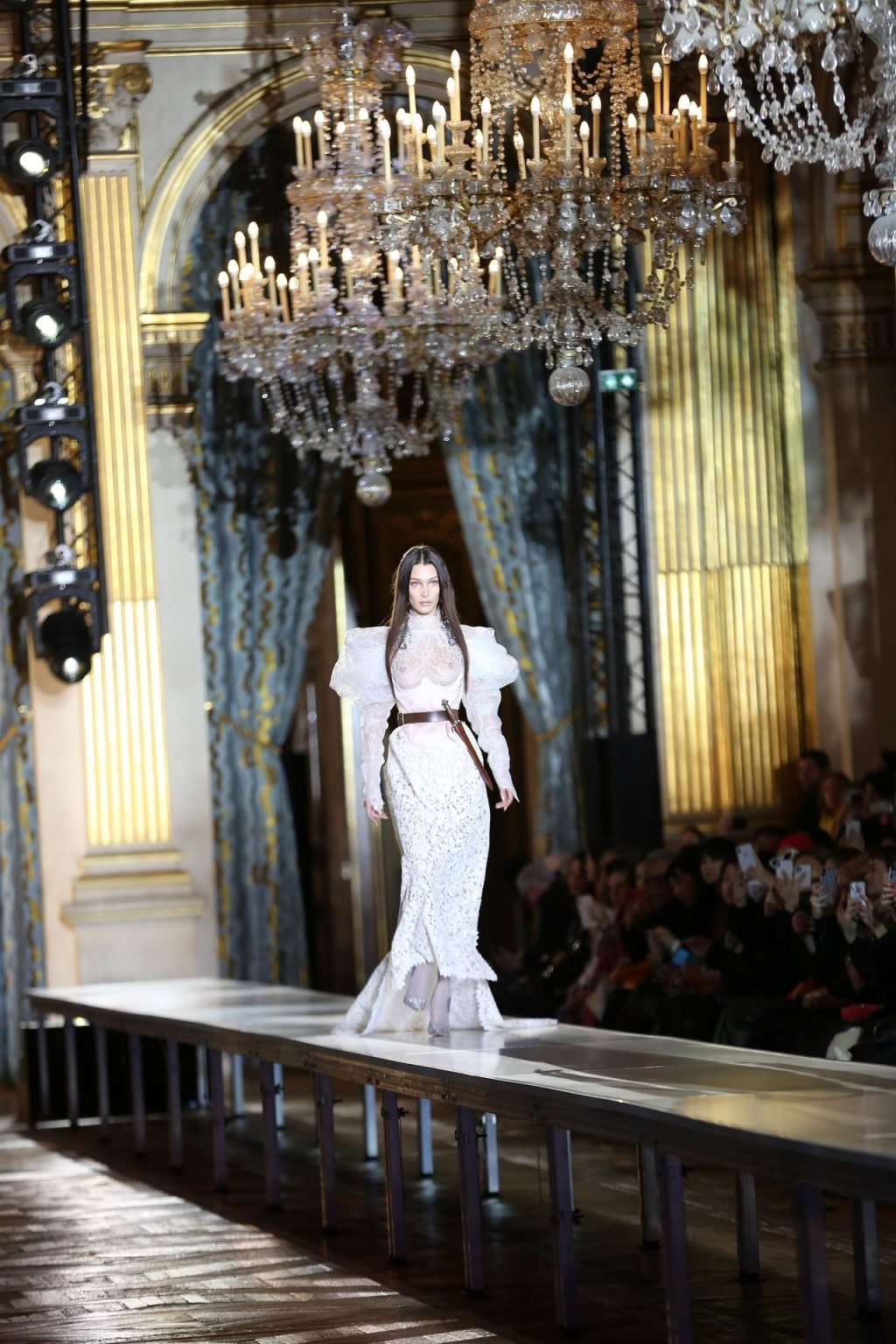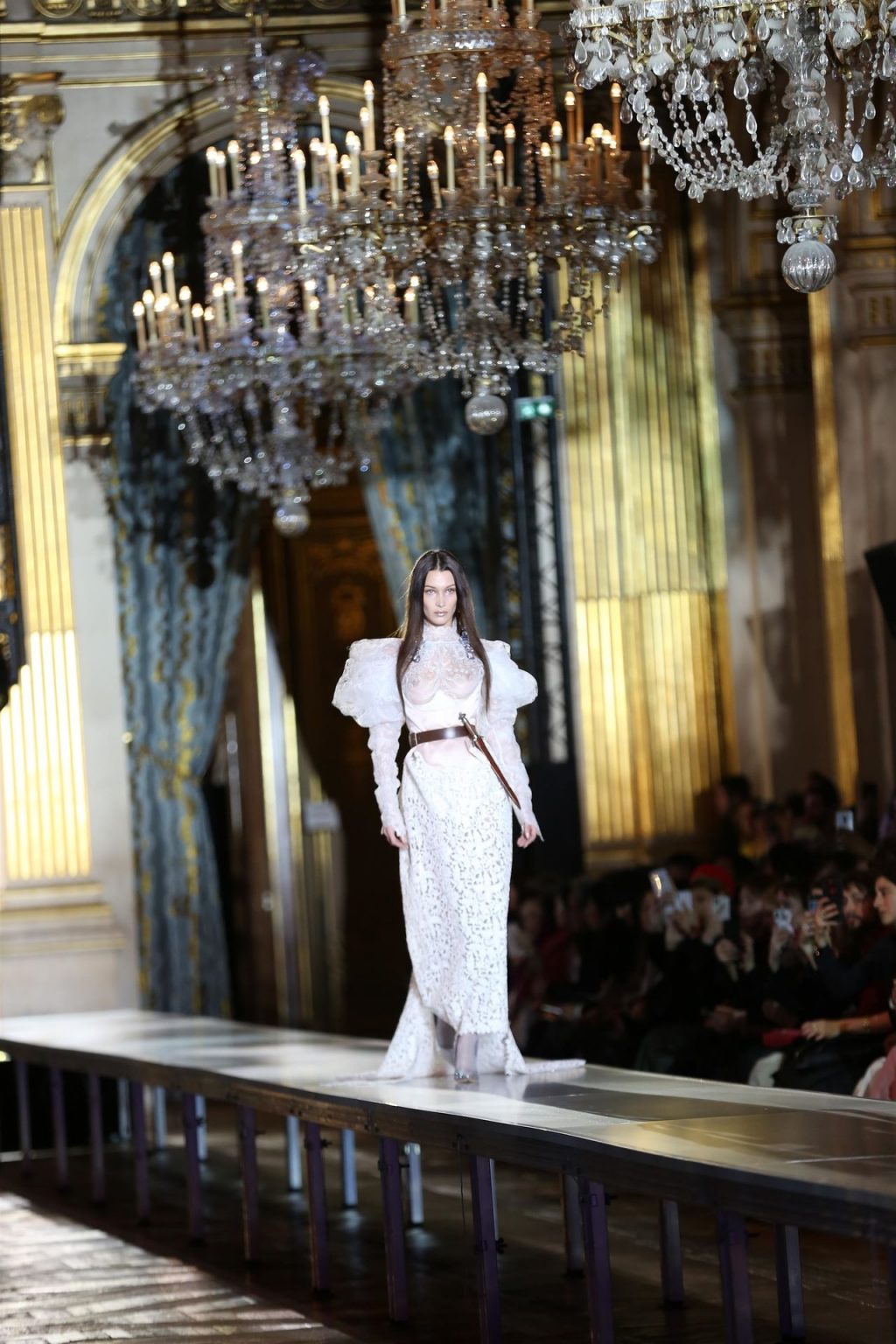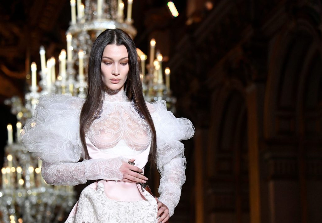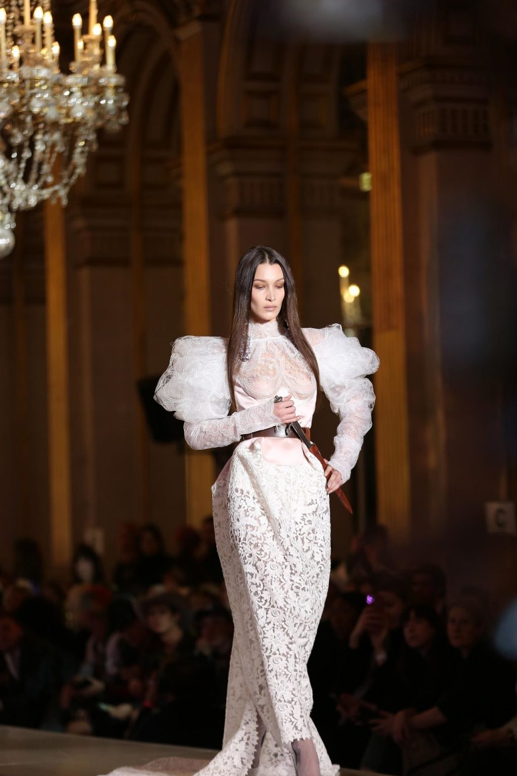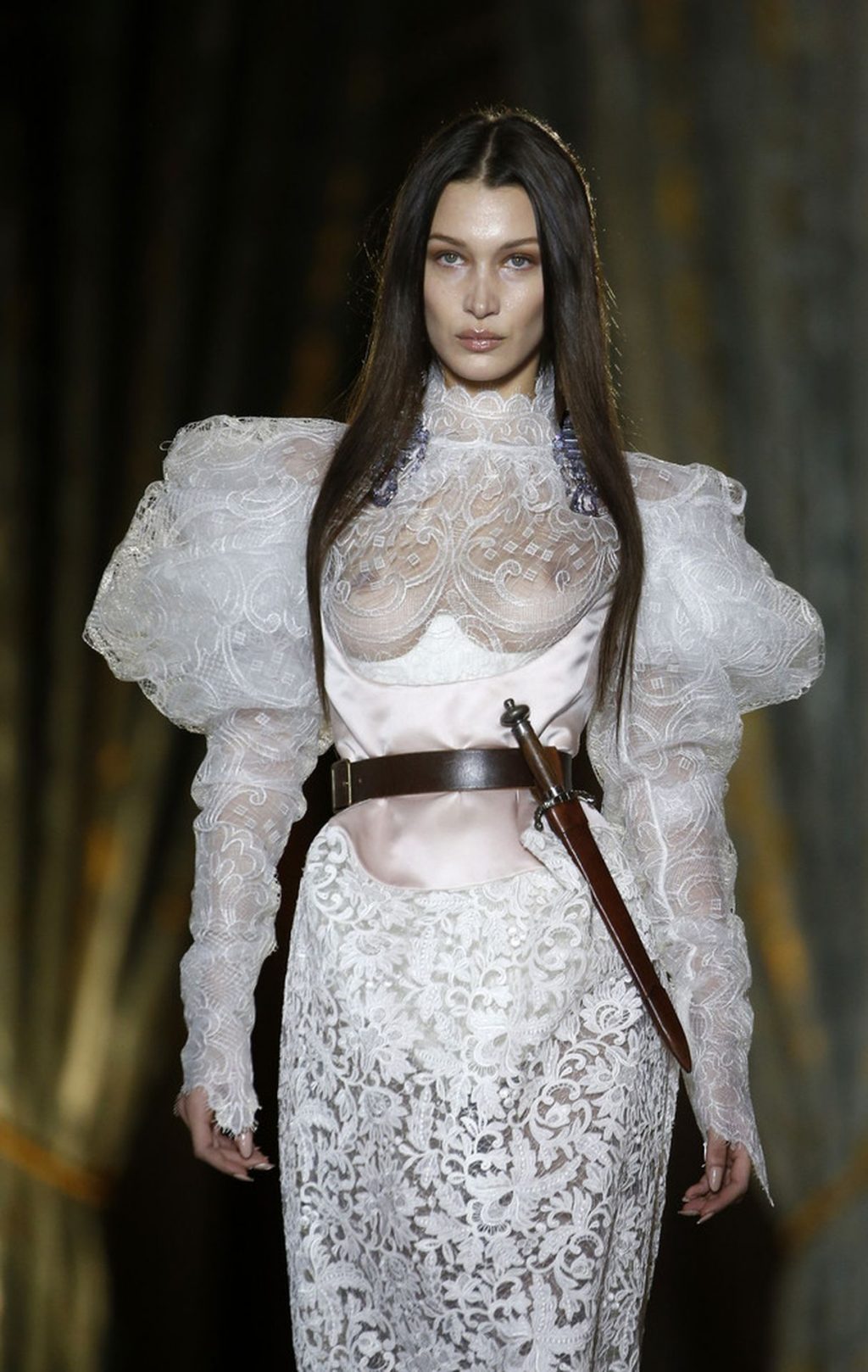 La modella Bella Hadid è stata fotografata senza reggiseno mentre sfilava alla sfilata di moda di Vivienne Westwood durante la Paris Fashion Week, 29/02/2020. Bella ti taglierà i gioielli se guardi i suoi seni!