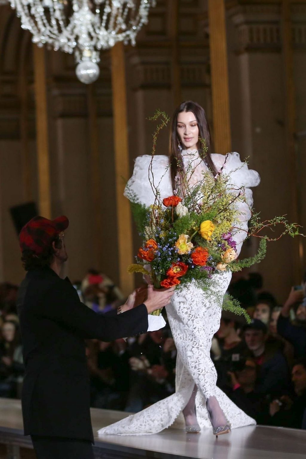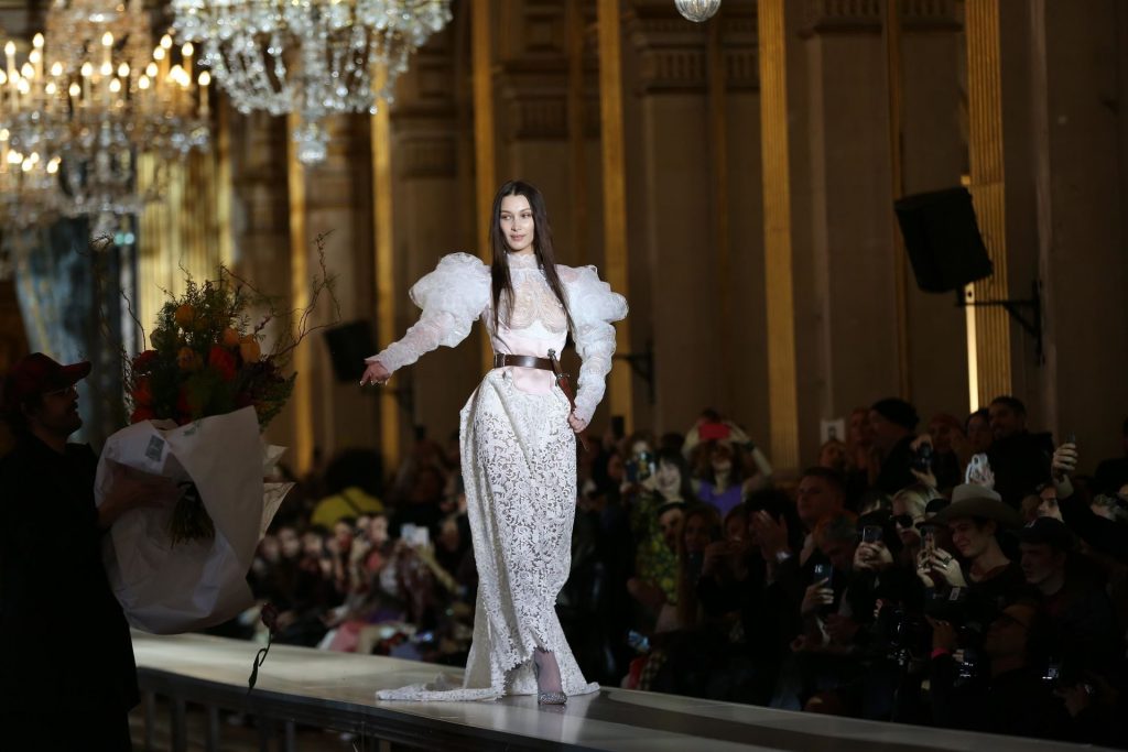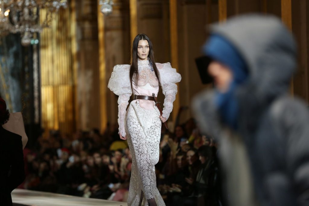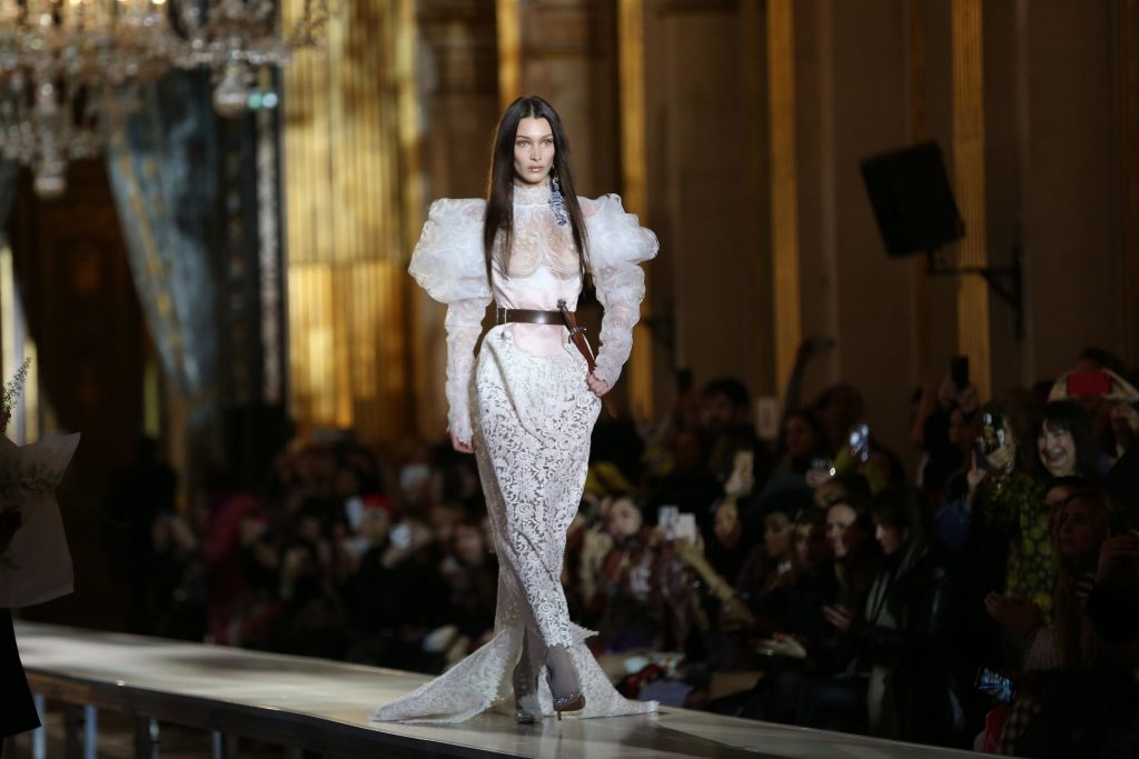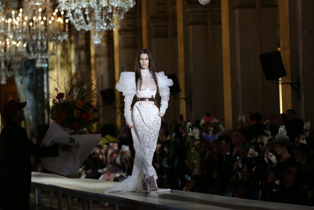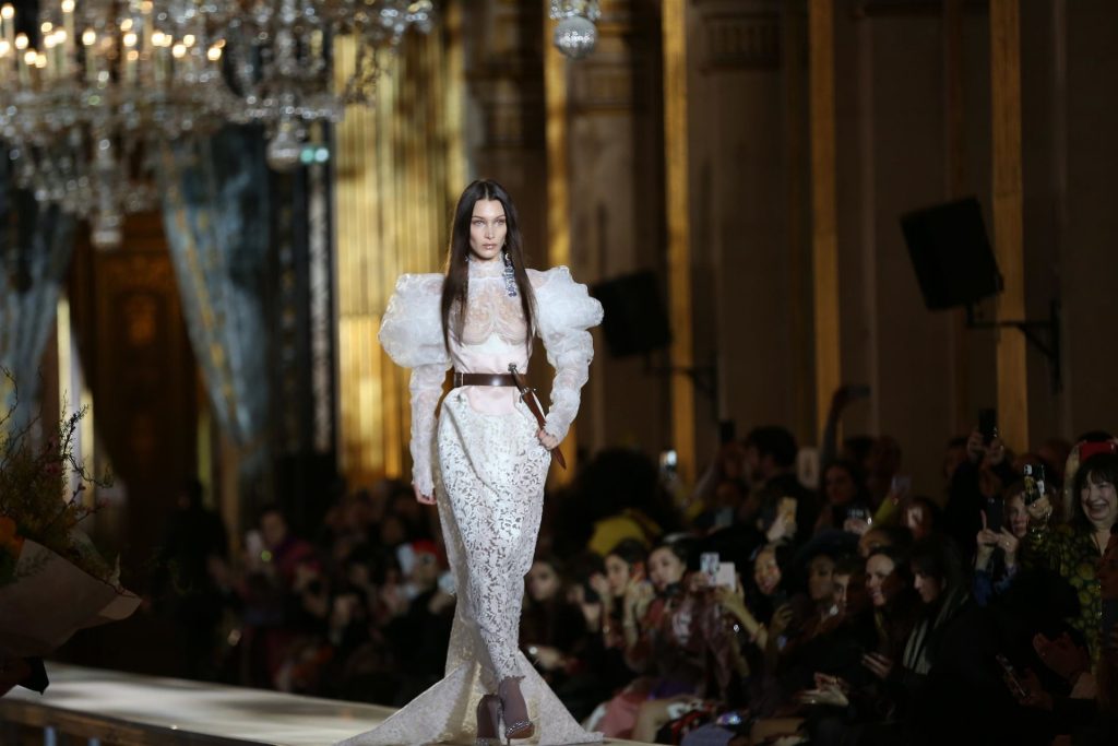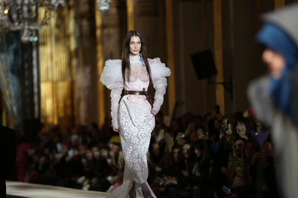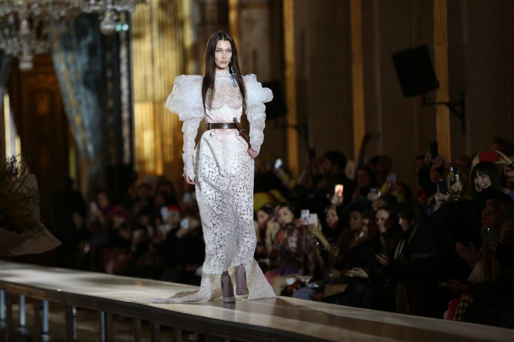 La modella Bella Hadid è stata fotografata senza reggiseno mentre sfilava alla sfilata di moda di Vivienne Westwood durante la Paris Fashion Week, 29/02/2020. Bella ti taglierà i gioielli se guardi i suoi seni!