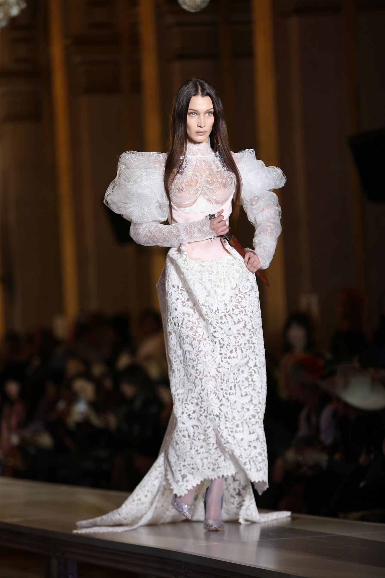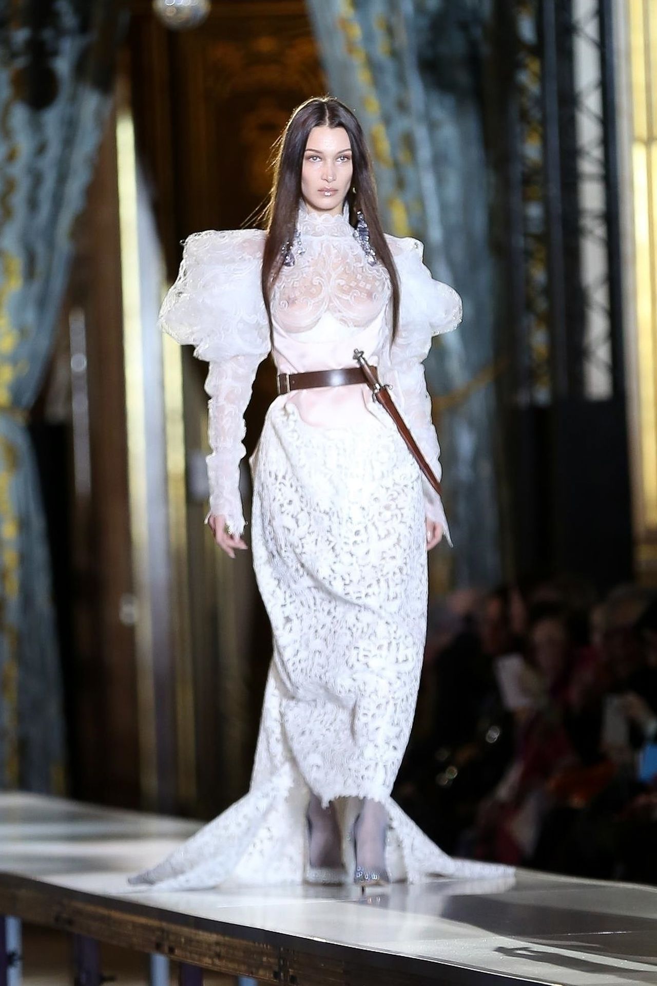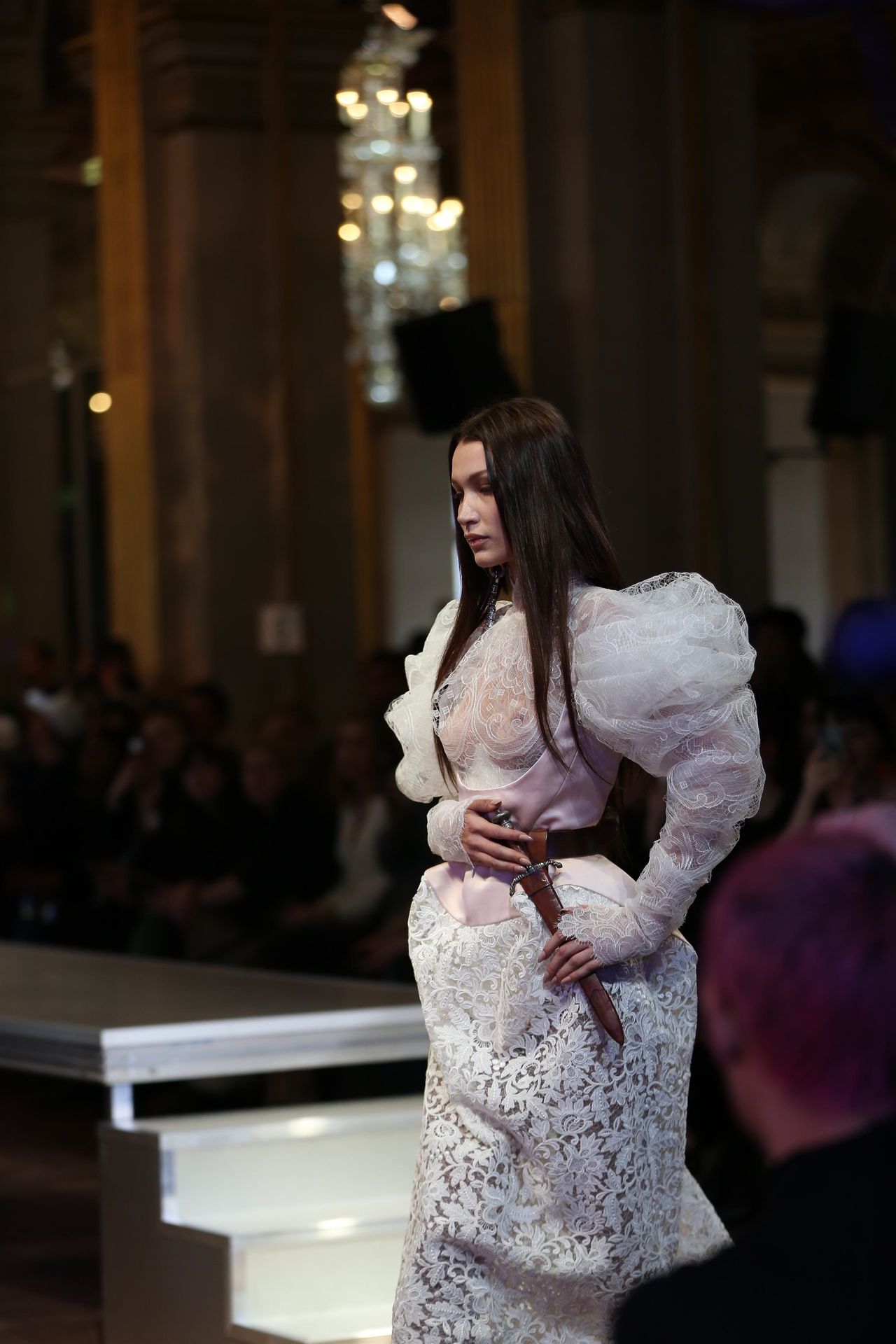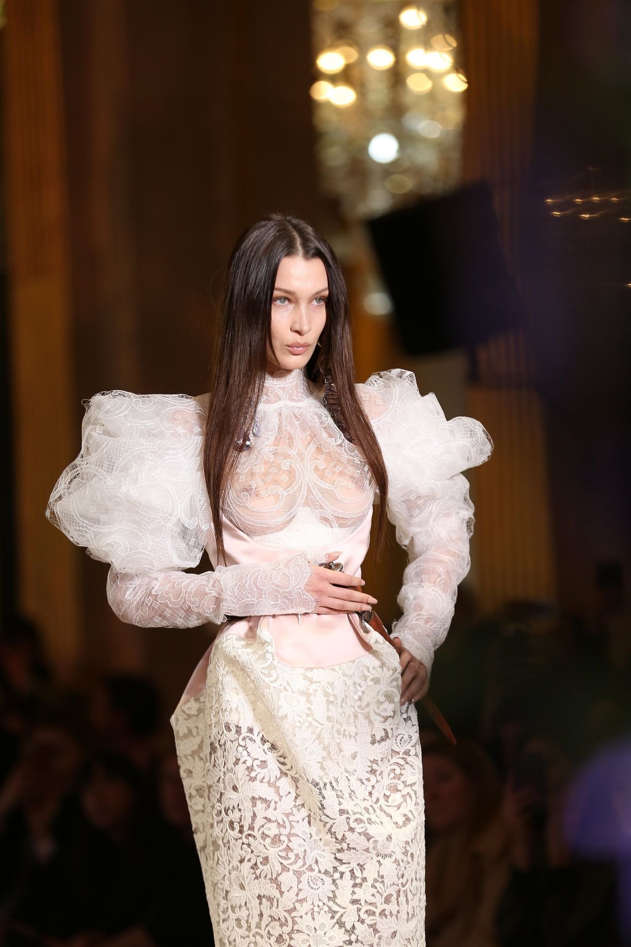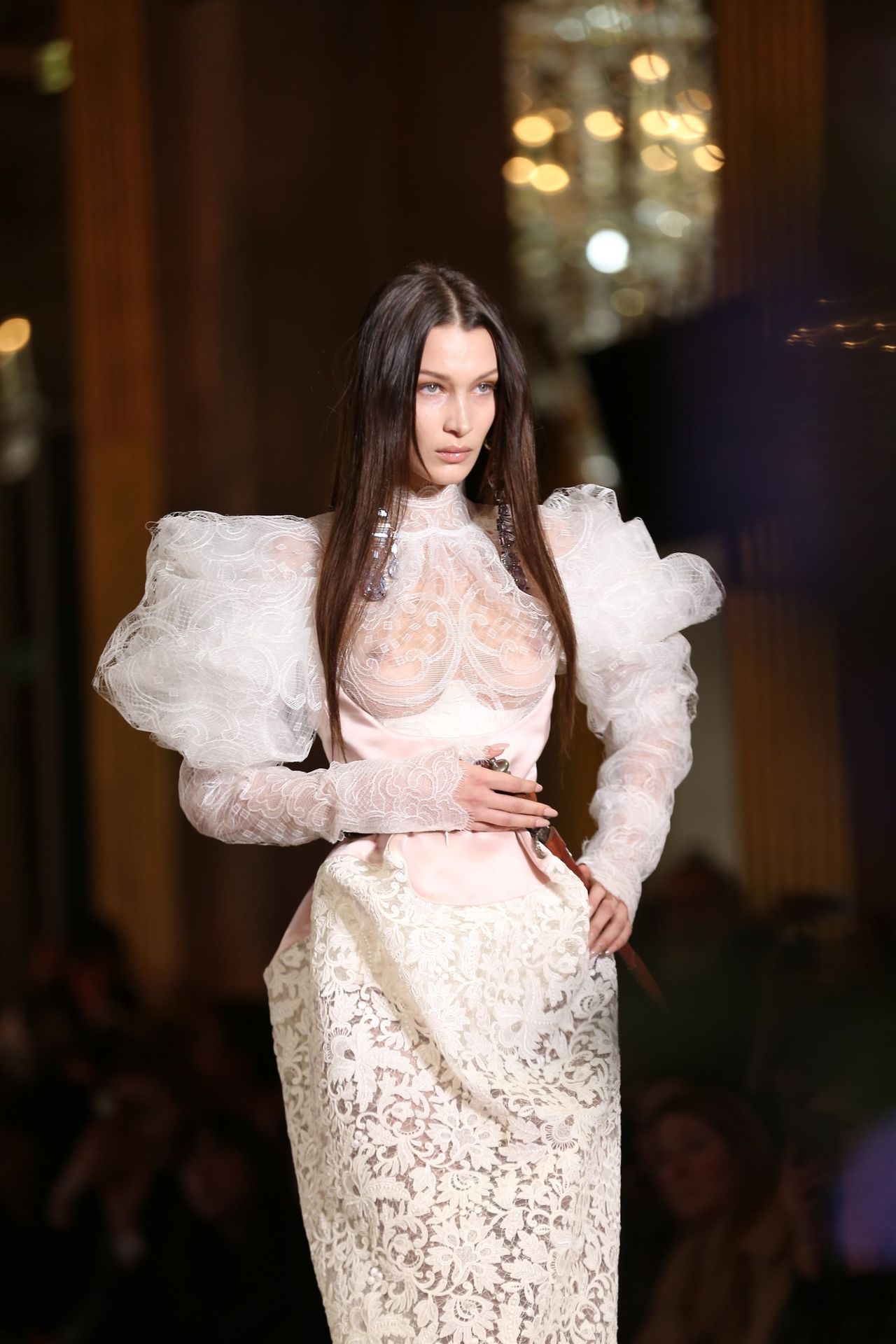 La modella Bella Hadid è stata fotografata senza reggiseno mentre sfilava alla sfilata di moda di Vivienne Westwood durante la Paris Fashion Week, 29/02/2020. Bella ti taglierà i gioielli se guardi i suoi seni!