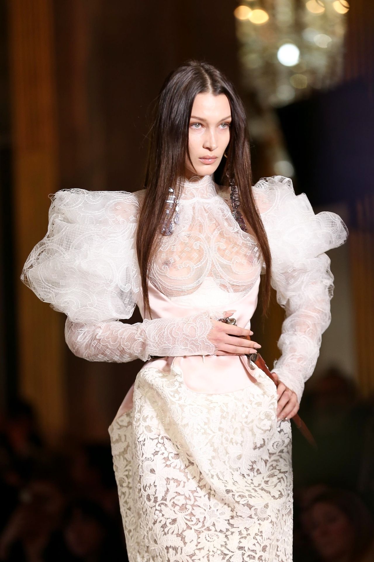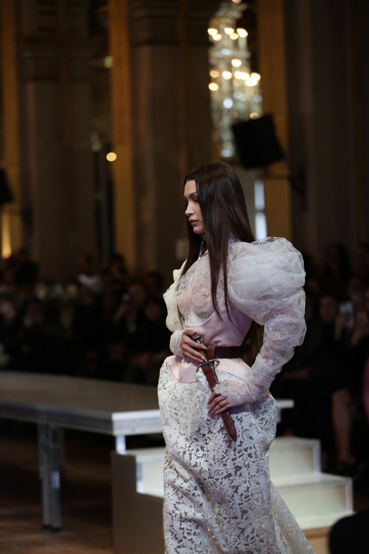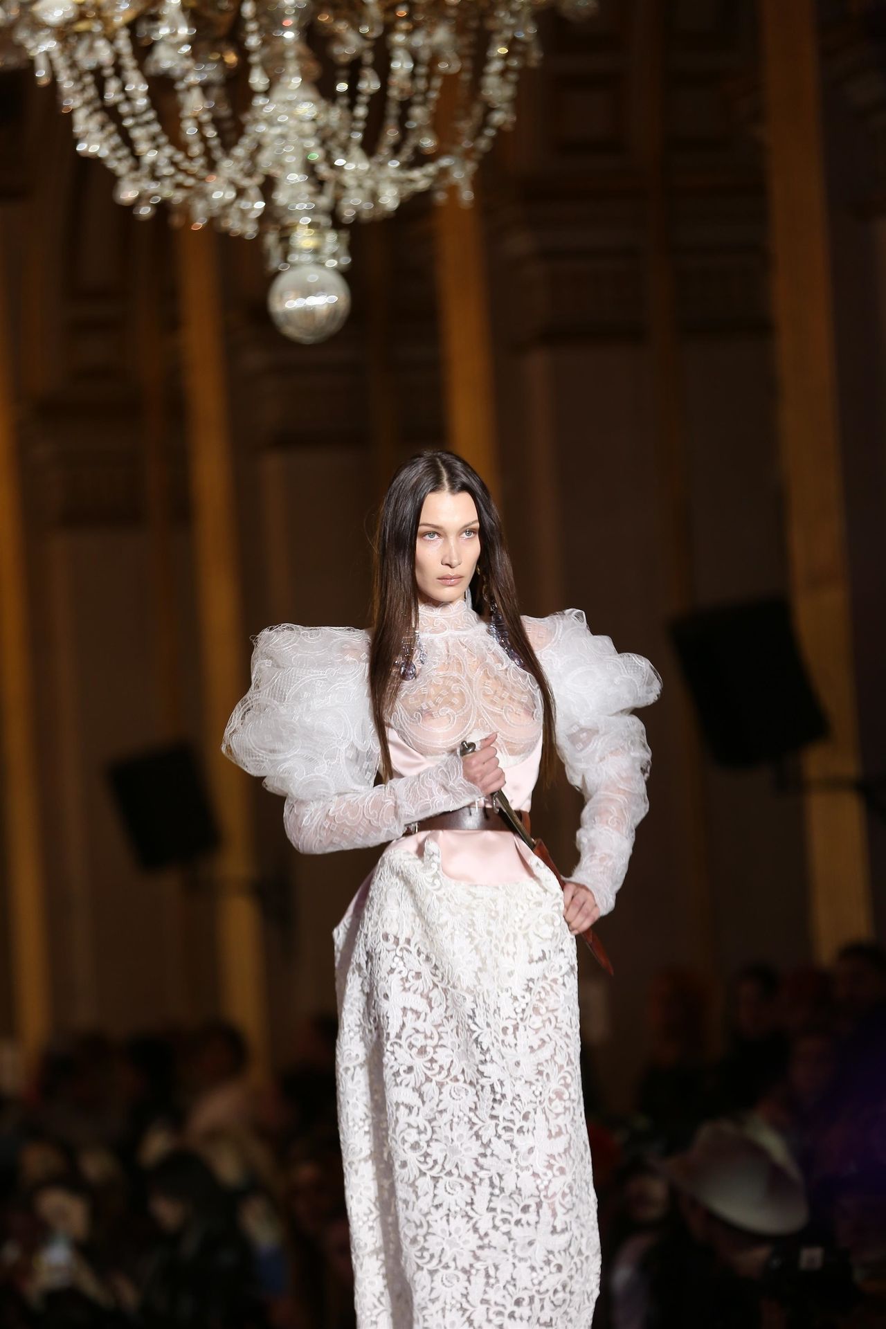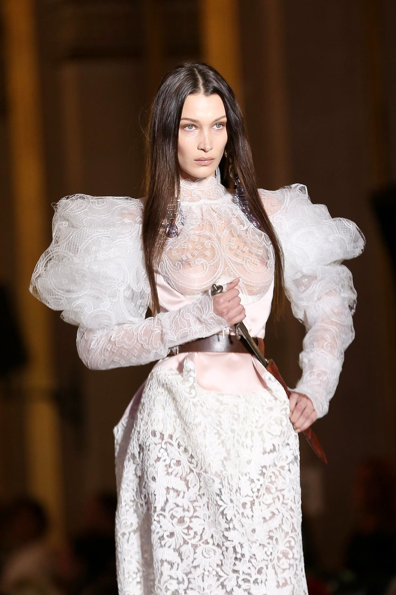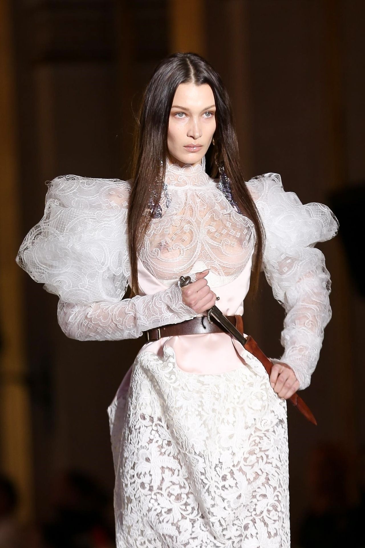 La modella Bella Hadid è stata fotografata senza reggiseno mentre sfilava alla sfilata di moda di Vivienne Westwood durante la Paris Fashion Week, 29/02/2020. Bella ti taglierà i gioielli se guardi i suoi seni!