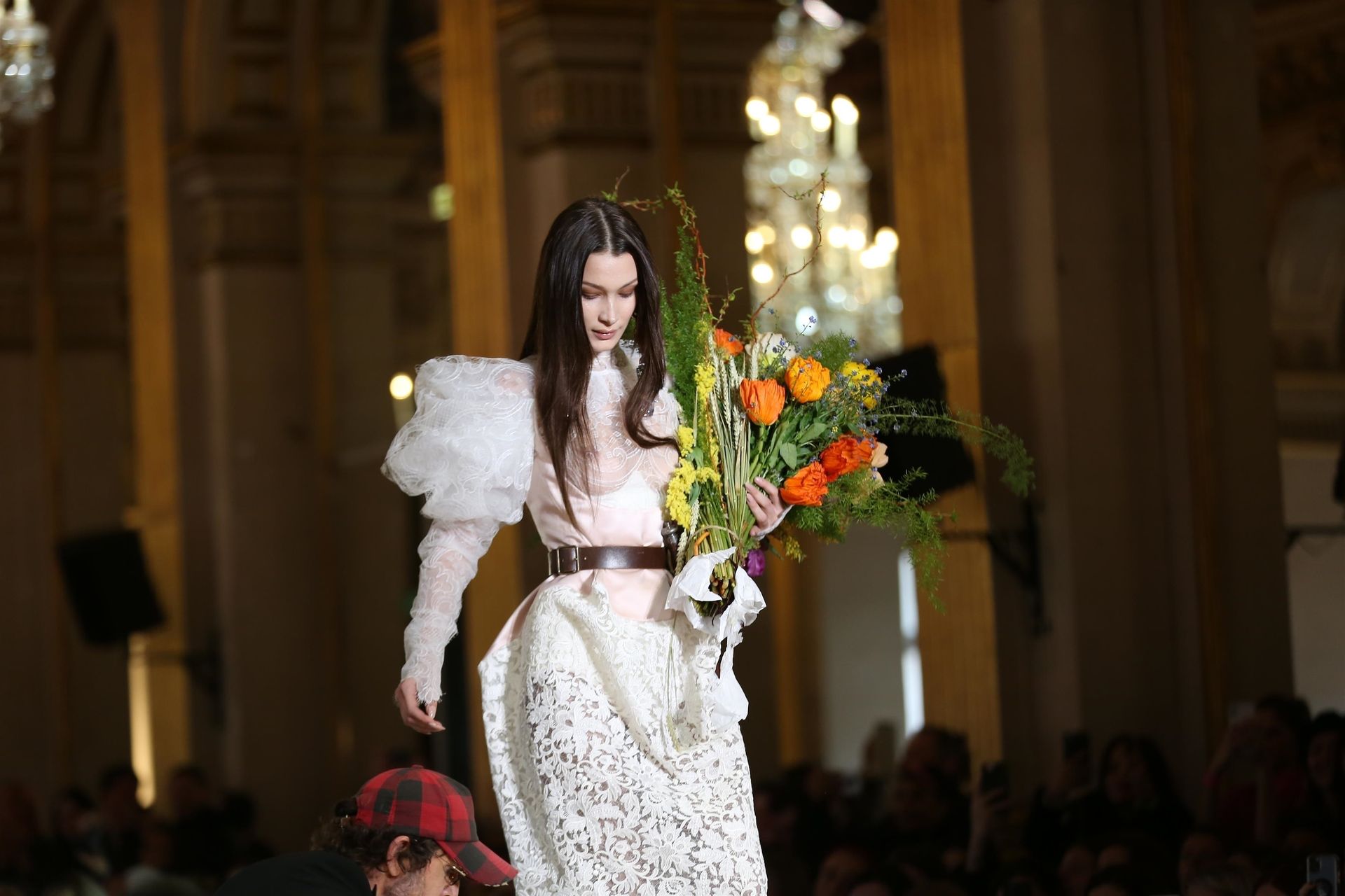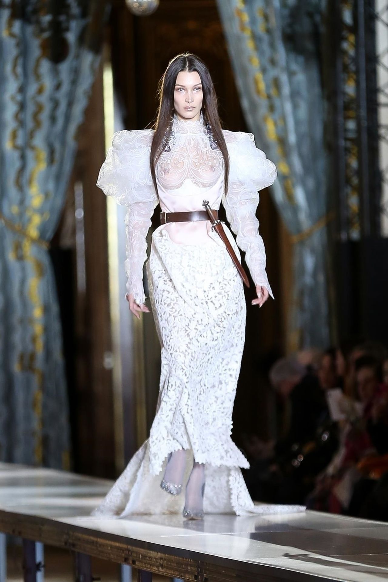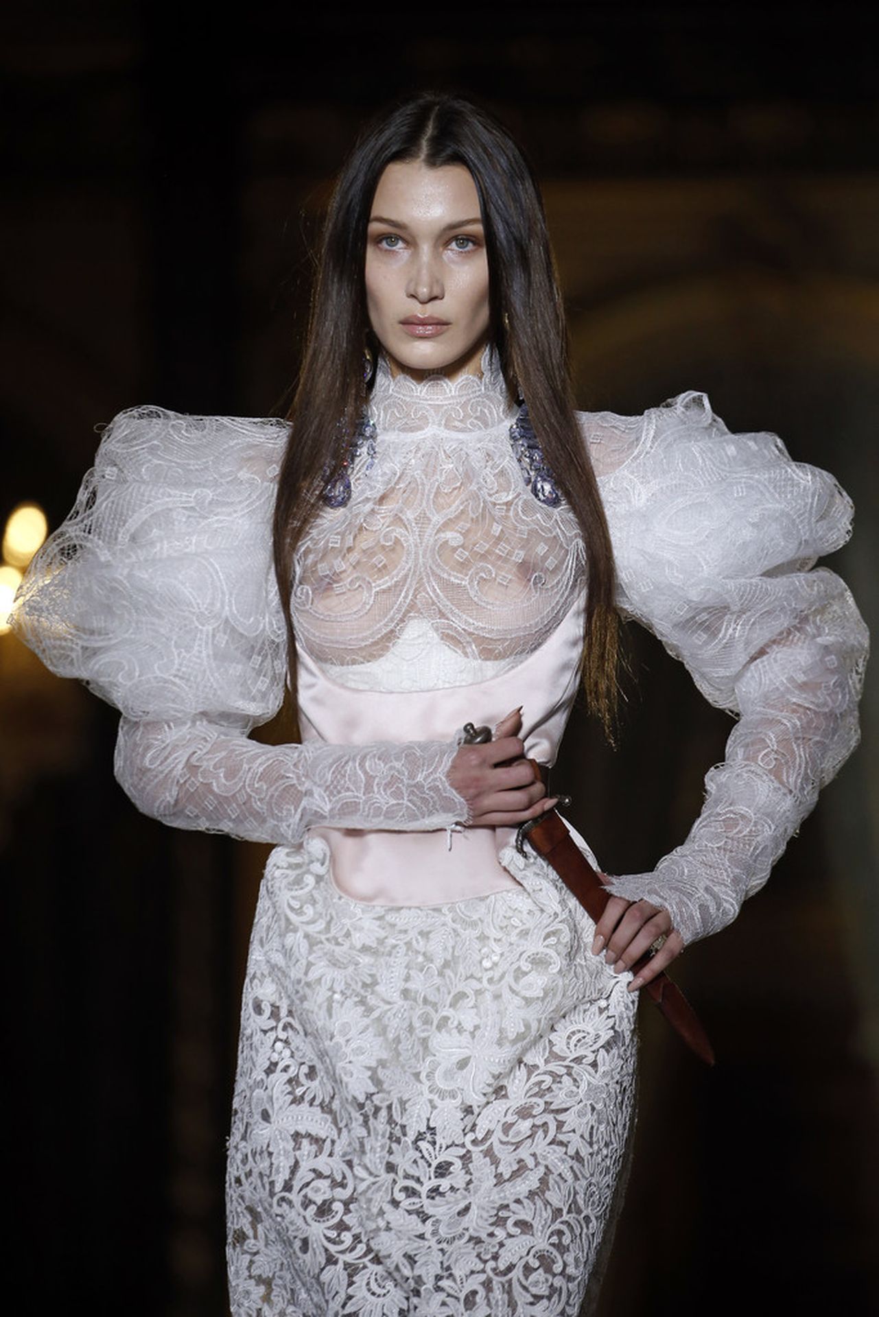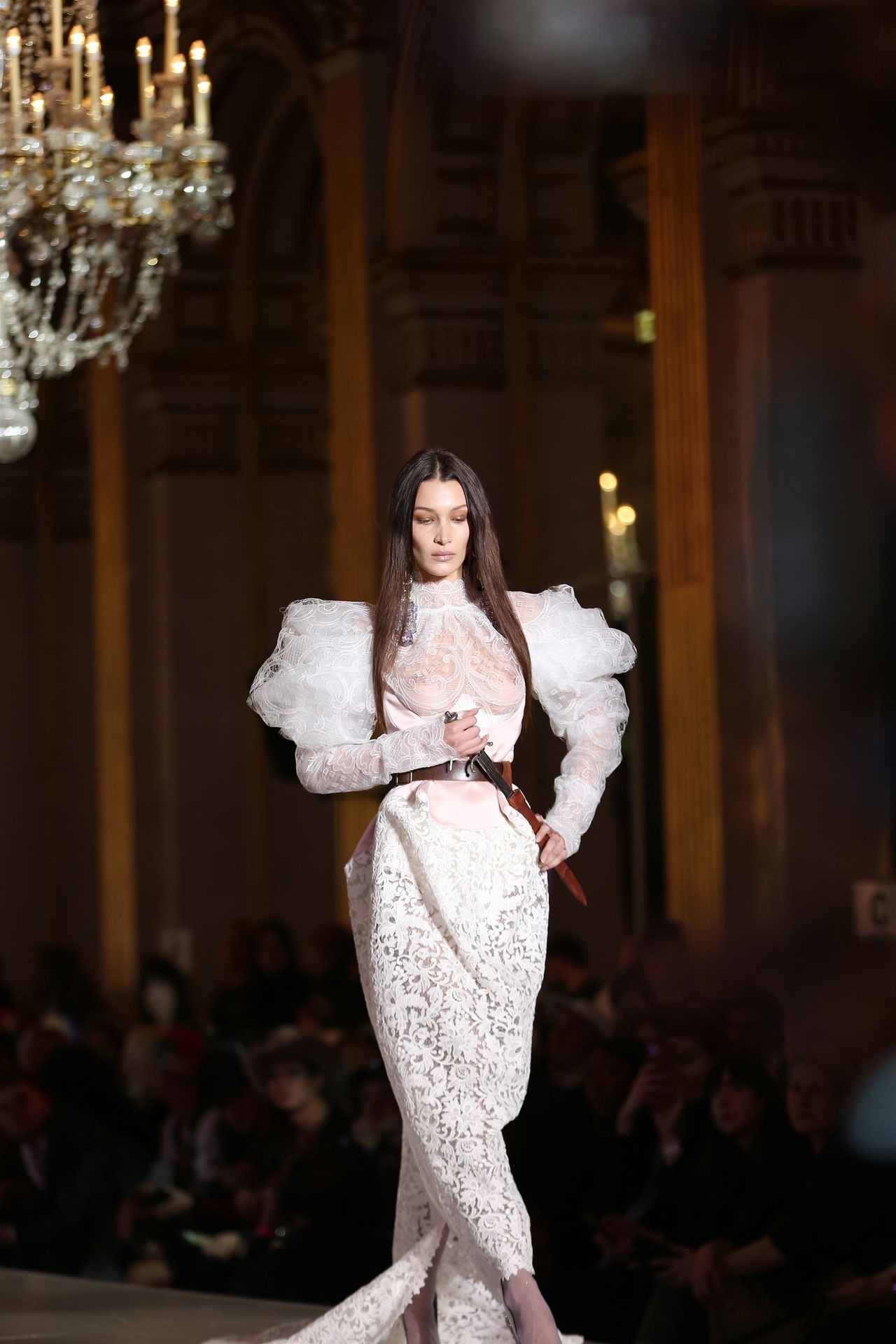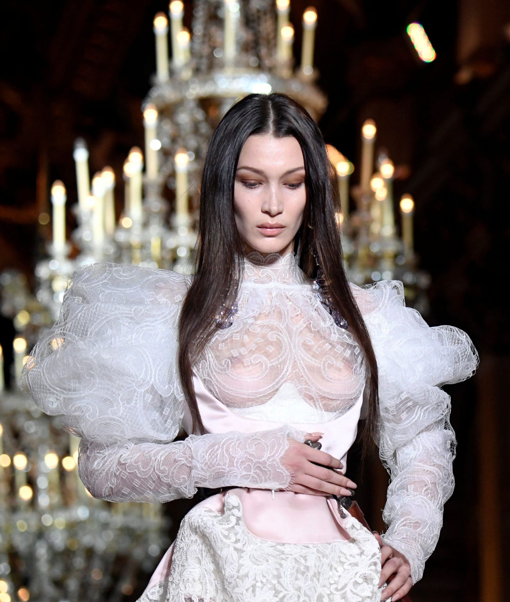 La modella Bella Hadid è stata fotografata senza reggiseno mentre sfilava alla sfilata di moda di Vivienne Westwood durante la Paris Fashion Week, 29/02/2020. Bella ti taglierà i gioielli se guardi i suoi seni!