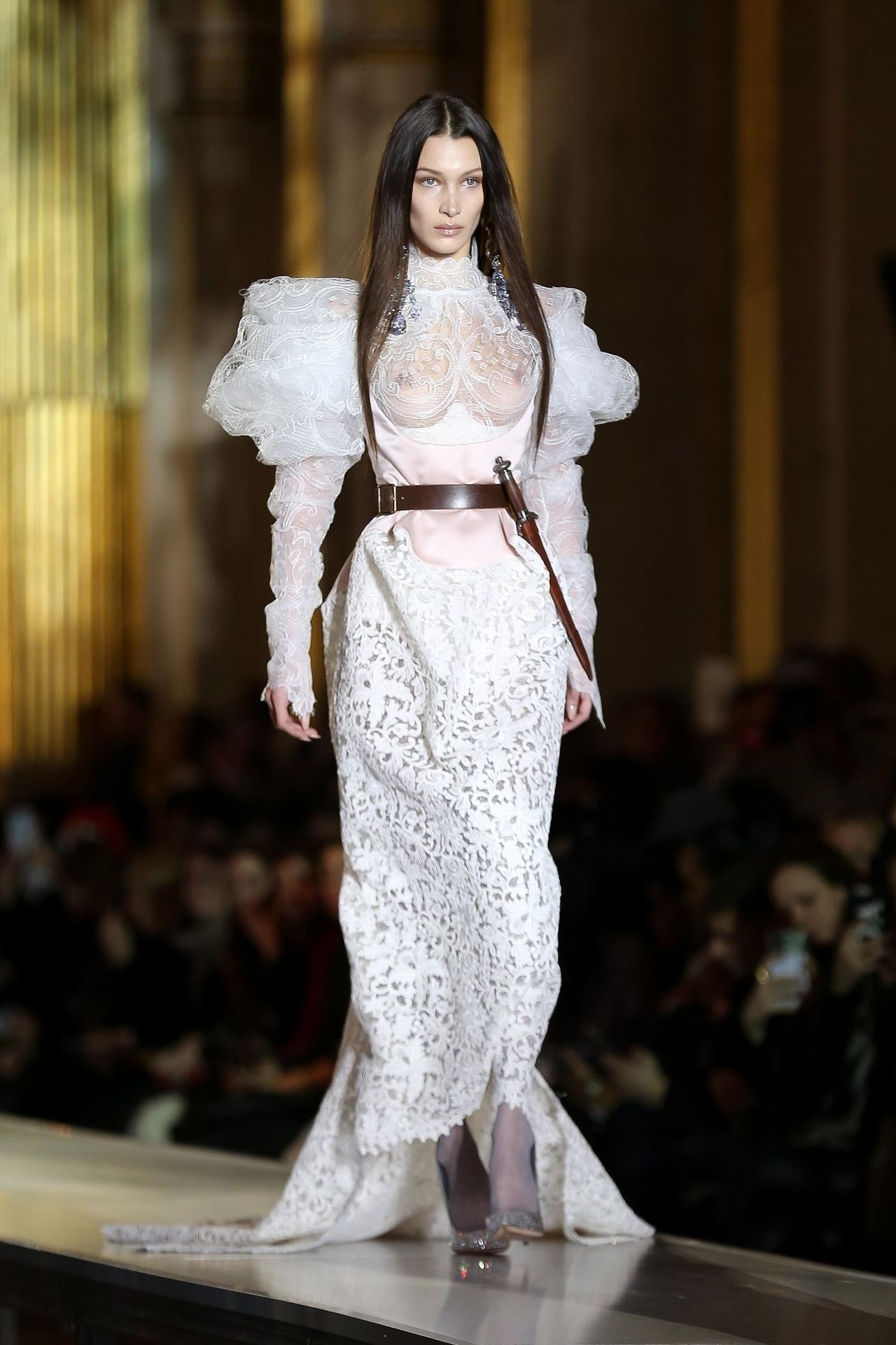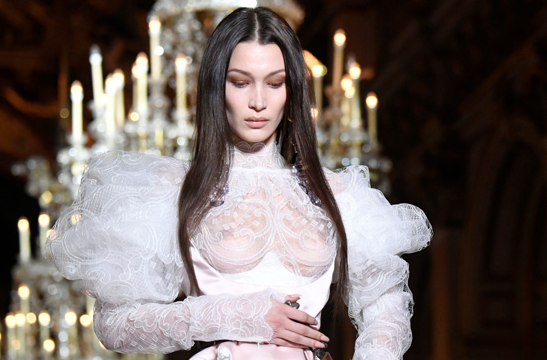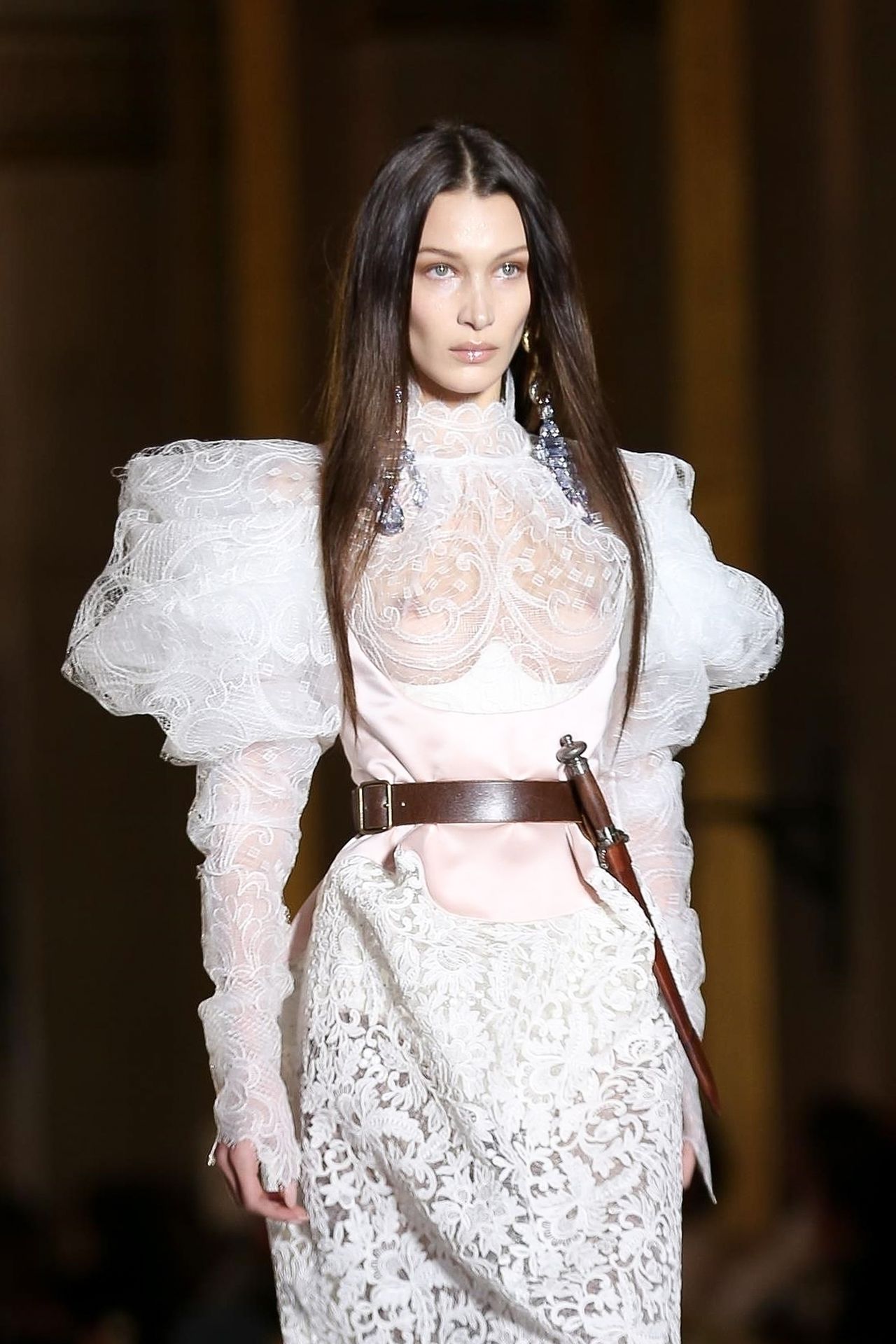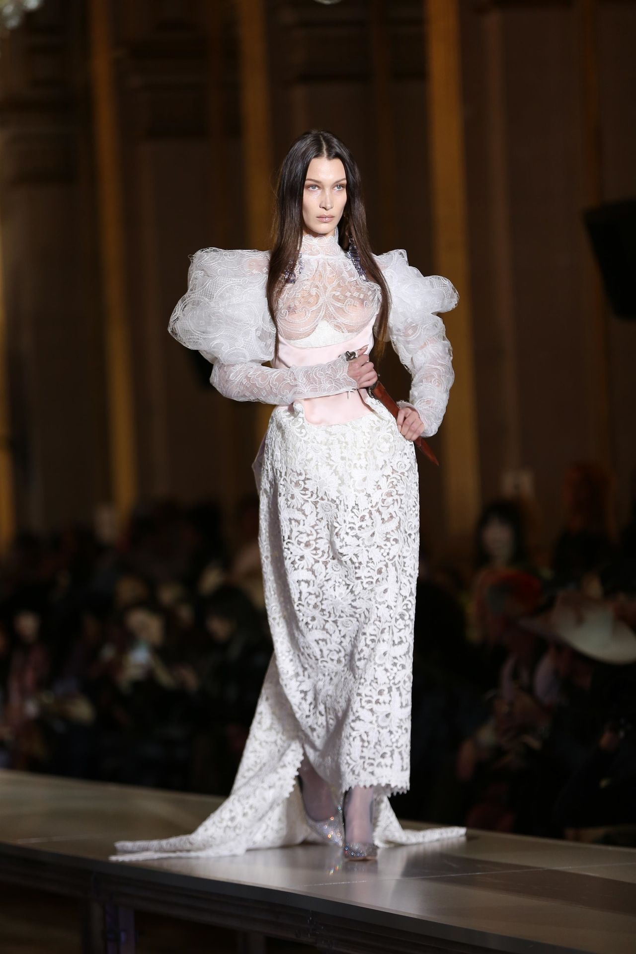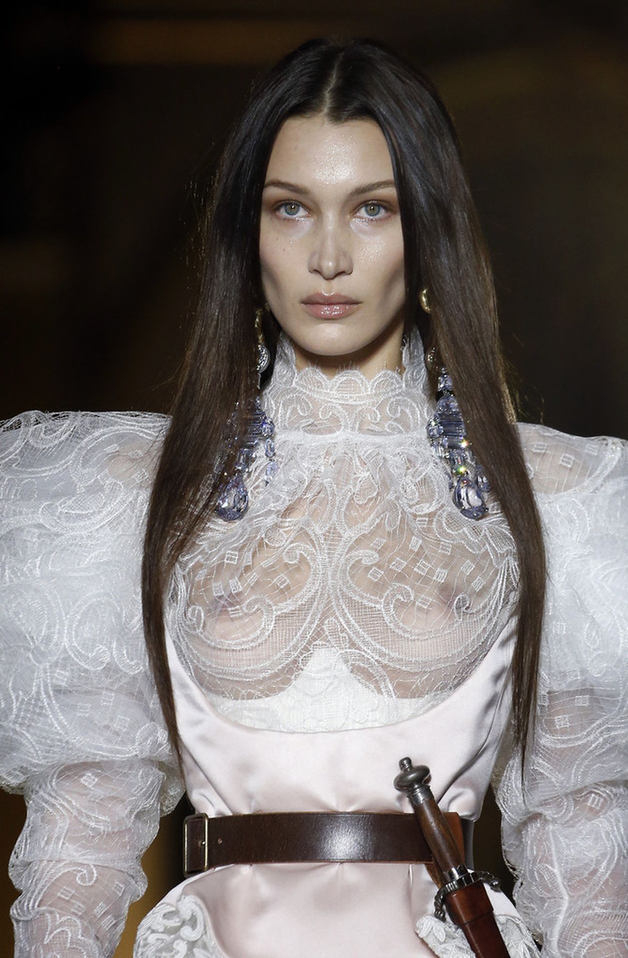 La modella Bella Hadid è stata fotografata senza reggiseno mentre sfilava alla sfilata di moda di Vivienne Westwood durante la Paris Fashion Week, 29/02/2020. Bella ti taglierà i gioielli se guardi i suoi seni!