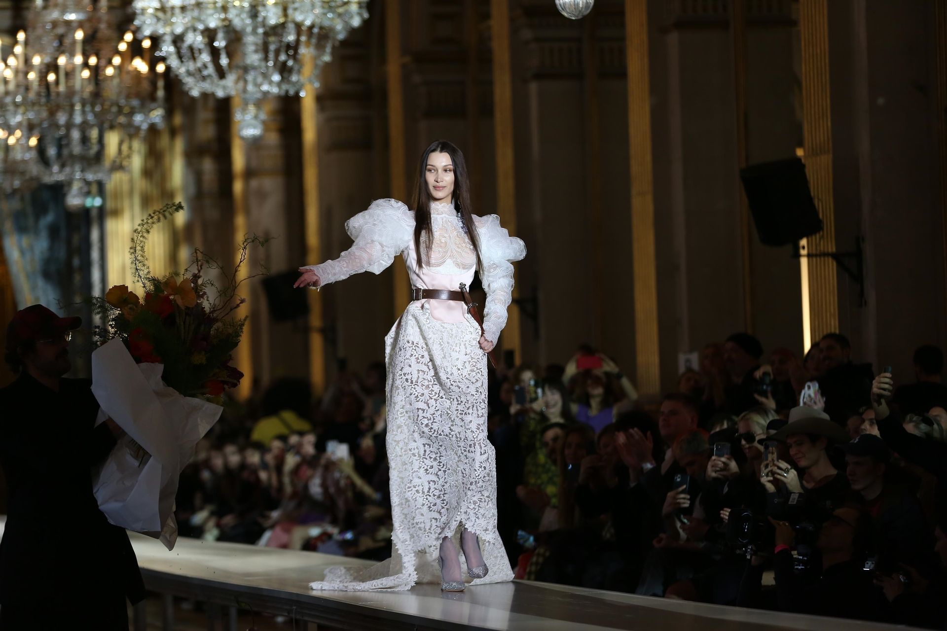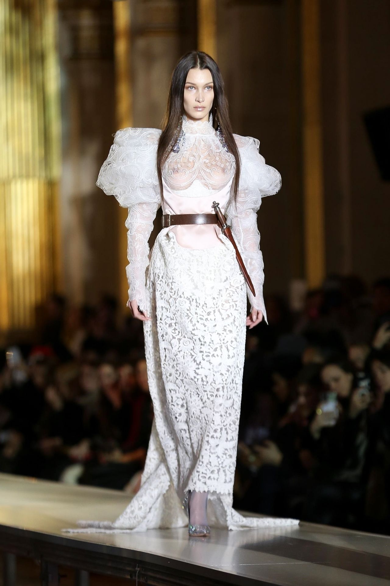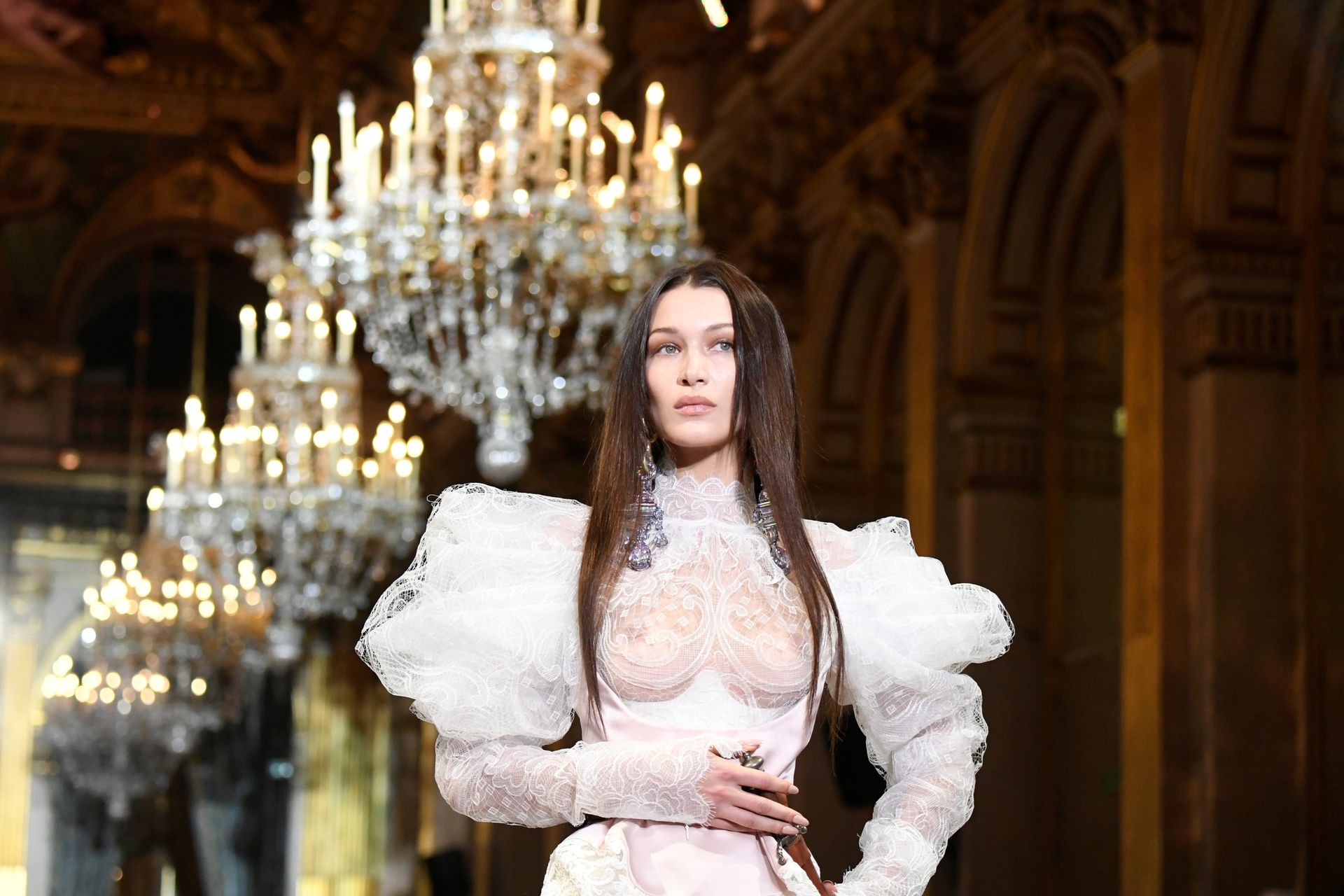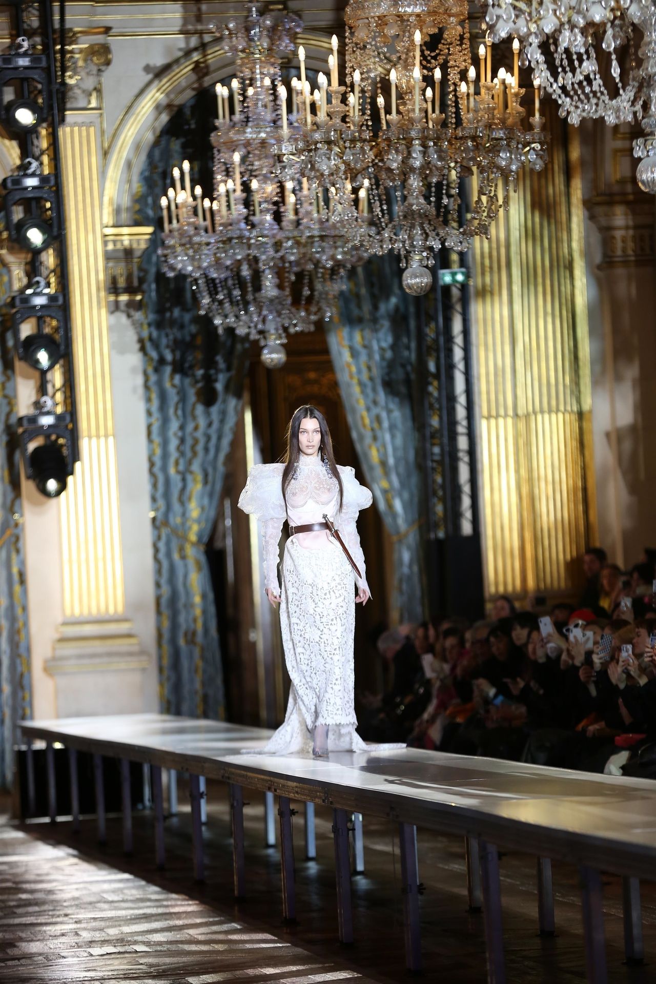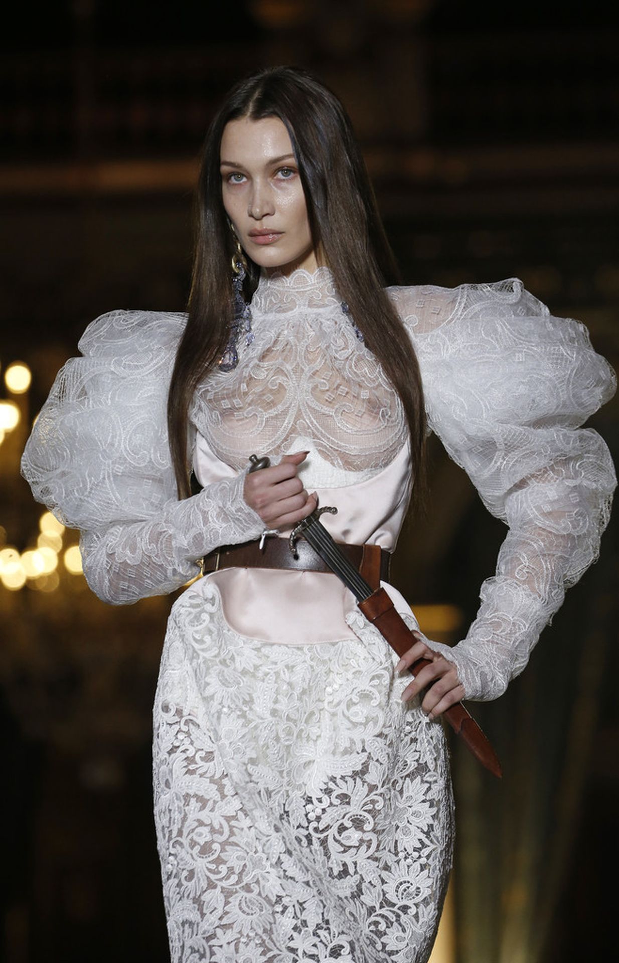 La modella Bella Hadid è stata fotografata senza reggiseno mentre sfilava alla sfilata di moda di Vivienne Westwood durante la Paris Fashion Week, 29/02/2020. Bella ti taglierà i gioielli se guardi i suoi seni!