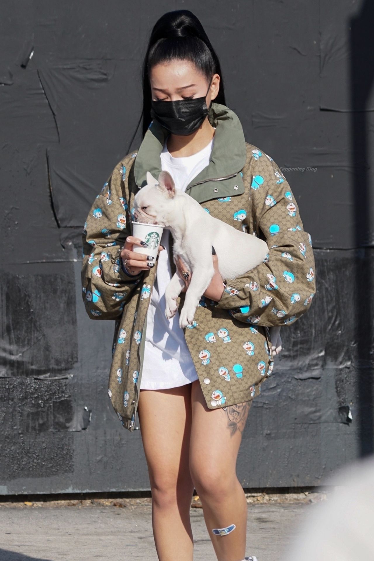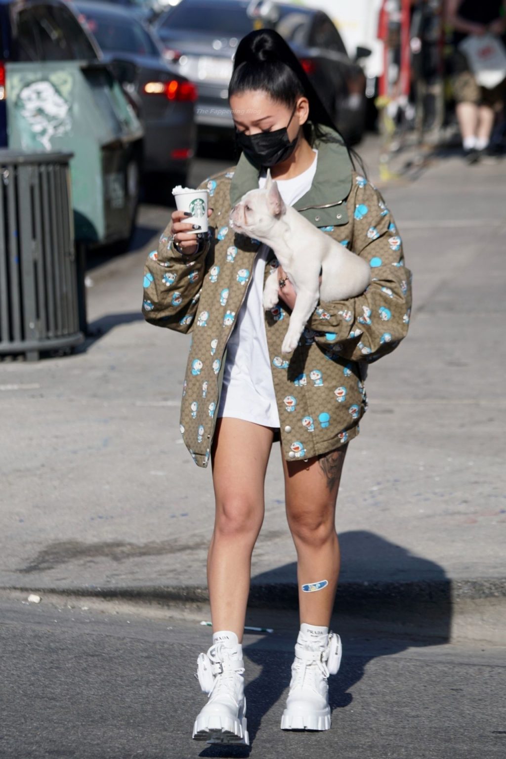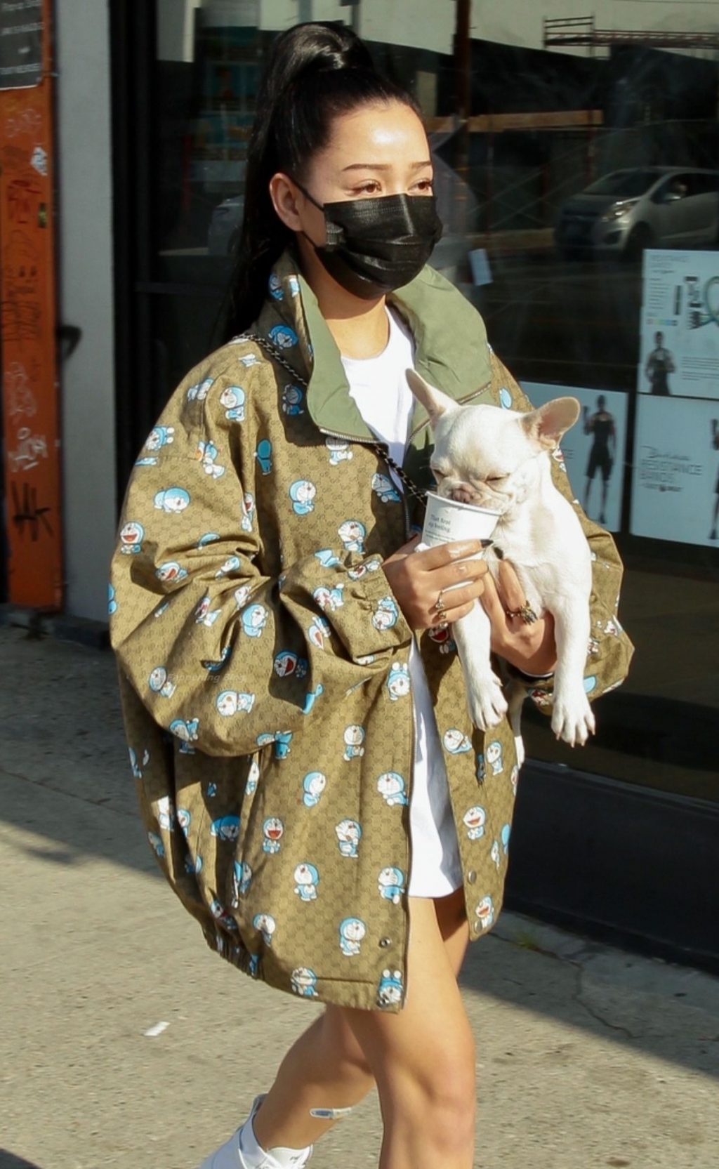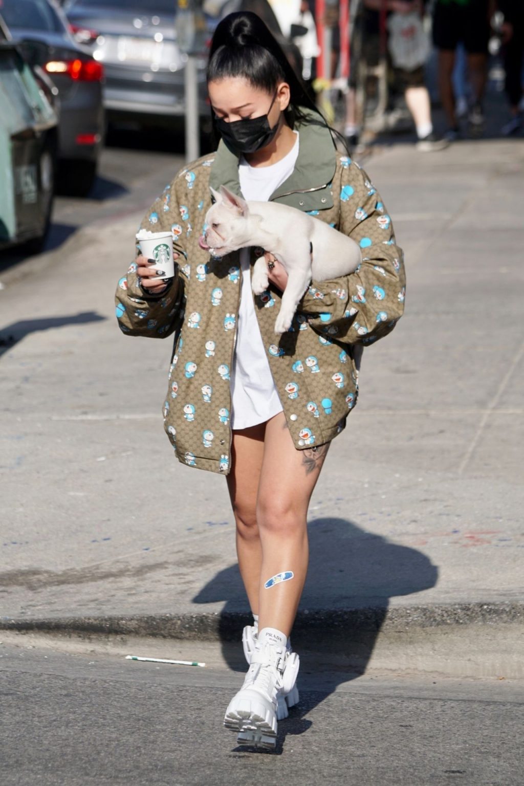 Youtuber e star di TikTok Bella Poarch è stata vista mentre dava al suo cane un po’ di panna montata da Starbucks mentre mostrava il suo senso della moda su Melrose Ave a West Hollywood, 02/05/2021.