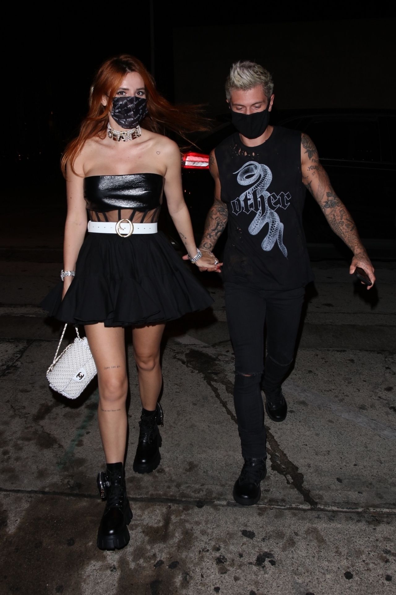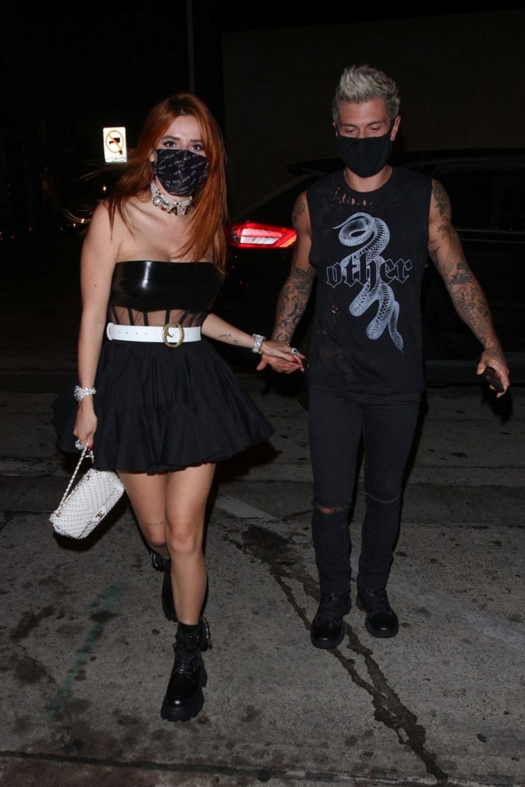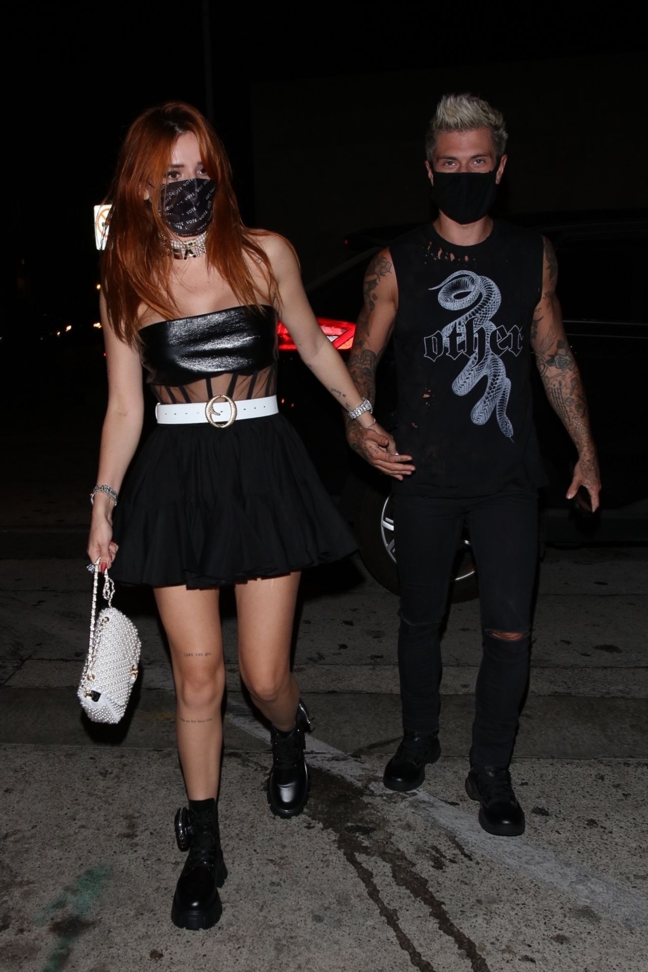 La star di The Fappening Bella Thorne e Benjamin Mascolo si dirigono a cena da Craig’s a West Hollywood, 29/09/2020. Bella indossava un abito di David Koma, una borsa e una collana Chanel e stivali Prada.