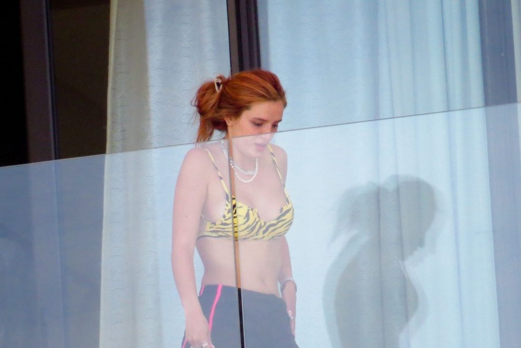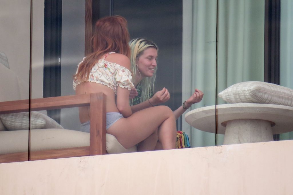 Bella Thorne e Benjamin Mascolo si rilassano sul balcone del loro hotel con amici durante una vacanza a Cabo San Lucas, Messico, 15/07/2020. Il gruppo si vede mentre si passa una sigaretta e si rilassa dopo un bagno.
