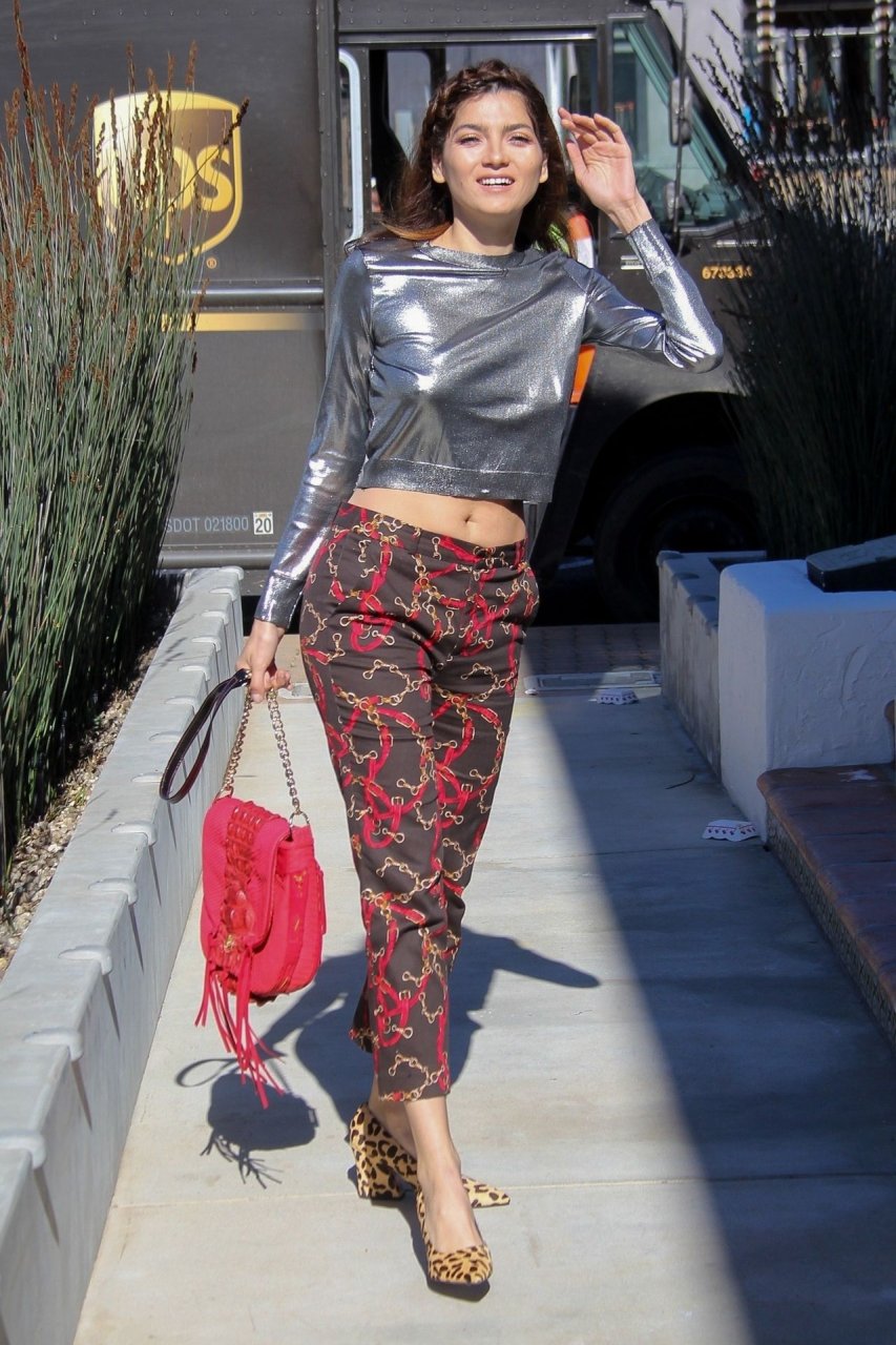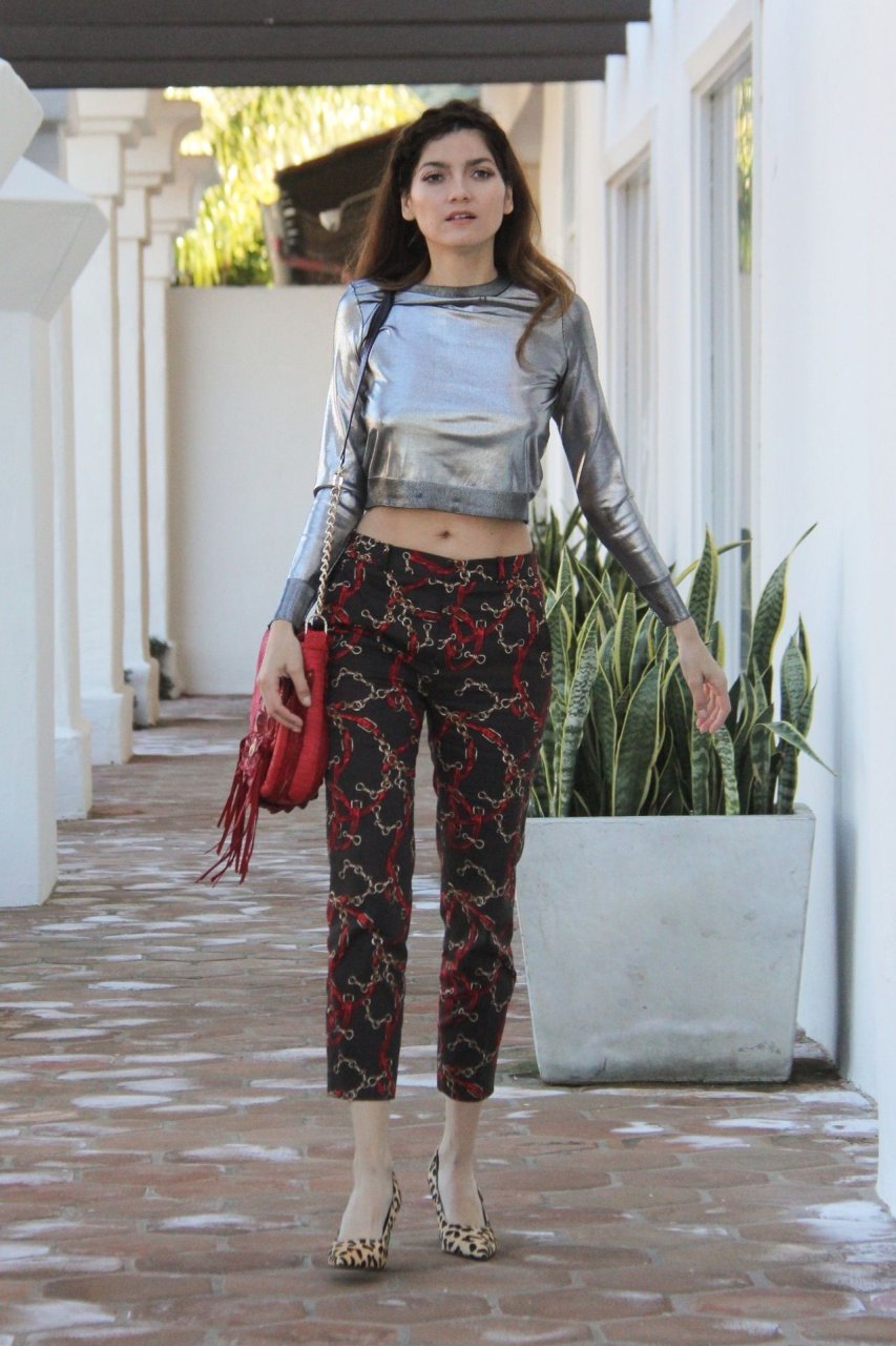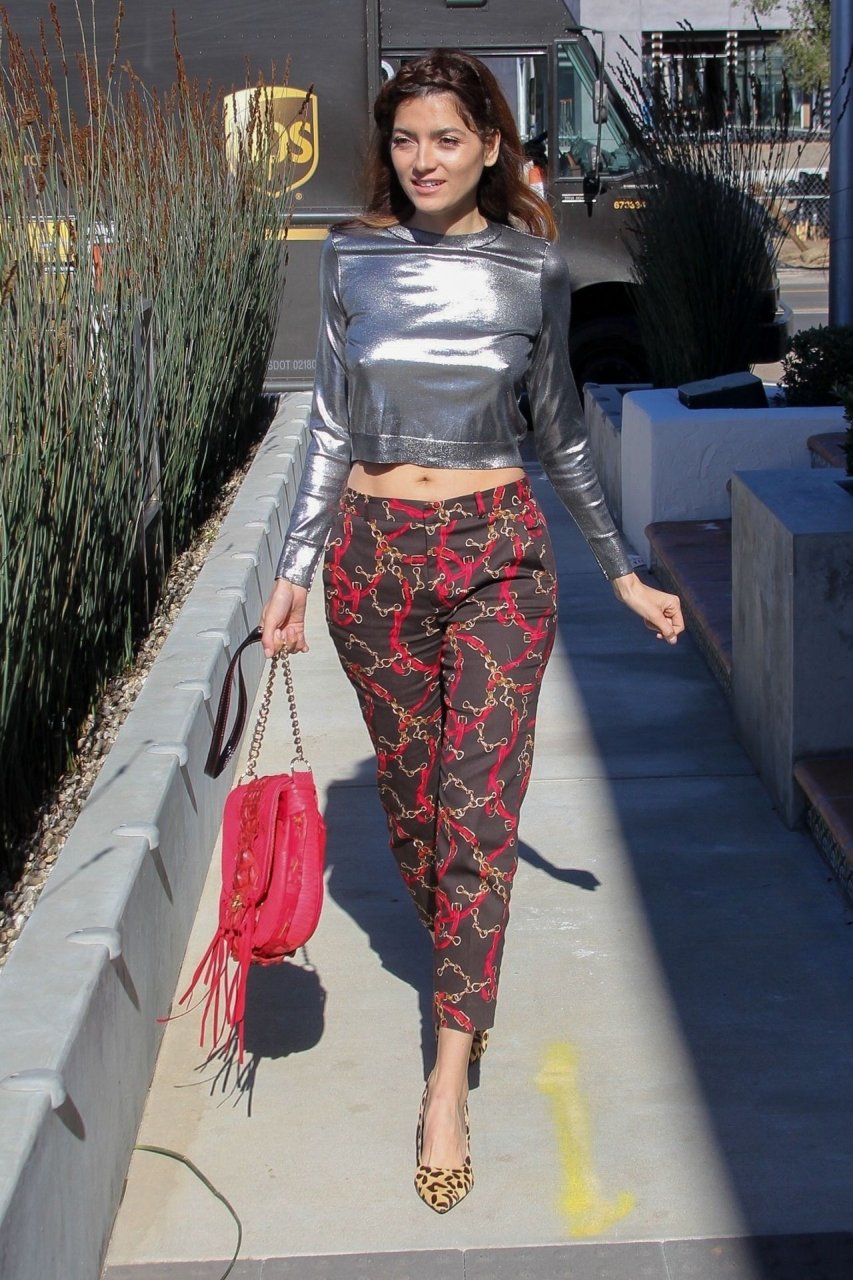 Blanca Blanco senza reggiseno indossa un top corto argento rivelatore durante una passeggiata per vetrine a Malibu, 23/01/2019. L’attrice sfila con tacchi animalier, pantaloni multicolore e un top corto in una giornata fresca a Los Angeles.