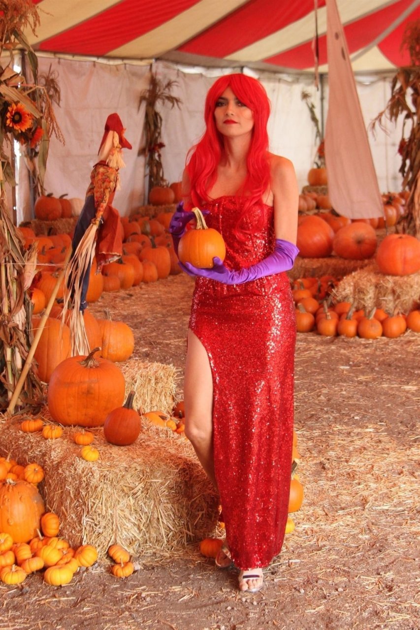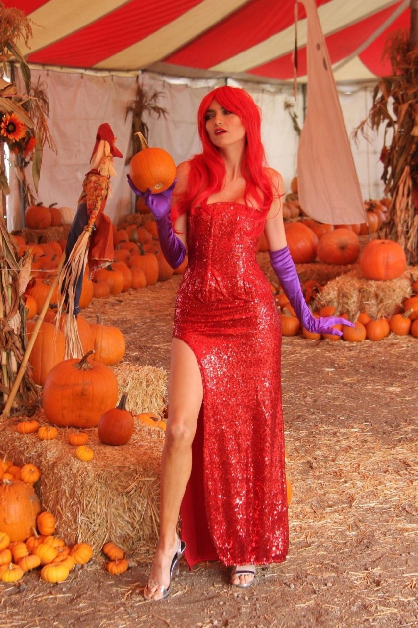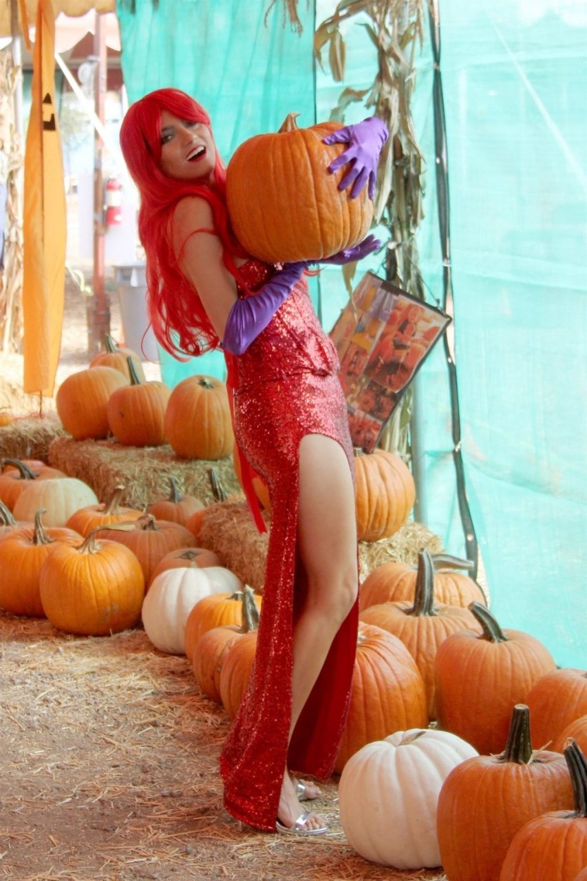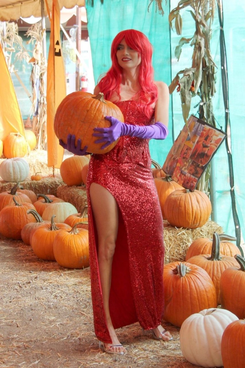L’attrice Blanca Blanco sfoggia un look sexy dirigendosi verso un campo di zucche a Los Angeles vestita da Jessica Rabbit con un lungo abito rosso e capelli rossi abbinati, 22/10/2018. Blanca si diverte a scegliere una zucca e a godersi un po’ di tempo sullo scivolo elastico.