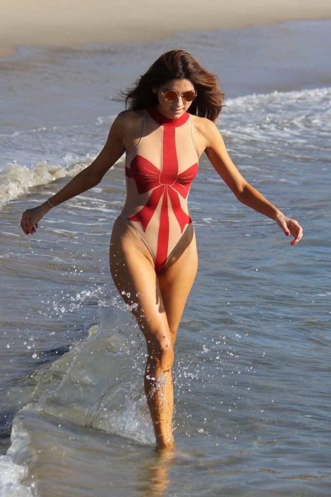 Attrice Blanca Blanco (36) si immerge nello spirito natalizio sulla spiaggia di Malibu indossando un costume da bagno trasparente con fiocco di Natale, 23/12/2017.