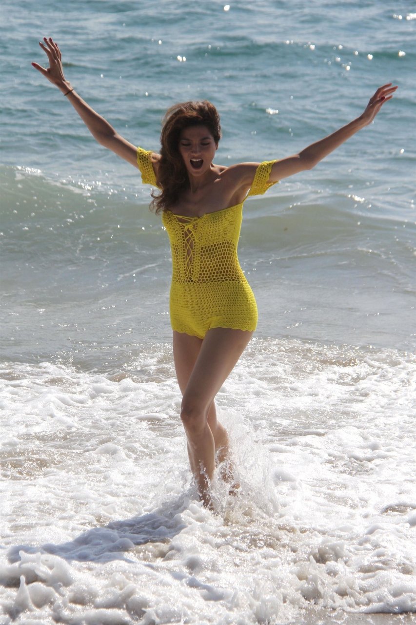 L’attrice Blanca Blanco si gode la spiaggia con un costume da bagno giallo lavorato a maglia a Malibu, 29/08/2018. Blanca ha posato per le foto e ha finto di sollevare pesanti rocce dopo aver immerso le dita dei piedi nell’oceano.