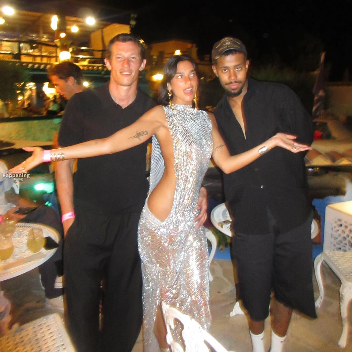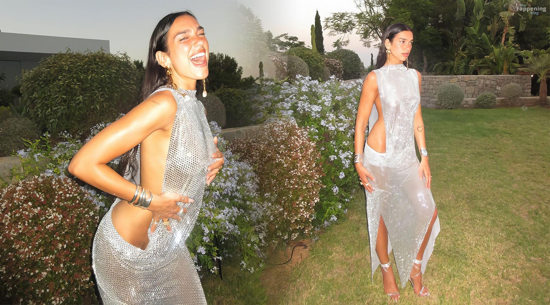 Dua Lipa posa senza reggiseno in un vestito d’argento trasparente, mettendo in mostra la sua figura snella e un po’ di sideboob.